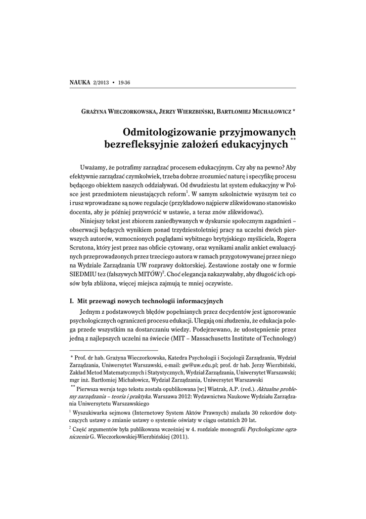 NAUKA 2/2013 • 19-36 GRAŻYNA WIECZORKOWSKA, JERZY WIERZBIŃSKI, BARTŁOMIEJ MICHAŁOWICZ * Odmitologizowanie przyjmowanych bezrefleksyjnie założeń edukacyjnych ** Uważamy, że potrafimy zarządzać procesem edukacyjnym. Czy aby na pewno? Aby efektywnie zarządzać czymkolwiek, trzeba dobrze zrozumieć naturę i specyfikę procesu będącego obiektem naszych oddziaływań. Od dwudziestu lat system edukacyjny w Polsce jest przedmiotem nieustających reform1. W samym szkolnictwie wyższym też co i rusz wprowadzane są nowe regulacje (przykładowo najpierw zlikwidowano stanowisko docenta, aby je później przywrócić w ustawie, a teraz znów zlikwidować). Niniejszy tekst jest zbiorem zaniedbywanych w dyskursie społecznym zagadnień – obserwacji będących wynikiem ponad trzydziestoletniej pracy na uczelni dwóch pierwszych autorów, wzmocnionych poglądami wybitnego brytyjskiego myśliciela, Rogera Scrutona, który jest przez nas obficie cytowany, oraz wynikami analiz ankiet ewaluacyjnych przeprowadzonych przez trzeciego autora w ramach przygotowywanej przez niego na Wydziale Zarządzania UW rozprawy doktorskiej. Zestawione zostały one w formie SIEDMIU tez (fałszywych MITÓW)2. Choć elegancja nakazywałaby, aby długość ich opisów była zbliżona, więcej miejsca zajmują te mniej oczywiste. I. Mit przewagi nowych technologii informacyjnych Jednym z podstawowych błędów popełnianych przez decydentów jest ignorowanie psychologicznych ograniczeń procesu edukacji. Ulegają oni złudzeniu, że edukacja polega przede wszystkim na dostarczaniu wiedzy. Podejrzewano, że udostępnienie przez jedną z najlepszych uczelni na świecie (MIT – Massachusetts Institute of Technology) * Prof. dr hab. Grażyna Wieczorkowska, Katedra Psychologii i Socjologii Zarządzania, Wydział Zarządzania, Uniwersytet Warszawski, e-mail: [email protected]; prof. dr hab. Jerzy Wierzbiński, Zakład Metod Matematycznych i Statystycznych, Wydział Zarządzania, Uniwersytet Warszawski; mgr inż. Bartłomiej Michałowicz, Wydział Zarządzania, Uniwersytet Warszawski ** Pierwsza wersja tego tekstu została opublikowana [w:] Wiatrak, A.P. (red.). Aktualne problemy zarządzania – teoria i praktyka. Warszawa 2012: Wydawnictwa Naukowe Wydziału Zarządzania Uniwersytetu Warszawskiego 1 Wyszukiwarka sejmowa (Internetowy System Aktów Prawnych) znalazła 30 rekordów dotyczących ustawy o zmianie ustawy o systemie oświaty w ciągu ostatnich 20 lat. 2 Część argumentów była publikowana wcześniej w 4. rozdziale monografii Psychologiczne ograniczenia G. Wieczorkowskiej-Wierzbińskiej (2011). 20 G. Wieczorkowska, J. Wierzbiński, B. Michałowicz materiałów dydaktycznych spowoduje spadek zainteresowania studiami w innych uczelniach, co jednak nie nastąpiło. Powszechna dostępność informacji na stronach WWW nie poprawiła też niestety jakości pisanych przez studentów prac. Powodem jest oczywista prawidłowość psychologiczna: im większa jest liczba dostępnych informacji, tym bardziej powierzchowne jest ich przetwarzanie, ładnie zilustrowana w wypowiedzi jednego z dziennikarzy3. Mówi się, że dzięki internetowi… współcześni wiedzą więcej i szybciej niż minione pokolenia… To prawda, liczba informacji krążących w sieci z godziny na godzinę rośnie w geometrycznym tempie, tylko, obawiam się, poznanie, jakie dzięki nim się zyskuje, jest powierzchowne. Mam wrażenie, że stałą cechą nowej świadomości jest nieuwaga. Po prostu czyta się szybko, przebiega się wzrokiem po tytułach i zajawkach, wciąż szukając tego, co przykuje, złapie, zatrzyma. Nie ma czasu na pogłębienie, na refleksję nad przeczytanym tekstem. Dotarciu do wiedzy nie towarzyszy wewnętrzny wysiłek jej zrozumienia, przemyślenia, krytycznego zgłębienia. Nie ulega wątpliwości, że nowe technologie niezmiernie zdemokratyzowały dostęp do wiedzy. Coraz częściej się zdarza, że studenci w trakcie wykładu za pomocą wyszukiwarki internetowej weryfikują informacje dostarczone przez wykładowcę. Ale ta weryfikacja dotyczy zazwyczaj tylko nagłówków – przecież w trakcie wykładu nie ma czasu na przemyślenie stwierdzonych różnic. Egzemplifikacją wpływu technologii informacyjnych jest wyparcie autorytetu przez modę, która może być traktowana jako przejaw efektu społecznej słuszności (np. Wieczorkowska-Wierzbińska, 2011). Wpływ ten pozostaje często przez nas nieuświadomiony, co dobitnie pokazują wyniki opisanego w ramce badania (Mlodinow, 2007). W badaniu wzięło udział ponad 14 tys. internautów, których poproszono o wysłuchanie i ocenienie 48 piosenek nieznanych zespołów. Następnie, jeśli zechcieli, mogli ściągnąć wybrane utwory na swój dysk. Badani byli podzieleni losowo na dziewięć grup. W ośmiu grupach badani widzieli, ile razy dany utwór został ściągnięty w danej grupie. Grupa dziewiąta nie miała takich informacji. Okazało się, że ranking popularności piosenek w poszczególnych grupach wyglądał bardzo różnie. Przykładowo piosenka będąca hitem w jednej grupie zajmowała bardzo daleką pozycję w rankingu innej grupy. Można było zaobserwować efekt lawiny – niewielka losowa przewaga jakiegoś utworu na początku powodowała lawinowy przyrost popularności. Efekt zarażania się preferencjami innych był bardzo silny. Lisicki P. (2010), Internet i zwycięstwo nieuwagi. „Rzeczpospolita”. Dostępny online 03.05.2011 na stronie: http://www.rp.pl/artykul/456228.html. 3 Odmitologizowanie przyjmowanych bezrefleksyjnie założeń edukacyjnych 21 Autorytetem stała się opinia większości – nawet odpowiedzialni za losy państwa kierują się wynikami badań opinii publicznej. Gorzej, jeśli to samo kryterium stosuje się w edukacji. Ładną ilustracją tego zjawiska może być zachowanie jednego z naszych współpracowników, który mając wątpliwości dotyczące poprawnej pisowni (łącznie vs rozdzielnie) wyrażenia „za granicą”, n