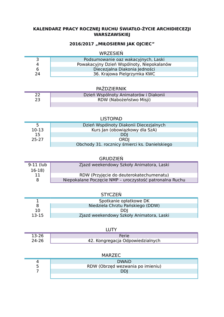 KALENDARZ PRACY ROCZNEJ RUCHU ŚWIATŁO-ŻYCIE ARCHIDIECEZJI WARSZAWSKIEJ 2016/2017 „MIŁOSIERNI JAK OJCIEC” WRZESIEŃ 3 4 6 24 Podsumowanie oaz wakacyjnych, Laski Powakacyjny Dzień Wspólnoty, Niepokalanów Diecezjalna Diakonia Jedności 36. Krajowa Pielgrzymka KWC PAŹDZIERNIK 22 23 Dzień Wspólnoty Animatorów i Diakonii RDW (Nabożeństwo Misji) LISTOPAD 5 10-13 15 25-27 Dzień Wspólnoty Diakonii Diecezjalnych Kurs Jan (obowiązkowy dla SzA) DDJ ORDJ Obchody 31. rocznicy śmierci ks. Danielskiego GRUDZIEŃ 9-11 (lub 16-18) 11 8 Zjazd weekendowy Szkoły Animatora, Laski RDW (Przyjęcie do deuterokatechumenatu) Niepokalane Poczęcie NMP – uroczystość patronalna Ruchu STYCZEŃ 1 8 10 13-15 Spotkanie opłatkowe DK Niedziela Chrztu Pańskiego (DDW) DDJ Zjazd weekendowy Szkoły Animatora, Laski LUTY 13-26 24-26 Ferie 42. Kongregacja Odpowiedzialnych MARZEC 4 5 7 DWAiD RDW (Obrzęd wezwania po imieniu) DDJ KWIECIEŃ 13-16 Triduum Paschalne MAJ 9 12-14 (lub 19-21) Kongregacja (termin do ustalenia) DDJ Zjazd Szkoły Animatora CZERWIEC 2-4 Centralna Oaza Matka Diecezjalna Oaza Matka Przedwakacyjny Dzień Wspólnoty CZERWIEC/LIPIEC - SIERPIEŃ 27.06.13.07 15-31.07 4-20.08 I turnus II turnus III turnus