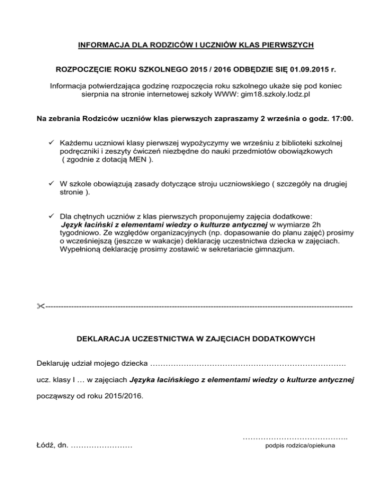 INFORMACJA DLA RODZICÓW I UCZNIÓW KLAS PIERWSZYCH ROZPOCZĘCIE ROKU SZKOLNEGO 2015 / 2016 ODBĘDZIE SIĘ 01.09.2015 r. Informacja potwierdzająca godzinę rozpoczęcia roku szkolnego ukaże się pod koniec sierpnia na stronie internetowej szkoły WWW: gim18.szkoly.lodz.pl Na zebrania Rodziców uczniów klas pierwszych zapraszamy 2 września o godz. 17:00. Każdemu uczniowi klasy pierwszej wypożyczymy we wrześniu z biblioteki szkolnej podręczniki i zeszyty ćwiczeń niezbędne do nauki przedmiotów obowiązkowych ( zgodnie z dotacją MEN ). W szkole obowiązują zasady dotyczące stroju uczniowskiego ( szczegóły na drugiej stronie ). Dla chętnych uczniów z klas pierwszych proponujemy zajęcia dodatkowe: Język łaciński z elementami wiedzy o kulturze antycznej w wymiarze 2h tygodniowo. Ze względów organizacyjnych (np. dopasowanie do planu zajęć) prosimy o wcześniejszą (jeszcze w wakacje) deklarację uczestnictwa dziecka w zajęciach. Wypełnioną deklarację prosimy zostawić w sekretariacie gimnazjum. ----------------------------------------------------------------------------------------------------------------------- DEKLARACJA UCZESTNICTWA W ZAJĘCIACH DODATKOWYCH Deklaruję udział mojego dziecka …………………………………………………………………. ucz. klasy I … w zajęciach Języka łacińskiego z elementami wiedzy o kulturze antycznej począwszy od roku 2015/2016. ………………………………….. Łódź, dn. …………………… podpis rodzica/opiekuna