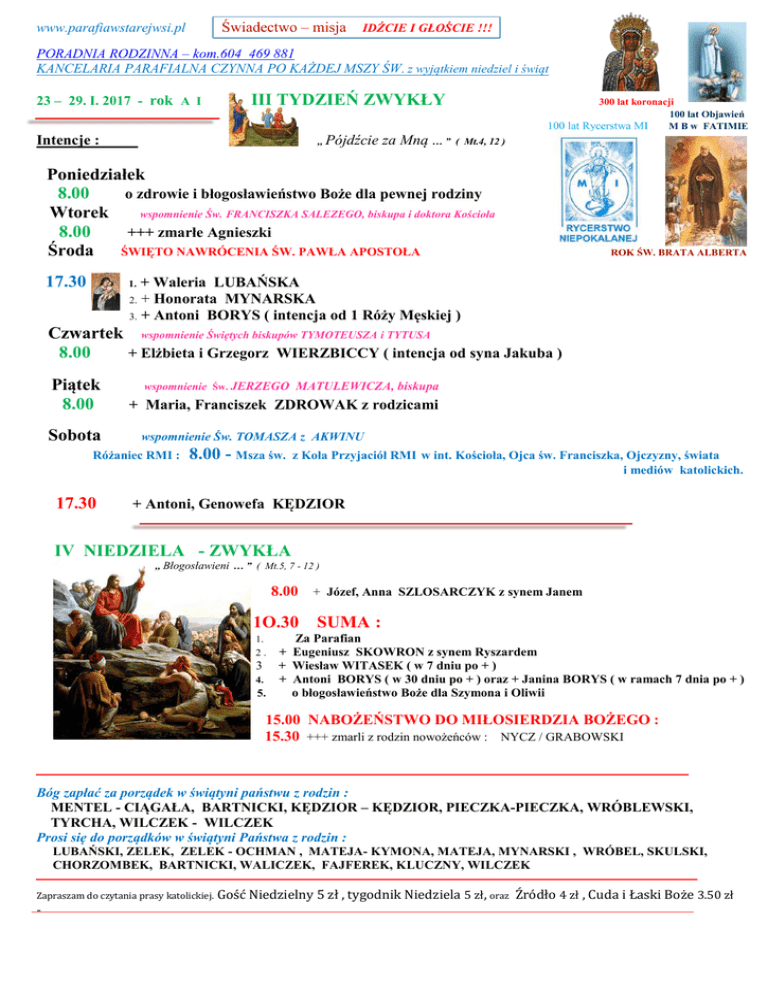 ROK Świadectwo – misja www.parafiawstarejwsi.pl IDŹCIE I GŁOŚCIE !!! PORADNIA RODZINNA – kom.604 469 881 KANCELARIA PARAFIALNA CZYNNA PO KAŻDEJ MSZY ŚW. z wyjątkiem niedziel i świąt 23 – 29. I. 2017 - rok A I III TYDZIEŃ ZWYKŁY j,, Pójdźcie za Mną … ” Intencje : 300 lat koronacji 100 lat Objawień 100 lat Rycerstwa MI M B w FATIMIE ( Mt.4, 12 ) Poniedziałek 8.00 o zdrowie i błogosławieństwo Boże dla pewnej rodziny Wtorek wspomnienie Św. FRANCISZKA SALEZEGO, biskupa i doktora Kościoła 8.00 +++ zmarłe Agnieszki Środa ŚWIĘTO NAWRÓCENIA ŚW. PAWŁA APOSTOŁA 17.30 ROK ŚW. BRATA ALBERTA + Waleria LUBAŃSKA ROK ŚW. BRATA ALBERTA 2. + Honorata MYNARSKA 3. + Antoni BORYS ( intencja od 1 Róży Męskiej ) 1. I Czwartek wspomnienie Świętych biskupów TYMOTEUSZA i TYTUSA 8.00 + Elżbieta i Grzegorz WIERZBICCY ( intencja od syna Jakuba ) Mszy św. spotka I Piątek 8.00 I Sobota . wspomnienie Św. JERZEGO MATULEWICZA, biskupa + Maria, Franciszek ZDROWAK z rodzicami wspomnienie Św. TOMASZA z AKWINU 7.30 Różaniec RMI : 17.30 8.00 - Msza św. z Koła Przyjaciół RMI w int. Kościoła, Ojca św. Franciszka, Ojczyzny, świata i mediów katolickich. + Antoni, Genowefa KĘDZIOR ŁODZ I IV NIEDZIELA - ZWYKŁA ,, Błogosławieni … ” ( Mt.5, 7 - 12 ) 8.00 1.+ Józef, Anna SZLOSARCZYK z synem Janem h 1O.30 SUMA : Za Parafian + Eugeniusz SKOWRON z synem Ryszardem 3 + Wiesław WITASEK ( w 7 dniu po + ) 4. + Antoni BORYS ( w 30 dniu po + ) oraz + Janina BORYS ( w ramach 7 dnia po + ) 5. o błogosławieństwo Boże dla Szymona i Oliwii 1. 2. 15.00 NABOŻEŃSTWO DO MIŁOSIERDZIA BOŻEGO : 15.30 +++ zmarli z rodzin nowożeńców : NYCZ / GRABOWSKI Bóg zapłać za porządek w świątyni państwu z rodzin : MENTEL - CIĄGAŁA, BARTNICKI, KĘDZIOR – KĘDZIOR, PIECZKA-PIECZKA, WRÓBLEWSKI, TYRCHA, WILCZEK - WILCZEK Prosi się do porządków w świątyni Państwa z rodzin : LUBAŃSKI, ZELEK, ZELEK - OCHMAN , MATEJA- KYMONA, MATEJA, MYNARSKI , WRÓBEL, SKULSKI, CHORZOMBEK, BARTNICKI, WALICZEK, FAJFEREK, KLUCZNY, WILCZEK Zapraszam do czytania prasy katolickiej. - Gość Niedzielny 5 zł , tygodnik Niedziela 5 zł, oraz Źródło 4 zł , Cuda i Łaski Boże 3.50 zł
