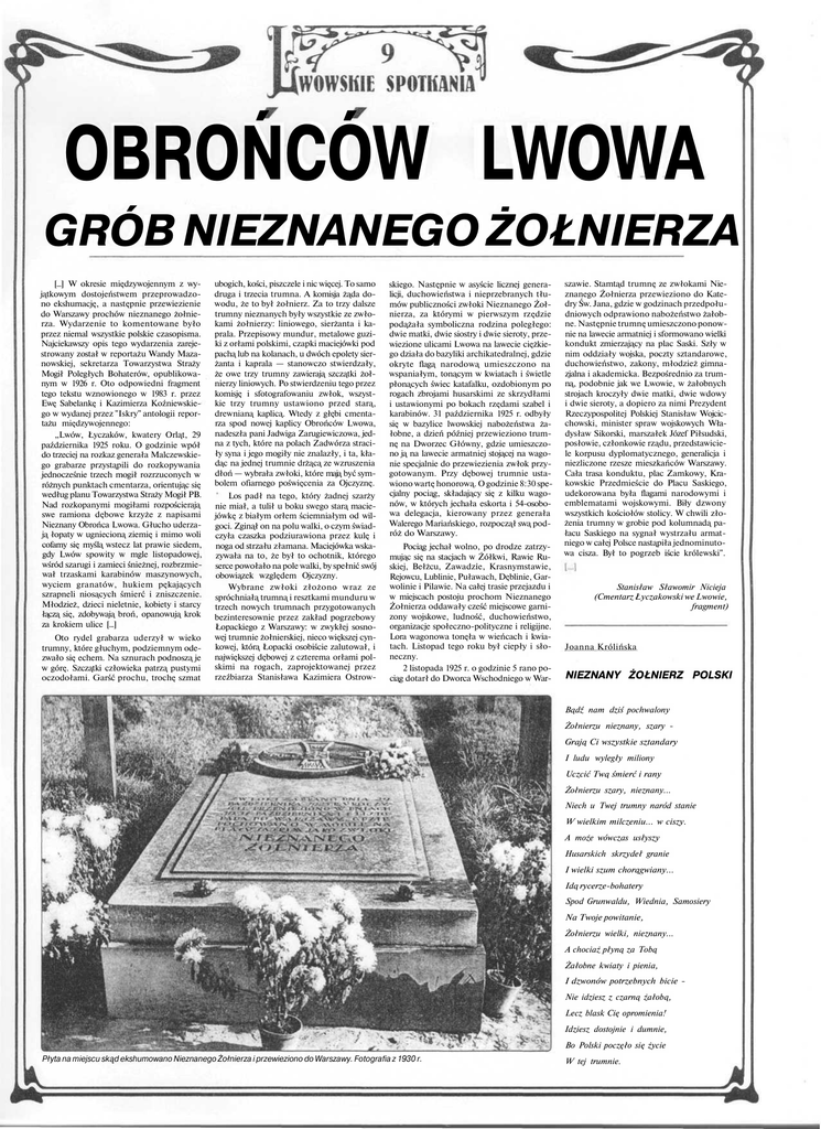 OBROŃCÓW LWOWA GRÓB NIEZNANEGO ŻOŁNIERZA [...] W okresie międzywojennym z wyjątkowym dostojeństwem przeprowadzono ekshumację, a następnie przewiezienie do Warszawy prochów nieznanego żołnierza. Wydarzenie to komentowane było przez niemal wszystkie polskie czasopisma. Najciekawszy opis tego wydarzenia zarejestrowany został w reportażu Wandy Mazanowskiej, sekretarza Towarzystwa Straży Mogił Poległych Bohaterów, opublikowanym w 1926 r. Oto odpowiedni fragment tego tekstu wznowionego w 1983 r. przez Ewę Sabelankę i Kazimierza Koźniewskiego w wydanej przez "Iskry" antologii reportażu międzywojennego: „Lwów, Łyczaków, kwatery Orląt, 29 października 1925 roku. O godzinie wpół do trzeciej na rozkaz generała Malczewskiego grabarze przystąpili do rozkopywania jednocześnie trzech mogił rozrzuconych w różnych punktach cmentarza, orientując się według planu Towarzystwa Straży Mogił PB. Nad rozkopanymi mogiłami rozpościerają swe ramiona dębowe krzyże z napisami Nieznany Obrońca Lwowa. Głucho uderzają łopaty w ugniecioną ziemię i mimo woli cofamy się myślą wstecz lat prawie siedem, gdy Lwów spowity w mgle listopadowej, wśród szarugi i zamieci śnieżnej, rozbrzmiewał trzaskami karabinów maszynowych, wyciem granatów, hukiem pękających szrapneli niosących śmierć i zniszczenie. Młodzież, dzieci nieletnie, kobiety i starcy łączą się, zdobywają broń, opanowują krok za krokiem ulice [...] Oto rydel grabarza uderzył w wieko trumny, które głuchym, podziemnym odezwało się echem. Na sznurach podnoszą je w górę. Szczątki człowieka patrzą pustymi oczodołami. Garść prochu, trochę szmat ubogich, kości, piszczele i nic więcej. To samo druga i trzecia trumna. A komisja żąda dowodu, że to był żołnierz. Za to trzy dalsze trumny nieznanych były wszystkie ze zwłokami żołnierzy: liniowego, sierżanta i kaprala. Przepisowy mundur, metalowe guziki z orłami polskimi, czapki maciejówki pod pachą lub na kolanach, u dwóch epolety sierżanta i kaprala — stanowczo stwierdzały, że owe trzy trumny zawierają szczątki żołnierzy liniowych. Po stwierdzeniu tego przez komisję i sfotografowaniu zwłok, wszystkie trzy trumny ustawiono przed starą, drewnianą kaplicą. Wtedy z głębi cmentarza spod nowej kaplicy Obrońców Lwowa, nadeszła pani Jadwiga Zarugiewiczowa, jedna z tych, które na polach Zadwórza straciły syna i jego mogiły nie znalazły, i ta, kładąc na jednej trumnie drżącą ze wzruszenia dłoń — wybrała zwłoki, które mają być symbolem ofiarnego poświęcenia za Ojczyznę. Los padł na tego, który żadnej szarży nie miał, a tulił u boku swego starą maciejówkę z białym orłem ściemniałym od wilgoci. Zginął on na polu walki, o czym świadczyła czaszka podziurawiona przez kulę i noga od strzału złamana. Maciejówka wskazywała na to, że był to ochotnik, którego serce powołało na pole walki, by spełnić swój obowiązek względem Ojczyzny. Wybrane zwłoki złożono wraz ze spróchniałą trumną i resztkami munduru w trzech nowych trumnach przygotowanych bezinteresownie przez zakład pogrzebowy Łopackiego z Warszawy: w zwykłej sosnowej trumnie żołnierskiej, nieco większej cynkowej, którą Łopacki osobiście zalutował, i największej dębowej z czterema orłami polskimi na rogach, zaprojektowanej przez rzeźbiarza Stanisława Kazimiera Ostrow- skiego. Następnie w asyście licznej generalicji, duchowieństwa i nieprzebranych tłumów publiczności zwłoki Nieznanego Żołnierza, za którymi w pierwszym rzędzie podążała symboliczna rodzina poległego: dwie matki, dwie siostry i dwie sieroty, przewiezione ulicami Lwowa na lawecie ciężkiego działa do bazyliki archikatedralnej, gdzie okryte flagą narodową umieszczono na wspaniałym, tonącym w kwiatach i świetle płonących świec katafalku, ozdobionym po rogach zbrojami husarskimi ze skrzydłami i ustawionymi po bokach rzędami szabel i karabinów. 31 października 1925 r. odbyły się w bazylice lwowskiej nabożeństwa żałobne, a dzień później przewieziono trumnę na Dworzec Główny, gdzie umieszczono ją na lawecie armatniej stojącej na wagonie specjalnie do przewiezienia zwłok przygotowanym. Przy dębowej trumnie ustawiono wartę honorową. O godzinie 8:30 specjalny pociąg, składający się z kilku wagonów, w których jechała eskorta i 54-osobowa delegacja, kierowany przez generała Walerego Mariańskiego, rozpoczął swą podróż do Warszawy. Pociąg jechał wolno, po drodze zatrzymując się na stacjach w Żółkwi, Rawie Ruskiej, Bełżcu, Zawadzie, Krasnymstawie, Rejowcu, Lublinie, Puławach, Dęblinie, Garwolinie i Pilawie. Na całej trasie przejazdu i w miejscach postoju prochom Nieznanego Żołnierza oddawały cześć miejscowe garnizony wojskowe, ludność, duchowieństwo, organizacje społeczno-polityczne i religijne. Lora wagonowa tonęła w wieńcach i kwiatach. Listopad tego roku był ciepły i słoneczny. 2 listopada 1925 r. o godzinie 5 rano pociąg dotarł do Dworca Wschodniego w War- szawie. Stamtąd trumnę ze zwłokami Nieznanego Żołnierza przewieziono do Katedry Św. Jana, gdzie w godzinach przedpołudniowych odprawiono nabożeństwo żałobne. Następnie trumnę umieszczono ponownie na lawecie armatniej i sformowano wielki kondukt zmierzający na plac Saski. Szły w nim oddziały wojska, poczty sztandarowe, duchowieństwo, zakony, młodzież gimnazjalna i akademicka. Bezpośrednio za trumną, podobnie jak we Lwowie, w żałobnych strojach kroczyły dwie matki, dwie wdowy i dwie sieroty, a dopiero za nimi Prezydent Rzeczypospolitej Polskiej Stanisław Wojcicchowski, minister spraw wojskowych Władysław Sikorski, marszałek Józef Piłsudski, posłowie, członkowie rządu, przedstawiciele korpusu dyplomatycznego, generalicja i niezliczone rzesze mieszkańców Warszawy. Cała trasa konduktu, plac Zamkowy, Krakowskie Przedmieście do Placu Saskiego, udekorowana była flagami nar