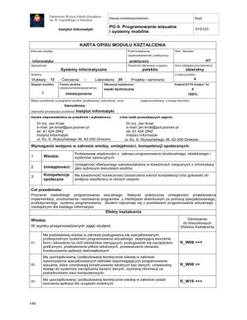 Państwowa Wyższa Szkoła Zawodowa im. H. Cegielskiego w Gnieźnie Instytut Informatyki Nazwa modułu/przedmiotu Kod PO 9. Programowanie wizualne i systemy mobilne XYZ123 KARTA OPISU MODUŁU KSZTAŁCENIA Kierunek studiów Profil kształcenia Rok / Semestr (ogólnoakademicki, praktyczny) Informatyka 4/7 praktyczny Specjalność Przedmiot oferowany w języku: Systemy informatyczne polskim Godziny Kurs (obligatoryjny/obieralny) obieralny Liczba punktów Wykłady: 12 Stopień studiów: Ćwiczenia: - Laboratoria: 20 Forma studiów (stacjonarna/niestacjonarna) I Obszar(y) kształcenia Podział ECTS (liczba i %) nauki techniczne 4 100% niestacjonarne Status przedmiotu w programie studiów (podstawowy, kierunkowy, inny) Liczba punktów 4 Projekty / seminaria: (ogólnouczelniany, z innego kierunku) kierunkowy Jednostka prowadząca przedmiot: Instytut Informatyki Osoba odpowiedzialna za przedmiot / wykładowca: Dr inż. Jan Kniat e-mail: [email protected] tel. 61 424 2942 Instytut Informatyki ul. Ks. S. Wyszyńskiego 36, 62-200 Gniezno xx xxx Lista osób prowadzących zajęcia: Dr inż. Jan Kniat e-mail: [email protected] tel. 61 424 2942 Instytut Informatyki ul. Ks. S. Wyszyńskiego 36, 62-200 Gniezno Wymagania wstępne w zakresie wiedzy, umiejętności, kompetencji społecznych: Podstawowe wiadomości z zakresu programowania strukturalnego, obiektowego i systemów operacyjnych 1 Wiedza: 2 Umiejętności: jako wybranym kierunkiem studiów 3 Kompetencje społeczne Umiejętność efektywnego samokształcenia w dziedzinach związanych z informatyką Ma świadomość konieczności poszerzania swoich kompetencji oraz gotowość do podjęcia współpracy w ramach zespołu Cel przedmiotu: Poznanie metodologii programowania wizualnego. Nabycie praktycznej umiejętności projektowania implementacji, uruchomienia i testowania programów z interfejsem okienkowym za pomocą specjalizowanego, profesjonalnego systemu programowania. Student zapoznaje się z podstawami programowania wizualnego niezbędnymi dla każdego informatyka. Efekty kształcenia Wiedza. W wyniku przeprowadzonych zajęć student: Odniesienie do Kierunkowych Efektów Kształcenia 01 Ma podstawową wiedzę w zakresie posługiwania się specjalizowanym, profesjonalnym systemem programowania wizualnego, obejmującą tworzenie form i lokowanie na nich elementów sterujących, posługiwanie się narzędziami graficznymi, przetwarzanie plików tekstowych, przetwarzanie obrazów, konstruowanie aplikacji wielowątkowych K_W08 +++ 02 Ma uporządkowaną i podbudowaną teoretycznie wiedzę w zakresie wykorzystania specjalizowanych bibliotek wspomagających programowanie wizualne, które umożliwiają konstruowanie lokalnych baz danych, uniwersalny dostęp do systemów zarządzania bazami danych, wymianę informacji za pośrednictwem sieci komputerowych. K_W08 ++ 03 Ma uporządkowaną i podbudowaną teoretycznie wiedzę w zakresie zasad tworzenia aplikacji dla urządzeń mobilnych K_W18 +++ 149 Praca Umiejętności. W wyniku przeprowadzonych zajęć student będzie potrafił: Stosować wiedzę z zakresu programowania wizualnego do implementowania aplikacji o interfejsie okienkowym za pomocą profesjonalnego systemu programowania 01 Stosować wiedzę z zakresu programowania wizualnego do implementowania aplikacji współpracujących z systemami zarządzania bazą danych i współpracujących z innymi aplikacjami za pośrednictwem sieci komputerowej Stosować wiedzę z zakresu technik programowania wizualnego do uruchamiania i testowania aplikacji przeznaczonych dla urządzeń mobilnych 02 03 Kompetencje społeczne. W wyniku przeprowadzonych zajęć student zdobędzie następujące kompetencje: Odniesienie do Kierunkowych Efektów Kształcenia K_U13 ++ K_U14 ++ K_U09 ++ K_U21 ++ K_U15 ++ Odniesienie do Kierunkowych Efektów Kształcenia 01 Rozumie potrzebę permanentnego kształcenia się i przekazywania w sposób zrozumiały informacji z najbliższym otoczeniem w działalności zawodowej. K_K01 + 02 Rozumie pozatechniczne ( w tym ekologiczne) skutki swojego działania i jego wpływu na środowisko, szczególnie w zakresie odpowiedzialności za wytworzony produkt programistyczny K_K02 + K_K04 + Sposoby sprawdzenia efektów kształcenia Wykład ocenianie ciągłe na każdych zajęciach (premiowanie aktywności i jakości percepcji). Ćwiczenia: sprawdziany weryfikujące opanowanie wiedzy z zakresu metodologii programowania obiektowego i składni języka programowania C# sprawdziany weryfikujące przyrost umiejętności implementowania aplikacji okienkowych za pomocą profesjonalnego systemu programowania sprawdziany weryfikujące przyrost umiejętności implementowania aplikacji współpracujących z systemami zarządzania bazą danych i współpracujących z innymi aplikacjami za pośrednictwem sieci komputerowej ocenianie ciągłe, na każdych zajęciach - premiowanie przyrostu umiejętności posługiwania się poznanymi zasadami i metodami; Uzyskiwanie punktów dodatkowych za aktywność podczas zajęć, a szczególnie za: samodzielne rozszerzenie zakresu wiedzy dotyczącej programowania wizualnego efektywność zastosowania zdobytej wiedzy podczas rozwiązywania zadanego problemu; uwagi związane z udoskonaleniem materiałów dydaktycznych; wskazywanie trudności percepcyjnych umożliwiające bieżące doskonalenia procesu dydaktycznego. Treści programowe Platforma .NET: wspólne środowisko wykonawcze, wspólny system typów, wspólna specyfikacja języka, wspólny kod pośredni, translacja w locie. Języki programowania, kompilatory, zintegrowany system programowania Visual Studio.NET. Biblioteka WindowsForms, forma główna, pasek menu, pasek narzędzi, pasek statusu. Osadzanie elementów sterujących i definiowanie obsługi generowanych przez nie zdarzeń. Okna dialogowe. Biblioteka Windows Presentation Forms. Programowanie współbieżne, aplikacje wielowątkowe. Biblioteka graficzna GDI+. Biblioteka ADO.NET - korzystanie z lokalnych i zewnętrz