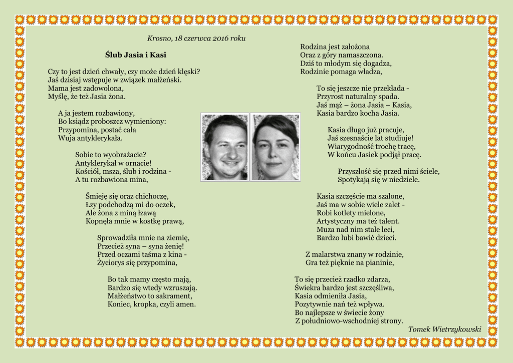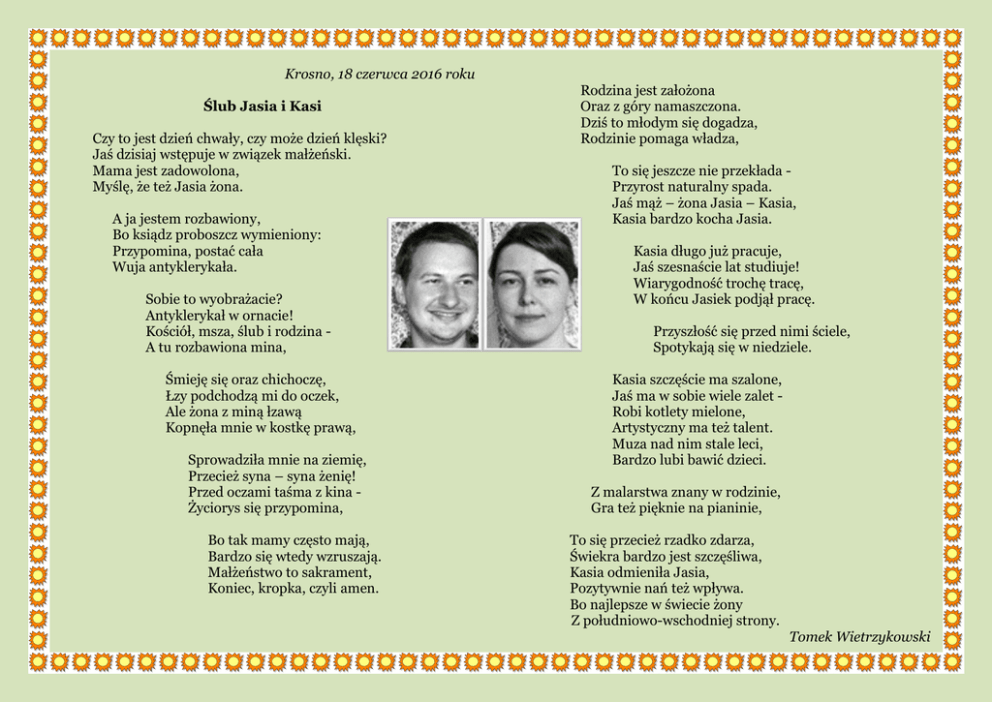 Krosno, 18 czerwca 2016 roku Ślub Jasia i Kasi Czy to jest dzień chwały, czy może dzień klęski? Jaś dzisiaj wstępuje w związek małżeński. Mama jest zadowolona, Myślę, że też Jasia żona. A ja jestem rozbawiony, Bo ksiądz proboszcz wymieniony: Przypomina, postać cała Wuja antyklerykała. Sobie to wyobrażacie? Antyklerykał w ornacie! Kościół, msza, ślub i rodzina A tu rozbawiona mina, Śmieję się oraz chichoczę, Łzy podchodzą mi do oczek, Ale żona z miną łzawą Kopnęła mnie w kostkę prawą, Sprowadziła mnie na ziemię, Przecież syna – syna żenię! Przed oczami taśma z kina Życiorys się przypomina, Bo tak mamy często mają, Bardzo się wtedy wzruszają. Małżeństwo to sakrament, Koniec, kropka, czyli amen. Rodzina jest założona Oraz z góry namaszczona. Dziś to młodym się dogadza, Rodzinie pomaga władza, To się jeszcze nie przekłada Przyrost naturalny spada. Jaś mąż – żona Jasia – Kasia, Kasia bardzo kocha Jasia. Kasia długo już pracuje, Jaś szesnaście lat studiuje! Wiarygodność trochę tracę, W końcu Jasiek podjął pracę. Przyszłość się przed nimi ściele, Spotykają się w niedziele. Kasia szczęście ma szalone, Jaś ma w sobie wiele zalet Robi kotlety mielone, Artystyczny ma też talent. Muza nad nim stale leci, Bardzo lubi bawić dzieci. Z malarstwa znany w rodzinie, Gra też pięknie na pianinie, To się przecież rzadko zdarza, Świekra bardzo jest szczęśliwa, Kasia odmieniła Jasia, Pozytywnie nań też wpływa. Bo najlepsze w świecie żony Z południowo-wschodniej strony. Tomek Wietrzykowski