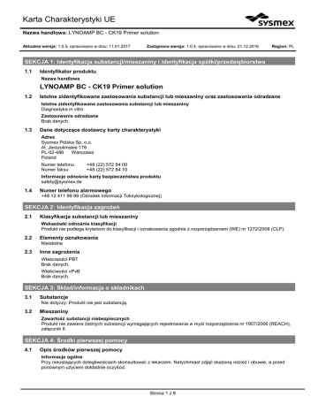 Karta Charakterystyki UE Nazwa handlowa: LYNOAMP BC - CK19 Primer solution Aktualna wersja: 1.0.5, opracowano w dniu: 11.01.2017 Zastąpiona wersja: 1.0.4, opracowano w dniu: 21.12.2016 Region: PL SEKCJA 1: Identyfikacja substancji/mieszaniny i identyfikacja spółki/przedsiębiorstwa 1.1 Identyfikator produktu Nazwa handlowa LYNOAMP BC - CK19 Primer solution 1.2 Istotne zidentyfikowane zastosowania substancji lub mieszaniny oraz zastosowania odradzane Istotne zidentyfikowane zastosowania substancji lub mieszaniny Diagnostyka in vitro Zastosowania odradzane Brak danych. 1.3 Dane dotyczące dostawcy karty charakterystyki Adres Sysmex Polska Sp. o.o. Al. Jerozolimskie 176 PL-02-486 Warszawa Poland Numer telefonu Numer faksu +48 (22) 572 84 00 +48 (22) 572 84 10 Informacje odnośnie karty bezpieczeństwa produktu [email protected] 1.4 Numer telefonu alarmowego +48 12 411 99 99 (Ośrodek Informacji Toksykologicznej) SEKCJA 2: Identyfikacja zagrożeń 2.1 Klasyfikacja substancji lub mieszaniny Wskazówki odnośnie klasyfikacji Produkt nie podlega kryteriom do klasyfikacji i oznakowania zgodnie z rozporządzeniem (WE) nr 1272/2008 (CLP). 2.2 Elementy oznakowania Nieistotne 2.3 Inne zagrożenia Właściwości PBT Brak danych. Właściwości vPvB Brak danych. SEKCJA 3: Skład/informacja o składnikach 3.1 Substancje Nie dotyczy. Produkt nie jest substancją. 3.2 Mieszaniny Zawartość substancji niebezpiecznych Produkt nie zawiera żadnych substancji wymagających rejestrowania w myśl rozporządzenia nr 1907/2006 (REACH), załącznik II. SEKCJA 4: Środki pierwszej pomocy 4.1 Opis środków pierwszej pomocy Informacje ogólne Przy nieustających dolegliwościach skonsultować z lekarzem. Natychmiast zdjąć skażoną odzież i obuwie, a przed ponownym użyciem dokładnie oczyścić. Strona 1 z 8 Karta Charakterystyki UE Nazwa handlowa: LYNOAMP BC - CK19 Primer solution Aktualna wersja: 1.0.5, opracowano w dniu: 11.01.2017 Zastąpiona wersja: 1.0.4, opracowano w dniu: 21.12.2016 Region: PL Po wdychaniu Wyprowadzić osobę poszkodowaną z rejonu narażenia. Zadbać o dopływ świeżego powietrza. Kontakt ze skórą Skórę natychmiast przemyć wodą z mydłem. Kontakt z oczami Rozszerzyć powieki, dokładnie przemyć oczy wodą (15 min.). Po połknięciu Natychmiast skonsultować z lekarzem. Nie wywoływać wymiotów. Nie wolno podawać nic doustnie nieprzytomnym osobom. 4.2 Najważniejsze ostre i opóźnione objawy oraz skutki narażenia Brak danych. 4.3 Wskazania dotyczące wszelkiej natychmiastowej pomocy lekarskiej i szczególnego postępowania z poszkodowanym Brak danych. SEKCJA 5: Postępowanie w przypadku pożaru 5.1 Środki gaśnicze Odpowiednie środki gaśnicze Piana; Proszek; Dwutlenek węgla; Rozpylony strumień wody Nieodpowiednie środki gaśnicze Pełny strumień wodny 5.2 Szczególne zagrożenia związane z substancją lub mieszaniną Podczas pożaru może nastąpić wydzielenie: Dwutlenek węgla (CO2); Tlenek węgla (CO); Tlenki siarki; Tlenki azotu (NOx) 5.3 Informacje dla straży pożarnej Stosować maski gazowe z oddzielnym obiegiem powietrza. Należy stosować ubranie ochronne. SEKCJA 6: Postępowanie w przypadku niezamierzonego uwolnienia do środowiska 6.1 Indywidualne środki ostrożności, sprzęt ochronny i procedury w sytuacjach awaryjnych Dla osób nienależących do personelu udzielającego pomocy Należy przestrzegać przepisy ochronne (patrz rozdział 7 i 8). Zapewnić wystarczającą wentylację. Wykluczyć kontakt ze skórą, ogniem i odzieżą ochronną; Nie wdychać oparów. Nie przechowywać w pobliżu źródeł ognia. Dla osób udzielających pomocy Brak danych. Indywidualne wyposażenie ochronne - patrz rozdział 8. 6.2 Środki ostrożności w zakresie ochrony środowiska Nie dopuścić do przeniknięcia do kanalizacji /wód powierzchniowych /wód gruntowych. Nie dopuścić do przedostania się do podłoża /ziemi. 6.3 Metody i materiały zapobiegające rozprzestrzenianiu się skażenia i służące do usuwania skażenia Zastosować materiał absorbujący (np. piasek, ziemię okrzemkową, uniwersalny środek wiążący). Zebrany materiał traktować zgodnie z ustępem "Usunięcie". 6.4 Odniesienia do innych sekcji Brak danych. SEKCJA 7: Postępowanie z substancjami i mieszaninami oraz ich magazynowanie 7.1 Środki ostrożności dotyczące bezpiecznego postępowania Wskazówki dotyczące bezpiecznego użytkowania Należy ograniczyć do minimum ryzyko przy obchodzeniu się z produktem przez zastosowanie zabiegów ochronnych i zapobiegawczych. Proces technologiczny powinien, na ile pozwala to stan techniki, przebiegać w taki sposób, aby nie powstawały niebezpieczne substancje lub wykluczony był kontakt ze skórą. Strona 2 z 8 Karta Charakterystyki UE Nazwa handlowa: LYNOAMP BC - CK19 Primer solution Aktualna wersja: 1.0.5, opracowano w dniu: 11.01.2017 Zastąpiona wersja: 1.0.4, opracowano w dniu: 21.12.2016 Region: PL Ogólne środki bezpieczeństwa i higieny Podczas pracy nie palić, nie jeść i nie pić. Trzymać z daleka od napojów, żywności i paszy. Po zakończeniu pracy i przed przerwami w pracy umyć ręce i twarz. Nie wdychać oparów. Unikać kontaktu z oczami i skórą. Zabrudzone, nasiąknięte ubranie natychmiast zdjąć. Zapewnić prysznic awaryjny. Wskazówki dotyczące zabezpieczenia przed pożarem i eksplozją Trzymać z dala od źródeł ciepła i zapłonu. Pary mogą tworzyć mieszaniny wybuchowe z powietrzem. 7.2 Warunki bezpiecznego magazynowania, w tym informacje dotyczące wszelkich wzajemnych niezgodności Środki techniczne i warunki przechowywania Przechowywać pojemnik szczelnie zamknięty w chłodnym i dobrze wentylowanym miejscu. Polecona temperatura magazynowania Wartość maks. -20 °C Wymagania dla magazynów i pojemników Otwarte pojemniki dokładnie zamknąć i składować w pozycji stojącej, aby uniknąć jakiegokolwiek wycieku. Wskazówki dotyczące sposobu przechowywania Nie przechowywać razem z: utleniaczami; Zasad