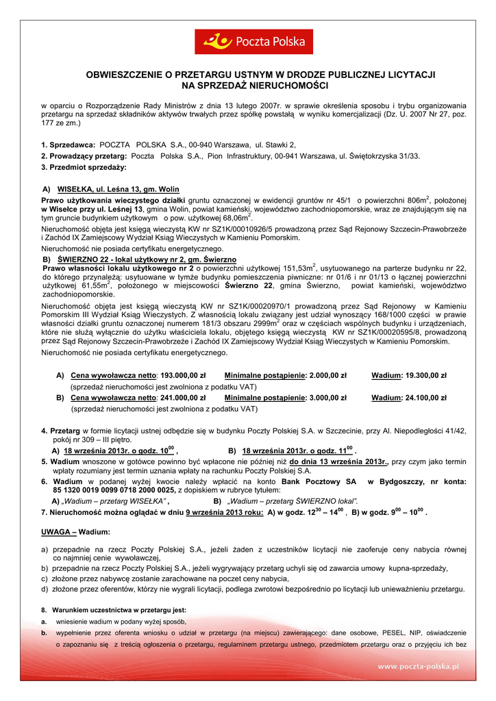 OBWIESZCZENIE O PRZETARGU USTNYM W DRODZE PUBLICZNEJ LICYTACJI NA SPRZEDAŻ NIERUCHOMOŚCI w oparciu o Rozporządzenie Rady Ministrów z dnia 13 lutego 2007r. w sprawie określenia sposobu i trybu organizowania przetargu na sprzedaż składników aktywów trwałych przez spółkę powstałą w wyniku komercjalizacji (Dz. U. 2007 Nr 27, poz. 177 ze zm.) 1. Sprzedawca: POCZTA POLSKA S.A., 00-940 Warszawa, ul. Stawki 2, 2. Prowadzący przetarg: Poczta Polska S.A., Pion Infrastruktury, 00-941 Warszawa, ul. Świętokrzyska 31/33. 3. Przedmiot sprzedaży: A) WISEŁKA, ul. Leśna 13, gm. Wolin 2 Prawo użytkowania wieczystego działki gruntu oznaczonej w ewidencji gruntów nr 45/1 o powierzchni 806m , położonej w Wisełce przy ul. Leśnej 13, gmina Wolin, powiat kamieński, województwo zachodniopomorskie, wraz ze znajdującym się na 2 tym gruncie budynkiem użytkowym o pow. użytkowej 68,06m . Nieruchomość objęta jest księgą wieczystą KW nr SZ1K/00010926/5 prowadzoną przez Sąd Rejonowy Szczecin-Prawobrzeże i Zachód IX Zamiejscowy Wydział Ksiąg Wieczystych w Kamieniu Pomorskim. Nieruchomość nie posiada certyfikatu energetycznego. B) ŚWIERZNO 22 - lokal użytkowy nr 2, gm. Świerzno 2 Prawo własności lokalu użytkowego nr 2 o powierzchni użytkowej 151,53m , usytuowanego na parterze budynku nr 22, do którego przynależą: usytuowane w tymże budynku pomieszczenia piwniczne: nr 01/6 i nr 01/13 o łącznej powierzchni 2 użytkowej 61,55m , położonego w miejscowości Świerzno 22, gmina Świerzno, powiat kamieński, województwo zachodniopomorskie. Nieruchomość objęta jest księgą wieczystą KW nr SZ1K/00020970/1 prowadzoną przez Sąd Rejonowy w Kamieniu Pomorskim III Wydział Ksiąg Wieczystych. Z własnością lokalu związany jest udział wynoszący 168/1000 części w prawie 2 własności działki gruntu oznaczonej numerem 181/3 obszaru 2999m oraz w częściach wspólnych budynku i urządzeniach, które nie służą wyłącznie do użytku właściciela lokalu, objętego księgą wieczystą KW nr SZ1K/00020595/8, prowadzoną przez Sąd Rejonowy Szczecin-Prawobrzeże i Zachód IX Zamiejscowy Wydział Ksiąg Wieczystych w Kamieniu Pomorskim. Nieruchomość nie posiada certyfikatu energetycznego. A) Cena wywoławcza netto: 193.000,00 zł Minimalne postąpienie: 2.000,00 zł Wadium: 19.300,00 zł (sprzedaż nieruchomości jest zwolniona z podatku VAT) B) Cena wywoławcza netto: 241.000,00 zł Minimalne postąpienie: 3.000,00 zł Wadium: 24.100,00 zł (sprzedaż nieruchomości jest zwolniona z podatku VAT) 4. Przetarg w formie licytacji ustnej odbędzie się w budynku Poczty Polskiej S.A. w Szczecinie, przy Al. Niepodległości 41/42, pokój nr 309 – III piętro. 00 00 B) 18 września 2013r. o godz. 11 . A) 18 września 2013r. o godz. 10 , 5. Wadium wnoszone w gotówce powinno być wpłacone nie później niż do dnia 13 września 2013r., przy czym jako termin wpłaty rozumiany jest termin uznania wpłaty na rachunku Poczty Polskiej S.A. 6. Wadium w podanej wyżej kwocie należy wpłacić na konto Bank Pocztowy SA w Bydgoszczy, nr konta: 85 1320 0019 0099 0718 2000 0025, z dopiskiem w rubryce tytułem: A) „Wadium – przetarg WISEŁKA” , B) „Wadium – przetarg ŚWIERZNO lokal”. 30 00 00 00 7. Nieruchomość można oglądać w dniu 9 września 2013 roku: A) w godz. 12 – 14 , B) w godz. 9 – 10 . UWAGA – Wadium: a) przepadnie na rzecz Poczty Polskiej S.A., jeżeli żaden z uczestników licytacji nie zaoferuje ceny nabycia równej co najmniej cenie wywoławczej, b) przepadnie na rzecz Poczty Polskiej S.A., jeżeli wygrywający przetarg uchyli się od zawarcia umowy kupna-sprzedaży, c) złożone przez nabywcę zostanie zarachowane na poczet ceny nabycia, d) złożone przez oferentów, którzy nie wygrali licytacji, podlega zwrotowi bezpośrednio po licytacji lub unieważnieniu przetargu. 8. Warunkiem uczestnictwa w przetargu jest: a. wniesienie wadium w podany wyżej sposób, b. wypełnienie przez oferenta wniosku o udział w przetargu (na miejscu) zawierającego: dane osobowe, PESEL, NIP, oświadczenie o zapoznaniu się z treścią ogłoszenia o przetargu, regulaminem przetargu ustnego, przedmiotem przetargu oraz o przyjęciu ich bez zastrzeżeń, jak również złożenie oświadczenia o zapoznaniu się i akceptacji stanu prawnego i faktycznego (technicznego) przedmiotu przetargu, c. przedłożenie Komisji Przetargowej nw. dokumentów: - dowodu tożsamości, a w przypadku cudzoziemców przedłożenia w tłumaczeniu przysięgłym na język polski dokumentów - pełnomocnictwa notarialnego, jeżeli oferent występuje w imieniu współmałżonka (dotyczy osób fizycznych nabywających stwierdzających tożsamość potwierdzonych przez Polski Konsulat, nieruchomość w ramach małżeńskiej wspólności majątkowej) lub oświadczenia o nabyciu nieruchomości przez jednego ze współmałżonków ze środków pochodzących z majątku odrębnego (jeśli dotyczy), - w przypadku podmiotu gospodarczego aktualnego (nie starszego niż 3 m-ce) odpisu z Krajowego Rejestru Sądowego lub Ewidencji Działalności Gospodarczej oraz komplet dokumentów upoważniających do reprezentowania podmiotu w przetargu, - w przypadku spółek odpis Umowy Spółki i uchwałę Walnego Zgromadzenia Wspólników lub innego właściwego organu o zgodzie na nabycie nieruchomości, - odpisu decyzji z Urzędu Skarbowego o nadaniu numeru identyfikacji podatkowej NIP, - w przypadku osób prawnych mających siedzibę za granicą lub jednostek organizacyjnych o których mowa w art. 33¹ KC (Ustawa z dnia 23.04.1964 r. Kodeks Cywilny, Dz. U 1964 Nr 16, poz. 93 ze zm.), z siedzibą za granicą, dokumentów potwierdzających status prawny i rejestrację. Dokumenty sporządzone w języku innym niż polski powinny być przedłożone wraz z tłumaczeniem przysięgłym na język polski. Zagraniczne dokumenty urzędowe powinny być poświadczone przez właściwy konsulat/ambasadę RP. d. Przedłożenie Komi