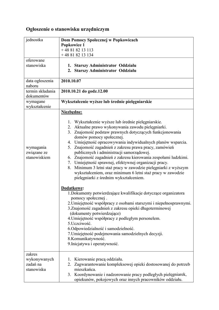 Ogłoszenie o stanowisku urzędniczym jednostka oferowane stanowiska data ogłoszenia naboru termin składania dokumentów wymagane wykształcenie Dom Pomocy Społecznej w Popkowicach Popkowice 1 + 48 81 82 13 113 + 48 81 82 13 134 1. Starszy Administrator Oddziału 2. Starszy Administrator Oddziału 2010.10.07 2010.10.21 do godz.12.00 Wykształcenie wyższe lub średnie pielęgniarskie Niezbędne: wymagania związane ze stanowiskiem 1. Wykształcenie wyższe lub średnie pielęgniarskie. 2. Aktualne prawo wykonywania zawodu pielęgniarki. 3. Znajomość podstaw prawnych dotyczących funkcjonowania domów pomocy społecznej. 4. Umiejętność opracowywania indywidualnych planów wsparcia. 5. Znajomość zagadnień z zakresu prawa pracy, zamówień publicznych i administracji samorządowej. 6. Znajomość zagadnień z zakresu kierowania zespołami ludzkimi. 7. Umiejętność sprawnej, efektywnej organizacji pracy. 8. Minimum 3 letni staż pracy w zawodzie pielęgniarki z wyższym wykształceniem, oraz minimum 6 letni staż pracy w zawodzie pielęgniarki z średnim wykształceniem. Dodatkowe: 1.Dokumenty potwierdzające kwalifikacje dotyczące organizatora pomocy społecznej . 2.Umiejętność współpracy z osobami starszymi i niepełnosprawnymi. 3.Znajomość zagadnień z zakresu opieki długoterminowej (dokumenty potwierdzające) 4.Umiejętność współpracy z podległym personelem. 5.Uczciwość. 6.Odpowiedzialność i samodzielność. 7.Umiejętność podejmowania samodzielnych decyzji. 8.Komunikatywność. 9.Inicjatywa i operatywność. zakres wykonywanych zadań na stanowisku 1. Kierowanie pracą oddziału. 2. Zagwarantowanie kompleksowej opieki dostosowanej do potrzeb mieszkańca. 3. Koordynowanie i nadzorowanie pracy podległych pielęgniarek, opiekunów, pokojowych oraz innych pracowników oddziału. 4. Współpraca z lekarzem rodzinnym i specjalistą. 5. Przestrzeganie ustawy o ochronie danych osobowych. 6. Przestrzeganie przepisów ustaw i innych aktów prawnych związanych z funkcjonowaniem DPS w Popkowicach. 7. Współpraca z organizacjami pozarządowymi. wymagane dokumenty miejsce składania dokumentów uwagi 1. 2. 3. 4. Kwestionariusz osobowy dla osoby ubiegającej się o zatrudnienie Życiorys (CV) Podanie (List motywacyjny.) Kopie dokumentów potwierdzające posiadane wykształcenie, kwalifikacje i staż pracy ( świadectwa pracy) 5. Oświadczenie kandydata o wyrażeniu zgody na przetwarzanie danych osobowych do celów rekrutacji- zgodnie z ustawą z dnia 29.08.1997 r. o ochronie danych osobowych ( tekst jednolity Dz.U. z 2002 r. nr 101, poz 926 z późń.zm.) 6. Oświadczenie o pełnej zdolności do czynności prawnych i korzystaniu z pełni praw publicznych. 7. Oświadczenie o rodzaju i okresie wykonywanej działalności gospodarczej, o ile była prowadzona. 8. Zaświadczenie o niekaralności z Krajowego Rejestru Karnego. Wymagane dokumenty aplikacyjne: list motywacyjny, szczegółowe CV (z uwzględnieniem dokładnego przebiegu kariery zawodowej), powinny być opatrzone klauzulą: Wyrażam zgodę na przetwarzanie moich danych osobowych zawartych w ofercie dla potrzeb realizacji procesu rekrutacji (zgodnie z Ustawą z dnia 29.08.1997 r. o ochronie danych osobowych , oraz ustawą z dnia 21 listopada 2008r. o pracownikach samorządowych ( Dz.U. z dnia 18 grudnia 2008r.Nr 223,poz 1458). Dodatkowe dokumenty według uznania kandydata. Dom Pomocy Społecznej w Popkowicach Popkowice 1 23-250 Urzędów Kandydaci proszeni są o składanie ofert w Sekretariacie Domu Pomocy Społecznej w Popkowicach w zamkniętych kopertach ( z adresem do korespondencji), z dopiskiem „Konkurs na stanowisko Starszy administrator oddziału DPS w Popkowicach” w terminie do dnia 21 października 2010 rok godz. 12,00. Postępowanie konkursowe przeprowadzi komisja konkursowa powołana przez Dyrektora Domu Pomocy Społecznej w Popkowicach. I etap- komisja sprawdzi czy kandydaci spełniają wymagania formalne i podejmie decyzję o dopuszczaniu do II etapu. II etap- komisja przeprowadzi rozmowy kwalifikacyjne z kandydatami i dokona ostatecznej oceny. Aplikacje, które wpłyną do DPS w Popkowicach po określonym terminie nie będą rozpatrywane. Informacja o wynikach naboru będzie umieszczona na stronie internetowej Biuletynu Informacji Publicznej Starostwa Powiatowego w Kraśniku oraz na tablicy informacyjnej DPS w POPKOWICACH (budynek administracyjny). Data ogłoszenia: 07.10.2010r. Zatwierdzam: Marek Klimek ( pieczątka dyrektora)