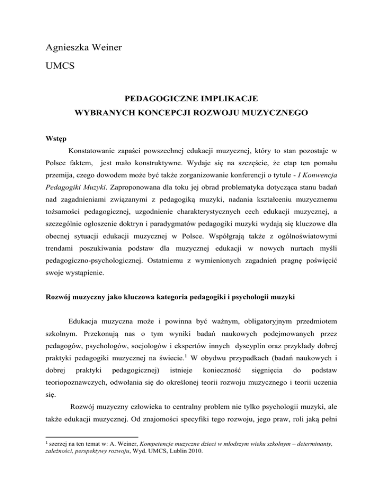 Agnieszka Weiner UMCS PEDAGOGICZNE IMPLIKACJE WYBRANYCH KONCEPCJI ROZWOJU MUZYCZNEGO Wstęp Konstatowanie zapaści powszechnej edukacji muzycznej, który to stan pozostaje w Polsce faktem, jest mało konstruktywne. Wydaje się na szczęście, że etap ten pomału przemija, czego dowodem może być także zorganizowanie konferencji o tytule - I Konwencja Pedagogiki Muzyki. Zaproponowana dla toku jej obrad problematyka dotycząca stanu badań nad zagadnieniami związanymi z pedagogiką muzyki, nadania kształceniu muzycznemu tożsamości pedagogicznej, uzgodnienie charakterystycznych cech edukacji muzycznej, a szczególnie ogłoszenie doktryn i paradygmatów pedagogiki muzyki wydają się kluczowe dla obecnej sytuacji edukacji muzycznej w Polsce. Współgrają także z ogólnoświatowymi trendami poszukiwania podstaw dla muzycznej edukacji w nowych nurtach myśli pedagogiczno-psychologicznej. Ostatniemu z wymienionych zagadnień pragnę poświęcić swoje wystąpienie. Rozwój muzyczny jako kluczowa kategoria pedagogiki i psychologii muzyki Edukacja muzyczna może i powinna być ważnym, obligatoryjnym przedmiotem szkolnym. Przekonują nas o tym wyniki badań naukowych podejmowanych przez pedagogów, psychologów, socjologów i ekspertów innych dyscyplin oraz przykłady dobrej praktyki pedagogiki muzycznej na świecie.1 W obydwu przypadkach (badań naukowych i dobrej praktyki pedagogicznej) istnieje konieczność sięgnięcia do podstaw teoriopoznawczych, odwołania się do określonej teorii rozwoju muzycznego i teorii uczenia się. Rozwój muzyczny człowieka to centralny problem nie tylko psychologii muzyki, ale także edukacji muzycznej. Od znajomości specyfiki tego rozwoju, jego praw, roli jaką pełni szerzej na ten temat w: A. Weiner, Kompetencje muzyczne dzieci w młodszym wieku szkolnym – determinanty, zależności, perspektywy rozwoju, Wyd. UMCS, Lublin 2010. 1 muzyka w poszczególnych fazach ontogenezy zależy wybór strategii postępowania pedagogicznego i, jak ufamy, możliwości poprawy jakości życia człowieka. Poznanie tendencji w rozwoju muzycznym nie jest sprawą łatwą. Już samo ujęcie rozwoju jawi się nieostro. Z punktu widzenia ogólnych paradygmatów teoretycznych wyróżnić można kilka grup teorii rozwoju człowieka w ciągu życia: psychoanalityczne, behawiorystyczne, kognitywne, kulturowo-historyczne, dialektyczne, humanistyczne, czy eklektyczne.2 Psychologia muzyki nie dopracowała się do dziś jednolitej koncepcji muzycznego rozwoju człowieka. Większość propozycji inspiruje myśl Piageta, niektóre poszerzane są o teorie Wygotskiego i Brunera, zaś w kontekście postpiagetowskich ujęć (powtórnego namysłu nad etapowością rozwoju muzycznego) pojawiło się spojrzenie, uwzględniające doniesienia neurodydaktyki na temat specyfiki muzycznego rozwoju. Najintensywniej rozwijający się obecnie nurt psychologii muzyki nie koncentruje się już, jak w latach 80. XX wieku, na poznawczym (piagetowskim) kontekście3. Najbardziej inspirujące ujęcia uwzględniają rolę czynników społecznych i kulturowych kotwicząc się w społecznej psychologii muzyki4. Stąd kluczowe problemy zajmujące psychologów muzyki obejmują tematykę: procesu stawania się muzykiem, gustu i smaku muzycznego, subkultur w muzyce, nowych ról muzyki w biznesie, szeroko pojętym utrzymaniu zdrowia i oczywiście (nadal) relacji muzycznego rozwoju do edukacji. Olbrzymie zróżnicowanie (na świecie) rozumienia tego czym jest i jak przebiega uczenie się muzyki koresponduje z kolejnym pytaniami – co oznacza dziś „bycie muzykiem” i co to znaczy „być dobrym z muzyki”. Stale także poszerza się zakres muzycznych zdolności i umiejętności, co pozostaje częściowo rezultatem gwałtownych zmian społecznych i technologicznych. Obecnie badacze i nauczyciele mają do dyspozycji co najmniej kilka propozycji spójnych koncepcji muzycznego rozwoju, a coraz doskonalsze sposoby nieinwazyjnego monitorowania pracy mózgu (tomografia komputerowa, pozytronowa) stwarzają wspaniałą perspektywę dla dalszych dociekań. Dla potrzeb niniejszego tekstu przywołam trzy z nich, znane i aplikowane w światowej edukacji muzycznej. 2 M. Tyszkowa, M. Przetacznik- Gierowska (2002), Wybrane koncepcje i teorie rozwoju psychicznego człowieka, [w:] red. M. Przetacznik-Gierowska, M. Tyszkowa, Psychologia rozwoju człowieka, zagadnienia ogólne, t.1, PWN, Warszawa 2002 s. 193-220 3 4 por. J. A. Sloboda (1985), The Musical Mind. The cognitive psychology of music, Clarendon Press, Oxford. por. A. North, D. Hargreaves (2008), The Social and Applied Psychology of Music, University Press, Oxford. Spiralny model rozwoju muzycznego K. Swanwicka i J. Tillman Na podstawie prowadzonych wspólnie z J. Tillman badań K. Swanwick zaproponował koncepcję sekwencyjnego rozwoju muzycznego5. Nawiązuje w niej do stanowisk H. Mooga, R. Buntinga i M. Rossa (Swanwick, 19886.). Najbardziej zafascynowany pozostaje teorią J. Piageta i pojmowaniem przez niego roli zabawy w rozwoju dziecka, jako czynnika rozwoju myślenia i inteligencji. Spiralny model rozwoju muzycznego został opracowany na podstawie nagrań kompozycji dzieci w wieku 3-11 lat (na wszystkich dostępnych instrumentach, włącznie z własnym głosem). Nagrania te poddano ocenie 3 sędziów, z których dwóch było muzykami, a jeden nie posiadał muzycznego doświadczenia. Ten ostatni, jak się później okazało, miał duże trudności z przyporządkowaniem nagrań do konkretnego wieku dziecka. Pozostali sędziowie (zanotowano wysoką zbieżność szacunków) nie mieli kłopotów z przyporządkowaniem losowo prezentowanych nagrań do adekwatnego wieku dziecka. Charakterystyczne dla wieku różnice w kompozycjach stanowiły podstawę dla budowy modelu, w którym autor chętnie używa piagetowskich określeń. W wyróżnionych ośmiu etapach muzycznego rozwoju: zmysłowość (poszukiwanie i doświadczanie elementów muzyki, nieprzewidywalne tworzenie