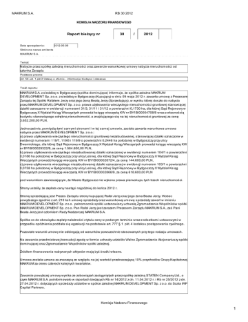 MAKRUM S.A. RB 30 2012 KOMISJA NADZORU FINANSOWEGO Raport bieżący nr Data sporządzenia: 30 / 2012 2012-05-09 Skrócona nazwa emitenta MAKRUM S.A. Temat Nabycie przez spółkę zależną nieruchomości oraz zawarcie warunkowej umowy nabycia nieruchomości od członka Zarządu Podstawa prawna Art. 56 ust. 1 pkt 2 Ustawy o ofercie - informacje bieżące i okresowe Treść raportu: MAKRUM S.A. z siedzibą w Bydgoszczy (spółka dominująca) informuje, że spółka zależna MAKRUM DEVELOPMENT Sp. z o.o. z siedzibą w Bydgoszczy (Kupujący) w dniu 09 maja 2012 r. zawarła umowę z Prezesem Zarządu tej Spółki Rafałem Jerzy oraz jego żoną Beatą Jerzy (Sprzedający), w wyniku której doszło do nabycia przez MAKRUM DEVELOPMENT Sp. z o.o. prawa użytkowania wieczystego nieruchomości gruntowej stanowiącej działki oznaczone w ewidencji numerami 31/3, 31/11 i 31/12 o powierzchni 0,1730 ha, dla której Sąd Rejonowy w Bydgoszczy X Wydział Ksiąg Wieczystych prowadzi księgę wieczystą KW nr BY1B/00004708/8 wraz z własnością budynku stanowiącego odrębną nieruchomość, a znajdującego się na tej nieruchomości gruntowej za cenę 3.652.200,00 PLN. Jednocześnie, pomiędzy tymi samymi stronami i w tej samej umowie, została zawarta warunkowa umowa nabycia przez MAKRUM DEVELOPMENT Sp. z o.o.: a) prawa użytkowania wieczystego nieruchomości gruntowej niezabudowanej, stanowiącej działki oznaczone w ewidencji numerami 119/7, 119/8 i 119/9 o powierzchni 0,2446 ha położonej w Bydgoszczy przy ulicy Dwernickiego, dla której Sąd Rejonowy w Bydgoszczy X Wydział Ksiąg Wieczystych prowadzi księgę wieczystą KW nr BY1B/00029322/9, za cenę 1.584.600,00 PLN, b) prawa użytkowania wieczystego niezabudowanej działki oznaczonej w ewidencji numerem 104/1 o powierzchni 0,0186 ha położonej w Bydgoszczy przy ulicy Leśnej, dla której Sąd Rejonowy w Bydgoszczy X Wydział Ksiąg Wieczystych prowadzi księgę wieczystą KW nr BY1B/00002872/4, za cenę 144.600,00 PLN, c) prawa użytkowania wieczystego niezabudowanej działki oznaczonej w ewidencji numerem 103/1 o powierzchni 0,0758 ha położonej w Bydgoszczy przy ulicy Leśnej, dla której Sąd Rejonowy w Bydgoszczy X Wydział Ksiąg Wieczystych prowadzi księgę wieczystą KW nr BY1B/00002866/9, za cenę 618.600,00 PLN pod warunkiem zawieszającym, że Miasto Bydgoszcz nie wykona prawa pierwokupu tych trzech nieruchomości. Strony ustaliły, że zapłata ceny nastąpi najpóźniej do końca 2012 r. Stroną sprzedającą jest Prezes Zarządu strony kupującej Rafał Jerzy oraz jego żona Beata Jerzy. Wobec powyższego zgodnie z art. 210 ksh umowę sprzedaży oraz warunkową umowę sprzedaży zawarł w imieniu MAKRUM DEVELOPMENT Sp. z o.o. pełnomocnik spółki ustanowiony uchwałą Zgromadzenia Wspólników spółki MAKRUM DEVELOPMENT Sp. z o.o. Pan Rafał Jerzy jest zarazem Prezesem Zarządu MAKRUM S.A., zaś Pani Beata Jerzy jest członkiem Rady Nadzorczej MAKRUM S.A. Spółka co do obowiązku zapłaty należności z tytułu ceny w podanym terminie wraz z odsetkami ustawowymi w przypadku opóźnienia poddała się egzekucji na podstawie art. 777 § 1 pkt. 4 kodeksu postępowania cywilnego. Pozostałe warunki umowy nie odbiegają od warunków powszechnie stosowanych przy tego rodzaju umowach. Na zawarcie przedmiotowej transakcji zgodę w formie uchwały udzieliło Walne Zgromadzenie Akcjonariuszy spółki dominującej oraz Zgromadzenie Wspólników spółki zależnej. Źródłem finansowania nabywanych aktywów mają być środki własne. Umowa została uznana za znaczącą ze względu na jej wartość przekraczającą 10% przychodów Grupy Kapitałowej MAKRUM za okres czterech kolejnych kwartałów. Zawarcie powyższej umowy wynika ze zobowiązań zaciągniętych przez spółkę zależną STATEN Company Ltd., o czym MAKRUM S.A. poinformowało w raportach bieżących Rb nr 14/2012 z dn. 11.04.2012 r. i Rb nr 25/2012 z dn. 27.04.2012 r. dotyczących sprzedaży udziałów w spółce zależnej MAKRUM DEVELOPMENT Sp. z o.o. do Scala IRP Capital Partners. Komisja Nadzoru Finansowego 1 MAKRUM S.A. RB 30 2012 MAKRUM SPÓŁKA AKCYJNA (pełna nazwa emitenta) MAKRUM S.A. Przemysł inne (pin) (skróc ona nazwa emitenta) 85-676 (sektor wg. klasyfikacji GPW w W-wie) Bydgoszcz (kod pocztowy) (miejscowość) Leśna 11-19 (ulica) (numer) 052 3236401 052 3236400 (telefon) (fax) [email protected] www.makrum.pl (e-mail) (www) 5540309005 090549380 (NIP) (REGON) PODPISY OSÓB REPREZENTUJĄCYCH SPÓŁKĘ Data Imię i Nazwisko Stanowisko/Funkc ja 2012-05-09 Sławomir Winiecki Wiceprezes Zarządu 2012-05-09 Piotr Fortuna Prokurent Podpis Komisja Nadzoru Finansowego 2