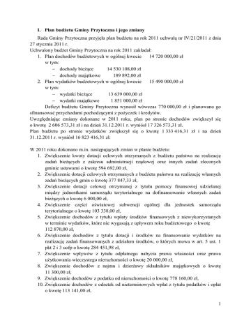 I. Plan budżetu Gminy Przytoczna i jego zmiany Rada Gminy Przytoczna przyjęła plan budżetu na rok 2011 uchwałą nr IV/21/2011 z dnia 27 stycznia 2011 r. Uchwalony budżet Gminy Przytoczna na rok 2011 zakładał: 1. Plan dochodów budżetowych w ogólnej kwocie 14 720 000,00 zł w tym: dochody bieżące 14 530 108,00 zł dochody majątkowe 189 892,00 zł 2. Plan wydatków budżetowych w ogólnej kwocie 15 490 000,00 zł w tym: wydatki bieżące 13 639 000,00 zł wydatki majątkowe 1 851 000,00 zł Deficyt budżetu Gminy Przytoczna wynosił wówczas 770 000,00 zł i planowano go sfinansować przychodami pochodzącymi z pożyczek i kredytów. Uwzględniając zmiany dokonane w 2011 roku, plan po stronie dochodów zwiększył się o kwotę 2 606 573,31 zł i na dzień 31.12.2011 r. wyniósł 17 326 573,31 zł. Plan budżetu po stronie wydatków zwiększył się o kwotę 1 333 416,31 zł i na dzień 31.12.2011 r. wyniósł 16 823 416,31 zł. W 2011 roku dokonano m.in. następujących zmian w planie budżetu: 1. Zwiększenie kwoty dotacji celowych otrzymanych z budżetu państwa na realizację zadań bieżących z zakresu administracji rządowej oraz innych zadań zleconych gminie ustawami o kwotę 594 692,00 zł, 2. Zwiększenie dotacji celowych otrzymanych z budżetu państwa na realizację własnych zadań bieżących gmin o kwotę 377 847,33 zł, 3. Zwiększenie dotacji celowej otrzymanej z tytułu pomocy finansowej udzielanej między jednostkami samorządu terytorialnego na dofinansowanie własnych zadań bieżących o kwotę 6 000,00 zł, 4. Zwiększenie części oświatowej subwencji ogólnej dla jednostek samorządu terytorialnego o kwotę 103 338,00 zł, 5. Zwiększenie dochodów z tytułu wpłaty środków finansowych z niewykorzystanych w terminie wydatków, które nie wygasają z upływem roku budżetowego o kwotę 112 870,00 zł, 6. Zwiększenie dochodów z tytułu dotacji i środków na finansowanie wydatków na realizację zadań finansowanych z udziałem środków, o których mowa w art. 5 ust. 1 pkt 2 i 3 uofp o kwotę 284 451,98 zł, 7. Zwiększenie wpływów z tytułu odpłatnego nabycia prawa własności oraz prawa użytkowania wieczystego nieruchomości o kwotę 20 000,00 zł, 8. Zwiększenie dochodów z najmu i dzierżawy składników majątkowych o kwotę 11 300,00 zł, 9. Zwiększenie dochodów z podatku od nieruchomości o kwotę 778 160,00 zł, 10. Zwiększenie dochodów z odsetek od nieterminowych wpłat z tytułu podatków i opłat o kwotę 113 141,00 zł, 1 11. Zwiększenie dochodów z tytułu opłaty eksploatacyjnej o kwotę 90 000,00 zł, 12. Zwiększenie dochodów z tytułu otrzymanych darowizn o kwotę 3 030,00 zł. Powyższe zmiany odpowiednio wpłynęły na zwiększenie planu wydatków budżetowych. II. Wykonanie planu dochodów budżetowych na dzień 31.12.2011 r. Plan Wykonanie Wykonanie planu [%] Dochody bieżące 17 003 811,31 17 571 612,79 103,34 Dochody majątkowe Razem 322 762,00 17 326 573,31 322 284,39 17 893 897,18 99,85 103,27 Kwota 17 571 612,79 zł to zrealizowane dochody bieżące, w tym m.in.: Dotacje na realizacje zadań zleconych gminie z zakresu administracji rządowej i innych zleconych na podstawie odrębnych ustaw – 2 935 516,38 zł, Dotacje celowe otrzymane z budżetu państwa na realizację własnych zadań bieżących – 1 249 183,86 zł, Subwencja ogólna – 4 584 247,00 zł, w tym: część oświatowa – 3 721 429,00 zł, część wyrównawcza – 839 114,00 zł, część równoważąca – 23 704,00 zł, Wpływy z podatku rolnego, leśnego, podatku od spadków i darowizn, podatku od czynności cywilnoprawnych oraz podatków i opłat lokalnych od osób fizycznych – 1 150 127,77 zł, Wpływy z podatków i opłat od osób prawnych i innych jednostek organizacyjnych – 4 616 199,33 zł, Wpływy z opłaty skarbowej – 21 608,00 zł, Wpływy z opłaty miejscowej – 5 427,50 zł, Wpływy z opłaty eksploatacyjnej – 142 414,20 zł, Wpływy z opłat za zezwolenia na sprzedaż alkoholu – 93 263,93 zł, Udział w podatkach stanowiących dochód budżetu państwa – 1 773 171,90 zł, w tym: podatek dochodowy od osób fizycznych – 1 661 432,00 zł, podatek dochodowy od osób prawnych – 111 739,90 zł, Dochody z najmu i dzierżawy składników majątkowych – 108 782,77 zł, Wpływy z różnych opłat – 67 562,52 zł, w tym: wpływy związane z gromadzeniem środków z opłat i kar za korzystanie ze środowiska – 19 293,25 zł, Wpływy z tytułu pomocy finansowej udzielanej między jednostkami samorządu terytorialnego na dofinansowanie własnych zadań bieżących – 6 000,00 zł – pomoc finansowa udzielona przez Województwo Lubuskie na realizację zadania: boisko do plażowej piłki siatkowej w ramach projektu pn. „Lubusik – sportowe Lubuskie na lato” w Strychach oraz organizację rozgrywek w ramach Lubuskiego Turnieju Plażowej Piłki Siatkowej, Dochody z tytułu grzywien i innych kar od osób prawnych i innych jednostek organizacyjnych – 298 521,98 zł, 2 Środki na dofinansowanie własnych zadań bieżących gmin pozyskane z innych źródeł – 200 541,85 zł, w tym: dochody z tytułu dotacji i środków na finansowanie wydatków na realizację zadań finansowanych z udziałem środków, o których mowa w art. 5 ust. 1 pkt 2 i 3 uofp – 200 541,85 zł. Dochody majątkowe zrealizowano w kwocie 322 284,39 zł, na co złożyły się: Wpływy z tytułu odpłatnego nabycia prawa własności oraz prawa użytkowania wieczystego nieruchomości – 209 413,85 zł. W 2011 roku Gmina Przytoczna zbyła: - 5 działek za łączną kwotę 119 226,67 zł, - mieszkanie za kwotę 1 311,00 zł, - budynek młyna za kwotę - 88 876,18 zł. Wpłata środków finansowych z niewykorzystanych w terminie wydatków, które nie wygasają z upływem roku budżetowego – 112 870,54 zł. Stopień wykonania planu dochodów budżetowych przedstawia szczegółowo załącznik nr 1. III. Wykonanie planu wydatków budżetowych na dzie