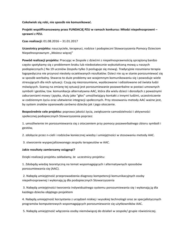 Cokolwiek się robi, nie sposób nie komunikować. Projekt współfinansowany przez FUNDACJĘ PZU w ramach konkursu: Młodzi niepełnosprawni – sprawni z PZU. Czas realizacji: 01.08.2016 – 31.01.2017 Uczestnicy projektu: nauczyciele, terapeuci, rodzice i podopieczni Stowarzyszenia Pomocy Dzieciom Niepełnosprawnym „Możesz więcej” Powód realizacji projektu: Pracując w Zespole z dziećmi z niepełnosprawnością sprzężoną bardzo często spotykamy się z problemem braku lub niedostatecznie wykształconą mową u naszych podopiecznych.( Na 19 uczniów Zespołu tylko 3 posługuje się mową). Tradycyjnie rozumiana terapia logopedyczna nie przynosi niestety oczekiwanych rezultatów. Dzieci nie są w stanie porozumiewać się w sposób werbalny. Stwarza to duże problemy we wzajemnym komunikowaniu się i powoduje wiele stresujących dla nich sytuacji. Czują się niezrozumiane, wyobcowane i odizolowane od świata ludzi mówiących. Szansą na zmianę tej sytuacji jest porozumiewanie pozawerbalne w postaci umownych symboli i gestów, tzw. komunikacja alternatywna AAC, która dla wielu dzieci i dorosłych z poważnymi zaburzeniami mowy i języka, służy jako "głos" umożliwiający kontakt z innymi ludźmi, uczestniczenie w codziennym życiu oraz ułatwienie integracji społecznych. Przy stosowaniu metody AAC ważne jest, by system znaków opanowało zarówno dziecko jak i jego otoczenie. Bezpośrednie cele projektu: poprawa jakości życia, zwiększenie samodzielności i aktywności społecznej podopiecznych Stowarzyszenia poprzez: 1. umożliwienie im porozumiewania się z otoczeniem przy pomocy pozawerbalnego zbioru symboli i gestów, 2. zdobycie przez n-cieli i rodziców koniecznej wiedzy i umiejętności w stosowaniu metody AAC. 3. stworzenie wyspecjalizowanego zespołu terapeutów w AAC. Jakie rezultaty zamierzamy osiągnąć? Dzięki realizacji projektu zakładamy, że uczestnicy projektu: 1. Zdobędą wiedzę teoretyczną na temat wspomagających i alternatywnych sposobów porozumiewania się (AAC). 2. Nabędą umiejętność przeprowadzenia diagnozy kompetencji komunikacyjnych osoby niepełnosprawnej i wykonają ją dla podopiecznych Stowarzyszenia 3. Nabędą umiejętności tworzenia indywidualnego systemu porozumiewania się i wykonają ją dla każdego dziecka objętego projektem 4. Nabędą umiejętność korzystania z urządzeń niskiej i wysokiej technologii oraz ze specjalistycznych programów komputerowych wspomagających porozumiewanie się użytkowników AAC. 5. Nabędą umiejętność włączenia osoby niemówiącej do działań w zespole/ grupie rówieśniczej. 6. Rodzice włączą się aktywnie w proces edukacyjno-terapeutyczny.(bardzo istotne, aby praca rozpoczęta w szkole była kontynuowana w domu) 7. Wypracujemy zasady tworzenia systemu AAC w placówce edukacyjno-terapeutycznej. Po projekcie: Kontynuacja pracy terapeutycznej metodą AAC dzięki nabyciu umiejętności i wiedzy przez zatrudnioną w Zespole kadrę pedagogiczną. W ramach projektu zaplanowaliśmy: 1. Szkolenie praktyczne i teoretyczne „Porozumiewanie się bez słów” w wymiarze 196 godz. prowadzone przez doświadczonych neurologopedów. 2. Wizyty studyjne 3. Zakup specjalistycznego sprzętu i oprogramowania.