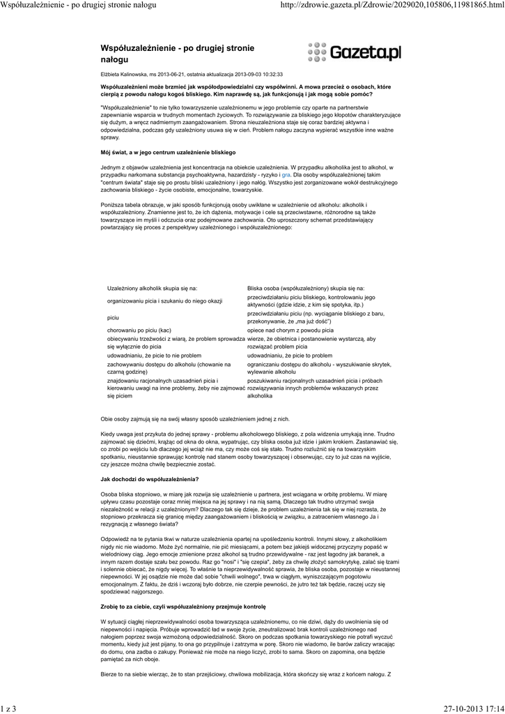 Współuzależnienie - po drugiej stronie nałogu 1z3 http://zdrowie.gazeta.pl/Zdrowie/2029020,105806,11981865.html Współuzależnienie - po drugiej stronie nałogu Elżbieta Kalinowska, ms 2013-06-21, ostatnia aktualizacja 2013-09-03 10:32:33 Współuzależnieni może brzmieć jak współodpowiedzialni czy współwinni. A mowa przecież o osobach, które cierpią z powodu nałogu kogoś bliskiego. Kim naprawdę są, jak funkcjonują i jak mogą sobie pomóc? "Współuzależnienie" to nie tylko towarzyszenie uzależnionemu w jego problemie czy oparte na partnerstwie zapewnianie wsparcia w trudnych momentach życiowych. To rozwiązywanie za bliskiego jego kłopotów charakteryzujące się dużym, a wręcz nadmiernym zaangażowaniem. Strona nieuzależniona staje się coraz bardziej aktywna i odpowiedzialna, podczas gdy uzależniony usuwa się w cień. Problem nałogu zaczyna wypierać wszystkie inne ważne sprawy. Mój świat, a w jego centrum uzależnienie bliskiego Jednym z objawów uzależnienia jest koncentracja na obiekcie uzależnienia. W przypadku alkoholika jest to alkohol, w przypadku narkomana substancja psychoaktywna, hazardzisty - ryzyko i gra. Dla osoby współuzależnionej takim "centrum świata" staje się po prostu bliski uzależniony i jego nałóg. Wszystko jest zorganizowane wokół destrukcyjnego zachowania bliskiego - życie osobiste, emocjonalne, towarzyskie. Poniższa tabela obrazuje, w jaki sposób funkcjonują osoby uwikłane w uzależnienie od alkoholu: alkoholik i współuzależniony. Znamienne jest to, że ich dążenia, motywacje i cele są przeciwstawne, różnorodne są także towarzyszące im myśli i odczucia oraz podejmowane zachowania. Oto uproszczony schemat przedstawiający powtarzający się proces z perspektywy uzależnionego i współuzależnionego: Uzależniony alkoholik skupia się na: Bliska osoba (współuzależniony) skupia się na: organizowaniu picia i szukaniu do niego okazji przeciwdziałaniu piciu bliskiego, kontrolowaniu jego aktywności (gdzie idzie, z kim się spotyka, itp.) piciu przeciwdziałaniu piciu (np. wyciąganie bliskiego z baru, przekonywanie, że „ma już dość”) chorowaniu po piciu (kac) opiece nad chorym z powodu picia obiecywaniu trzeźwości z wiarą, że problem sprowadza wierze, że obietnica i postanowienie wystarczą, aby się wyłącznie do picia rozwiązać problem picia udowadnianiu, że picie to nie problem udowadnianiu, że picie to problem zachowywaniu dostępu do alkoholu (chowanie na czarną godzinę) ograniczaniu dostępu do alkoholu - wyszukiwanie skrytek, wylewanie alkoholu znajdowaniu racjonalnych uzasadnień picia i poszukiwaniu racjonalnych uzasadnień picia i próbach kierowaniu uwagi na inne problemy, żeby nie zajmować rozwiązywania innych problemów wskazanych przez się piciem alkoholika Obie osoby zajmują się na swój własny sposób uzależnieniem jednej z nich. Kiedy uwaga jest przykuta do jednej sprawy - problemu alkoholowego bliskiego, z pola widzenia umykają inne. Trudno zajmować się dziećmi, krążąc od okna do okna, wypatrując, czy bliska osoba już idzie i jakim krokiem. Zastanawiać się, co zrobi po wejściu lub dlaczego jej wciąż nie ma, czy może coś się stało. Trudno rozluźnić się na towarzyskim spotkaniu, nieustannie sprawując kontrolę nad stanem osoby towarzyszącej i obserwując, czy to już czas na wyjście, czy jeszcze można chwilę bezpiecznie zostać. Jak dochodzi do współuzależnienia? Osoba bliska stopniowo, w miarę jak rozwija się uzależnienie u partnera, jest wciągana w orbitę problemu. W miarę upływu czasu pozostaje coraz mniej miejsca na jej sprawy i na nią samą. Dlaczego tak trudno utrzymać swoja niezależność w relacji z uzależnionym? Dlaczego tak się dzieje, że problem uzależnienia tak się w niej rozrasta, że stopniowo przekracza się granicę między zaangażowaniem i bliskością w związku, a zatraceniem własnego Ja i rezygnacją z własnego świata? Odpowiedź na te pytania tkwi w naturze uzależnienia opartej na upośledzeniu kontroli. Innymi słowy, z alkoholikiem nigdy nic nie wiadomo. Może żyć normalnie, nie pić miesiącami, a potem bez jakiejś widocznej przyczyny popaść w wielodniowy ciąg. Jego emocje zmienione przez alkohol są trudno przewidywalne - raz jest łagodny jak baranek, a innym razem dostaje szału bez powodu. Raz go "nosi" i "się czepia", żeby za chwilę złożyć samokrytykę, zalać się łzami i solennie obiecać, że nigdy więcej. To właśnie ta nieprzewidywalność sprawia, że bliska osoba, pozostaje w nieustannej niepewności. W jej osądzie nie może dać sobie "chwili wolnego", trwa w ciągłym, wyniszczającym pogotowiu emocjonalnym. Z faktu, że dziś i wczoraj było dobrze, nie czerpie pewności, że jutro też tak będzie, raczej uczy się spodziewać najgorszego. Zrobię to za ciebie, czyli współuzależniony przejmuje kontrolę W sytuacji ciągłej nieprzewidywalności osoba towarzysząca uzależnionemu, co nie dziwi, dąży do uwolnienia się od niepewności i napięcia. Próbuje wprowadzić ład w swoje życie, zneutralizować brak kontroli uzależnionego nad nałogiem poprzez swoja wzmożoną odpowiedzialność. Skoro on podczas spotkania towarzyskiego nie potrafi wyczuć momentu, kiedy już jest pijany, to ona go przypilnuje i zatrzyma w porę. Skoro nie wiadomo, ile barów zaliczy wracając do domu, ona zadba o zakupy. Ponieważ nie może na niego liczyć, zrobi to sama. Skoro on zapomina, ona będzie pamiętać za nich oboje. Bierze to na siebie wierząc, że to stan przejściowy, chwilowa mobilizacja, która skończy się wraz z końcem nałogu. Z 27-10-2013 17:14 Współuzależnienie - po drugiej stronie nałogu 2z3 http://zdrowie.gazeta.pl/Zdrowie/2029020,105806,11981865.html tego względu osoba współuzależniona jest bardzo mocno zmotywowana do tego, aby zrobić coś z uzależnieniem drugiej strony. Niezmordowanie szuka sposobu, co zrobić aby on przestał Z jedn