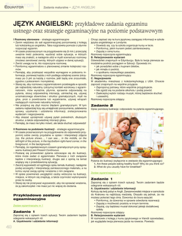 Edukator Edukator Zadania maturalne • J ZYK ANGIELSKI JZYK ANGIELSKI: przykadowe zadania egzaminu ustnego oraz strategie egzaminacyjne na poziomie podstawowym I Rozmowy sterowane – strategie egzaminacyjne • Zanim wejdziesz do sali egzaminacyjnej porozmawiaj z koleg7 lub kole8ank7 po angielsku. Taka rozgrzewka pomo8e ci p6ynnie rozpocz73 egzamin. • W czasie przeznaczonym na przygotowanie si; (5 min.) przeczytaj uwa8nie tre23 polecenia, wyobra+ sobie sytuacje, w których masz si; znale+3, a nast;pnie u6ó8 w my2li scenariusz rozmowy (mo8esz zanotowa3 zwroty, których u8yjesz w danej sytuacji). • Zwró3 uwag; na to, kto rozpoczyna rozmow;. • Poinformuj egzaminatora o planowanej zmianie kolejno2ci rozmów. • Pami;taj, aby przekaza3 wszystkie wymagane w poleceniu informacje, poniewa8 ka8da z nich podlega odr;bnej ocenie (otrzymasz po 3 pkt za ka8d7 z rozmów, je2li b;d7 one zrozumia6e, zgodne z poleceniem i kompletne). • Staraj si;, aby rozmowa z egzaminatorem przebiega6a w sposób jak najbardziej naturalny (utrzymuj kontakt wzrokowy z egzaminatorem, mów wyra+nie, p6ynnie, sprawnie odpowiadaj na pytania, stosuj odpowiedni7 intonacj;, u2miechaj si;, u8ywaj urozmaiconego s6ownictwa i struktur gramatycznych, my2l na g6os, pro2 o powtórzenie lub wyja2nienie, u8ywaj wtr7ce, nadaj7cych rozmowie naturalny koloryt). • Nie przejmuj si; zbyt mocno b6;dami gramatycznymi. W tym zadaniu najbardziej liczy si; umiej;tno23 porozumienia, za6atwienia sprawy, uzyskania i udzielenia informacji, zrelacjonowania wydarze, i negocjowania. • Aby okaza3 uprzejmo23 u8ywaj pyta, po2rednich, d6u8szych struktur, a tak8e odpowiedniej intonacji g6osu. • Pami;taj, 8e masz nie tylko mówi3, ale tak8e s6ucha3 odpowiedzi! II Rozmowa na podstawie ilustracji – strategie egzaminacyjne • W czasie przeznaczonym na przygotowanie do odpowiedzi przypomnij sobie zwroty przydatne w opisie i interpretacji zdj;cia (np. the picture shows…, I can see..., in the middle, on the left/right of the picture, in the top/bottom right-hand corner, in the foreground, in the background). • Pami;taj, 8e najw6a2ciwszym czasem gramatycznym przy opisywaniu ilustracji jest Present Continuous. • Postaraj si; przewidzie3 pytania odnosz7ce si; do ilustracji, które mo8e zada3 ci egzaminator. Pierwsze z nich zwi7zane b;dzie z interpretacj7 ilustracji, drugie za2 z opini7 na temat wi787cy si; z przedstawion7 sytuacj7. • Zacznij wypowied+ od ogólnego opisu tematu ilustracji, nast;pnie podaj szczegó6y i interpretacj; zamieszczonego materia6u, a na ko,cu wyra+ swoj7 opini; i wra8enia z nim zwi7zane. • W opisie powiniene2 uwzgl;dni3 osoby widoczne na ilustracji, miejsce, w którym si; znajduj7, a tak8e czynno2ci wykonywane przez te osoby. • Staraj si; nie przerywa3 wypowiedzi, aby nie sprawia3 wra8enia, 8e j7 zako,czy6e2 i nie masz ju8 nic wi;cej do dodania. Przykadowe zestawy egzaminacyjne Zestaw egzaminacyjny nr 1 Zadanie 1 Zapoznaj si; z opisem trzech sytuacji. Twoim zadaniem b;dzie odegranie wskazanych ról. A. Uzyskiwanie i udzielanie informacji 40 Chc7c zapisa3 si; na kurs j;zykowy zasi;gasz informacji w szkole j;zyka angielskiego w Londynie. • Dowiedz si;, czy ta szko6a organizuje kursy w lecie. • Poinformuj, jakim kursem jeste2 zainteresowany. • Zapytaj o cen; kursu. Rozmow# rozpoczyna egzaminuj!cy. B. Relacjonowanie wydarze Odwiedzi6e2 znajomych w Edynburgu. By6a to twoja pierwsza samodzielna podró8 poci7giem w Szkocji. Opowiedz im: • jak poradzi6e2 sobie z kupnem biletów, • jak min;6a ci podró8, • o spotkaniu niezwyk6ego pasa8era. Rozmow# rozpoczyna egzaminuj!cy. C. Negocjowanie W akademiku mieszkasz z kole8ank7/koleg7 z USA. Chcecie zaprosi3 znajomych na wspólne przyj;cie. • Zaproponuj potrawy, które wspólnie przygotujecie. • Nie zgód+ si; na podanie alkoholu i podaj powód. • Zaakceptuj wybór rodzaju muzyki, której b;dziecie s6ucha3 i uzasadnij. Rozmow# rozpoczyna zdaj!cy. Zadanie 2 Opisz poni8sz7 ilustracj; i odpowiedz na pytania egzaminuj7cego. Pytania do ilustracji (wy67cznie w zestawie dla egzaminuj7cego): 1. Are these people eating healthy food? Why do you think so? 2. What do you usually have for breakfast? Zestaw egzaminacyjny nr 2 Zadanie 1 Zapoznaj si; z opisem trzech sytuacji. Twoim zadaniem b;dzie odegranie wskazanych ról. A. Uzyskiwanie i udzielanie informacji Ko,czy si; twój pobyt w Anglii. Zarezerwowa6e2 miejsce w samolocie do Krakowa na najbli8sz7 niedziel;. Okaza6o si; jednak, 8e nie mo8esz polecie3 tego dnia. Dzwonisz do biura easyJet: • Poinformuj, 8e dzwonisz w sprawie odwo6ania rezerwacji. • Zapytaj o mo8liwo23 przelotu w innym terminie. • Zapytaj, czy b;dziesz musia6 dokona3 jakiej2 dodatkowej op6aty. Rozmow# rozpoczyna zdaj!cy. B. Relacjonowanie wydarze W rozmowie z koleg7 z kursu j;zykowego w Irlandii opowiadasz, jak wygl7da6a twoja pierwsza jazda na rowerze. Powiedz: J ZYK ANGIELSKI • Zadania maturalne Edukator Edukator • jak si2 czu.e, przed pierwsz1 prób1, • jak przebiega.a pierwsza w )yciu jazda na rowerze, • jak si2 czu.e, po tej je"dzie. Rozmow rozpoczyna egzaminujcy. C. Negocjowanie Znajomi twoich rodziców, u których mieszkasz w czasie pobytu w Anglii, chc1 ci kupi+ telefon komórkowy w prezencie. • Odrzu+ ich propozycj2 i podaj uzasadnienie. • Zaproponuj inny sprz2t. • Uzasadnij swój wybór. Rozmow rozpoczyna zdajcy. Zadanie 2 Opisz poni)sz1 ilustracj2 i odpowiedz na pytania egzaminuj1cego. Pytania do ilustracji (wy.1cznie w zestawie dla egzaminuj1cego): 1. How do people in Poland celebrate special occassions? 2. What kind of restaurants do you like? Why? Zestaw egzaminacyjny nr 4 Zadanie 1 Pytania do ilustracji (wy.1cznie w zestawie dla egzaminuj1cego): 1. What makes the people in the picture happy? 2. How do you prefer to spend your leisure time? Zestaw egzaminacyjny nr 3 Zadanie 1 Zapoznaj si2 z opisem trzech sytuacji. Twoim zadaniem b2dzie odegranie wskazanych ról. A. Uzyskiwanie i udzielanie informacji Twój znajomy z Anglii