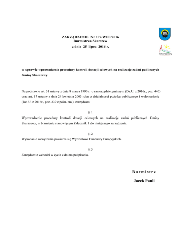 ZARZĄDZENIE Nr 177/WFE/2016 Burmistrza Skarszew z dnia 25 lipca 2016 r. w sprawie wprowadzenia procedury kontroli dotacji celowych na realizację zadań publicznych Gminy Skarszewy. Na podstawie art. 31 ustawy z dnia 8 marca 1990 r. o samorządzie gminnym (Dz.U. z 2016r., poz. 446) oraz art. 17 ustawy z dnia 24 kwietnia 2003 roku o działalności pożytku publicznego i wolontariacie (Dz. U. z 2016r., poz. 239 z późn. zm.), zarządzam: §1 Wprowadzenie procedury kontroli dotacji celowych na realizację zadań publicznych Gminy Skarszewy, w brzmieniu stanowiącym Załącznik 1 do niniejszego zarządzenia. §2 Wykonanie zarządzenia powierza się Wydziałowi Funduszy Europejskich. §3 Zarządzenie wchodzi w życie z dniem podpisania. Burmistrz Jacek Pauli Załącznik 1 do Zarządzenia nr 177 /WFE/2016 Burmistrza Skarszew z dnia 25 lipca 2016 r. Procedura kontroli dotacji celowych na realizację zadań publicznych Gminy Skarszewy §1 Procedura określa zasady kontroli dotacji celowych na realizację zadań publicznych Gminy Skarszewy sfinansowanych z budżetu Gminy. §2 1. Kontroli realizacji zadań zleconych jednostce kontrolowanej dokonuje pracownik merytoryczny, do którego należą sprawy organizacji pozarządowych wraz z innym upoważnionym pracownikiem Urzędu, właściwym ze względu na zakres zadania poddawanego kontroli, na podstawie imiennego upoważnienia wystawionego przez Burmistrza Skarszew. Wzór upoważnienia stanowi załącznik 1 do niniejszej procedury. Upoważnienia wystawiane są w dwóch jednobrzmiących egzemplarzach, z których jeden 2. po podpisaniu pozostawia się w jednostce kontrolowanej (Beneficjencie), drugi egzemplarz jest dołączany do protokołu kontroli znajdującego się w Urzędzie Miejskim w Skarszewach. Kontrola realizacji zadania obejmuje sprawdzenie niżej wymienionych zakresów łącznie 3. lub wybiórczo: stan realizacji projektu, efektywność, rzetelność i jakość jego wykonania, prawidłowość wykorzystania środków z dotacji z budżetu Gminy Skarszewy, prowadzenie przez beneficjenta dokumentacji księgowo-rachunkowej w zakresie wykorzystania środków dotacji z budżetu Gminy Skarszewy. 4. Kontroli dokonuje się poprzez porównanie stanu faktycznego z obowiązującymi przepisami prawa oraz postanowieniami umowy zawartej pomiędzy Gminą Skarszewy a Beneficjentem. 5. Z przeprowadzonych czynności sporządza się protokół kontroli w terminie 7 dni od dnia zakończenia czynności kontrolnych. Wzór protokołu kontroli stanowi załącznik 2 do niniejszej procedury. 6. Protokół sporządzany jest w dwóch jednobrzmiących egzemplarzach po jednym dla każdej ze stron umowy, o której mowa w ust. 4. §3 1. Jednostce kontrolowanej przysługuje prawo wniesienia do protokołu kontroli wyjaśnień i uwag w terminie 7 dni od daty podpisania protokołu. 2. Wyjaśnienia należy składać w formie pisemnej na dzienniku podawczym Urzędu Miejskiego w Skarszewach lub listem poleconym za pośrednictwem poczty. Wyjaśnienia lub uwagi do protokołu uznaje się za złożone w terminie, jeśli zostaną doręczone w ostatnim dniu terminu do ich wniesienia. 3. Pracownicy, o których mowa w § 2 ust. 1 dokonują analizy wniesionych wyjaśnień i uwag do protokołu stwierdzając ich zasadność. §4 1. W przypadku stwierdzenia w trakcie kontroli nieprawidłowości pracownicy, o których mowa w § 2 ust. 1 przygotowują w terminie 14 dni od daty podpisania protokołu wystąpienie pokontrolne, w którym informuje jednostkę kontrolowaną o stwierdzonych nieprawidłowościach. Wzór wystąpienia pokontrolnego stanowi załącznik 3 do niniejszej procedury. 2. Wystąpienie pokontrolne podpisuje Burmistrz Skarszew. 3. Wystąpienie pokontrolne sporządzane jest w trzech jednobrzmiących egzemplarzach, z których jeden przekazywany jest jednostce kontrolowanej, drugi pozostaje w aktach sprawy, a trzeci przekazywany do Wydziału Finansowego. 4. W terminie 21 dni od dnia otrzymania niniejszego wystąpienia pokontrolnego, kontrolowana jednostka jest obowiązana zawiadomić Urząd Miejski w Skarszewach o wykonaniu wniosków pokontrolnych lub o przyczynach ich niewykonania. Załącznik 1 do procedury kontroli dotacji celowych na realizację zadań publicznych Gminy Skarszewy Upoważnienie nr ……… do przeprowadzenia kontroli realizacji zadania publicznego pn. …………………………………………………………. realizowanego przez ………………………………………….. na podstawie umowy …………….. z dnia ……………. Okres kontroli ………………………………………………………………………………………………………….. Zakres: - stan realizacji zadania publicznego, - efektywność, rzetelność i jakość jego wykonania, - prawidłowość wykorzystania środków z dotacji z budżetu Gminy Skarszewy, - prowadzenie przez beneficjenta dokumentacji księgowo-rachunkowej w zakresie wykorzystania środków dotacji z budżetu Gminy Skarszewy Osoby upoważnione do kontroli ………………………………………………………………………………………………………….. ………………………………………………………………………………………………………….. ………………………………………………………………………………………………………….. Termin ważności upoważnienia ………………………………………………………………………………………………………….. ………………………………………………………………………………………………………….. Potwierdzenie przedstawienia upoważnienia ………………………………………………………………………………………………………….. ………………………………………………………………………………………………………….. ……………