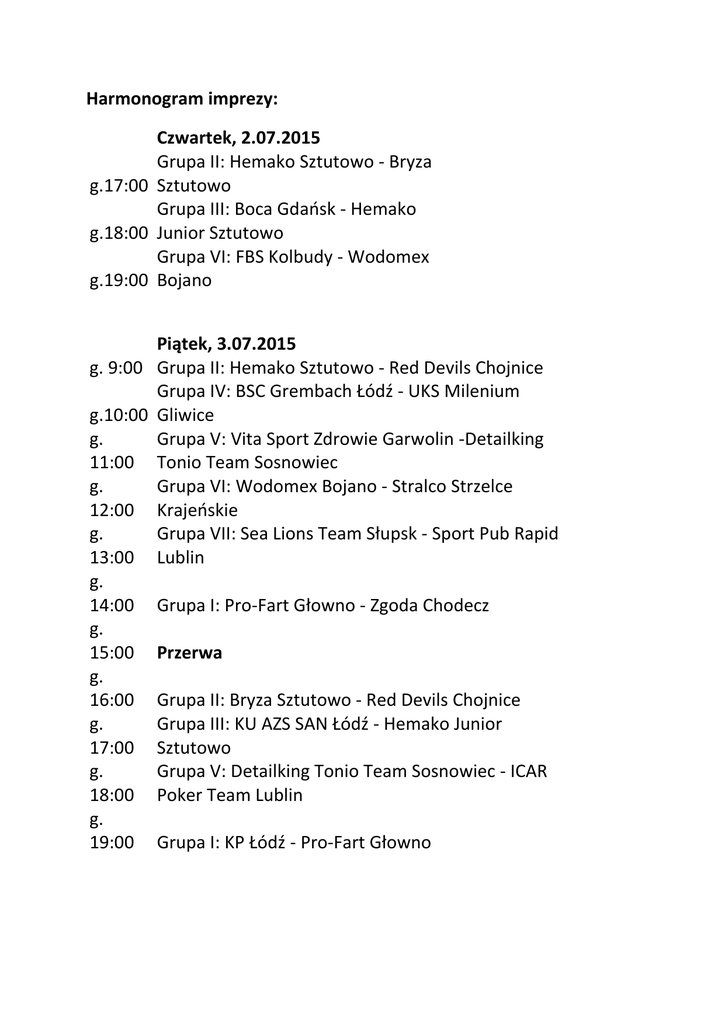 Harmonogram imprezy: Czwartek, 2.07.2015 Grupa II: Hemako Sztutowo - Bryza g.17:00 Sztutowo Grupa III: Boca Gdańsk - Hemako g.18:00 Junior Sztutowo Grupa VI: FBS Kolbudy - Wodomex g.19:00 Bojano Piątek, 3.07.2015 g. 9:00 Grupa II: Hemako Sztutowo - Red Devils Chojnice Grupa IV: BSC Grembach Łódź - UKS Milenium g.10:00 Gliwice g. Grupa V: Vita Sport Zdrowie Garwolin -Detailking 11:00 Tonio Team Sosnowiec g. Grupa VI: Wodomex Bojano - Stralco Strzelce 12:00 Krajeńskie g. Grupa VII: Sea Lions Team Słupsk - Sport Pub Rapid 13:00 Lublin g. 14:00 Grupa I: Pro-Fart Głowno - Zgoda Chodecz g. 15:00 Przerwa g. 16:00 Grupa II: Bryza Sztutowo - Red Devils Chojnice g. Grupa III: KU AZS SAN Łódź - Hemako Junior 17:00 Sztutowo g. Grupa V: Detailking Tonio Team Sosnowiec - ICAR 18:00 Poker Team Lublin g. 19:00 Grupa I: KP Łódź - Pro-Fart Głowno Sobota, 4.07.2015 g. 9:00 g. 10:00 g. 11:00 g. 12:00 g. 13:00 g. 14:00 g. 15:00 g. 16:00 g. 17:00 g. 18:00 g. 19:00 g.11:00 g.12:00 g.13:30 g.14:30 g.15:15 g.16:15 Gr. III: Boca Gdańsk - KU AZS SAN Łódź Gr. VII: Sport Pub Rapid Lublin - Beckerarena Warszawa Gr. I: KP Łódź - Zgoda Chodecz Gr. VI: FBS Kolbudy - Stralco Strzelce Krajeńskie Gr. V: Vita Sport Zdrowie Garwolin - ICAR Poker Team Lublin Gr. VII: Sea Lions Team Słupsk - Beckerarena Warszawa Przerwa Ćwierćfinał 1: zw. gr. I - najlepsza drużyna z 2. miejsca Ćwierćfinał 2: zwycięzca gr. III - zwycięzca gr. VI Ćwierćfinał 3: zw. gr. IV - zw. gr. V Ćwierćfinał 4: zw. gr. II - zw. gr. VII Niedziela, 5.07.2015 Półfinał 1:zwycięzca Ćwierćfinału 2zwycięzca Ćwierćfinału 4 Półfinał 2: zw. Ćwierćfinału 3 - zw. Ćwierćfinału 1 Przerwa Mecz o 3. miejsce Mecz pokazowy - do potwierdzenia Finał Pucharu Polski Ceremonia zakończenia turnieju Podział na grupy: Grupa I: 1. KP Łódź 2. Pro-Fart Głowno 3. Zgoda Chodecz Grupa II: 1. Hemako Sztutowo 2. Bryza Sztutowo 3. Red Devils Chojnice Grupa III: 1. Boca Gdańsk 2. KU AZS Społecznej Akademii Nauk Łódź 3. Hemako Junior Grupa IV: 1. BSC Grembach Łódź 2. UKS Milenium Gliwice Grupa V: 1. Pro-Vita Zdrowie Garwolin 2. Tonio Team Sosnowiec 3. ICAR Poker Team Lublin Grupa VI: 1. FBS Kolbudy 2. Wodomex Bojano 3. Stralco Strzelce Krajeńskie Grupa VII: 1. TS Team Słupsk 2. Sport Pub Rapid Lublin 3. Beckerarena Warszawa Data: 2 lipca – 5 lipca 2015r. Miejsce rozgrywek:Sopocka plaża – wejście 32/33