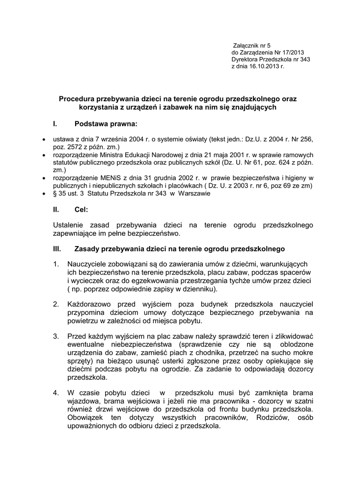 Załącznik nr 5 do Zarządzenia Nr 17/2013 Dyrektora Przedszkola nr 343 z dnia 16.10.2013 r. Procedura przebywania dzieci na terenie ogrodu przedszkolnego oraz korzystania z urządzeń i zabawek na nim się znajdujących I. Podstawa prawna: ustawa z dnia 7 września 2004 r. o systemie oświaty (tekst jedn.: Dz.U. z 2004 r. Nr 256, poz. 2572 z późn. zm.) rozporządzenie Ministra Edukacji Narodowej z dnia 21 maja 2001 r. w sprawie ramowych statutów publicznego przedszkola oraz publicznych szkół (Dz. U. Nr 61, poz. 624 z późn. zm.) rozporządzenie MENiS z dnia 31 grudnia 2002 r. w prawie bezpieczeństwa i higieny w publicznych i niepublicznych szkołach i placówkach ( Dz. U. z 2003 r. nr 6, poz 69 ze zm) § 35 ust. 3 Statutu Przedszkola nr 343 w Warszawie II. Cel: Ustalenie zasad przebywania dzieci na zapewniające im pełne bezpieczeństwo. III. terenie ogrodu przedszkolnego Zasady przebywania dzieci na terenie ogrodu przedszkolnego 1. Nauczyciele zobowiązani są do zawierania umów z dziećmi, warunkujących ich bezpieczeństwo na terenie przedszkola, placu zabaw, podczas spacerów i wycieczek oraz do egzekwowania przestrzegania tychże umów przez dzieci ( np. poprzez odpowiednie zapisy w dzienniku). 2. Każdorazowo przed wyjściem poza budynek przedszkola nauczyciel przypomina dzieciom umowy dotyczące bezpiecznego przebywania na powietrzu w zależności od miejsca pobytu. 3. Przed każdym wyjściem na plac zabaw należy sprawdzić teren i zlikwidować ewentualne niebezpieczeństwa (sprawdzenie czy nie są oblodzone urządzenia do zabaw, zamieść piach z chodnika, przetrzeć na sucho mokre sprzęty) na bieżąco usunąć usterki zgłoszone przez osoby opiekujące się dziećmi podczas pobytu na ogrodzie. Za zadanie to odpowiadają dozorcy przedszkola. 4. W czasie pobytu dzieci w przedszkolu musi być zamknięta brama wjazdowa, brama wejściowa i jeżeli nie ma pracownika - dozorcy w szatni również drzwi wejściowe do przedszkola od frontu budynku przedszkola. Obowiązek ten dotyczy wszystkich pracowników, Rodziców, osób upoważnionych do odbioru dzieci z przedszkola. 5. w przypadku zamknięcia wejścia głównego do budynku przedszkola rodzice i osoby przez nie upoważnione przychodzą po dzieci będące na terenie od strony placu zabaw z pergolą po zachodniej stronie budynku. 6. Dzieci mogą korzystać ze wszystkich zabawek i urządzeń ogrodowych pod warunkiem, że nie stwierdzono w nich żadnych usterek, oraz z tych urządzeń i zabawek tych przy których znajduje się osoba dorosła pilnująca bezpieczeństwa. 7. Dzieci muszą korzystać z urządzeń zgodnie z przeznaczeniem i ustalonymi z nauczycielem normami. 8. W czasie korzystania przez dzieci z pobytu na placu zabaw w czasie realizacji podstawy programowej oraz w godzinach od 13.00 do 16.00 obowiązkowo opiekę nad grupą sprawują w grupach 3 latków nauczyciele i pomoce nauczyciela, w grupach 4 i 5 latków nauczyciele. W przypadku przebywania co najmniej dwóch grup równocześnie na jednym placu zabaw opiekę nad dziećmi sprawuje dodatkowo co najmniej jedna woźna oddziałowa. 9. Poza imprezami organizowanymi przez przedszkole na terenie ogrodu na każdym z placów zabaw w godzinach od 8.00 do 16.00 mogą powinny przebywać maksymalnie dwie grupy dzieci. 10. W czasie korzystania przez dzieci z pobytu na placu zabaw po godzinie 16.00 wszystkie dzieci korzystają już tylko z placu zabaw od strony schodów do ogrodu. Opiekę nad dziećmi sprawują obowiązkowo zawsze nie mniej niż dwie osoby(dwóch nauczycieli lub nauczyciel i pracownik obsługi). Wychodząc z dziećmi do ogrodu w godzinach od 15.30 nauczyciel powinien zwrócić uwagę na to, aby dzieci zabrały ze sobą wszelkie nakrycia zewnętrzne tak aby nie musiały wraz z odbierającym je rodzicem, osobą upoważnioną wchodzić ponownie do budynku przedszkola. 11. Po zgłoszeniu nauczycielowi odbioru dziecka rodzic, osoba przez niego upoważniona może od godziny 16.00 do 18.00 przebywać i sprawować opieką nad dzieckiem na placu zabaw z pergolą od zachodniej strony budynku. Odpowiada ona w pełni za bezpieczeństwo odebranego dziecka i zobowiązuje się, że dziecko będzie korzystało z urządzeń zgodnie z zasadami i przeznaczeniem. 12. Po odebraniu dziecko wraz z opiekunem nie może przemieszczać się już po budynku przedszkola. W przypadku konieczności skorzystania z toalety należy wykorzystywać do tego celu toaletę w dolnym holu budynku przy gabinecie stomatologa. 13. Nauczyciel przy współudziale osoby z obsługi dba o stosowny ubiór dziecka, odpowiedni do pory roku i panującej temperatury. 14. W czasie dużego nasłonecznienia dzieci powinny być zaopatrzone w odpowiednie nakrycie głowy, przebywać w zacienieniu i mieć stały dostęp do wody, która powinna być wystawiona w ogrodzie na stole lub ławce. 15. Nauczyciel nie organizuje zajęć z dziećmi na powietrzu w warunkach atmosferycznych ku temu nie sprzyjających ( deszcz, silny wiatr, zbyt wysoka i niska temperatura, burza). 16. Na terenie ogrodu mogą przebywać tylko dzieci, nauczyciele, osoby upoważnione do odbioru dzieci, rodzice oraz rodzeństwo dziecka. Wyjątkiem są uroczystości przedszkolne na które zapraszane są osoby z zewnątrz. 17. W czasie pobytu na placu zabaw, dziecko może skorzystać z toalety znajdującej się na terenie przedszkola, udając się tam i z powrotem tylko pod opieką osoby z personelu. 18. W razie wypadku nauczyciel w pierwszej kolejności udziela pomocy dziecku poszkodowanemu, po czym powiadamia Dyrekcję Przedszkola. 19. Wszelkie zabawki i urządzenia do zabaw zostały zamontowane zgodnie z procedurami określonym przez producentów i systematycznie monitorowane przez osobę upoważnioną. 20. Podczas nieobecności dzieci w Przedszkolu, piaskownica jest zabezpieczona plandeką przed zwierzętami. Piasek w piaskownicy wymieniany jest raz do roku. 21. Po każdym pobycie na placu zabaw, należy uporządkować wszystkie przenośne zabawki