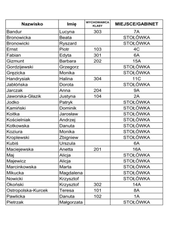 Nazwisko Bandur Bronowicka Bronowicki Ernst Fabian Gizmunt Gordzijewski Gręzicka Handrysiak Jabłóńska Jarczak Jaworska-Głazik Jodko Kamiński Koitka Kościelniak Kotkowska Koziura Kroplewski Kubiś Maciejewska Maj Majewicz Marcinkowska Mikucka Nowicki Okoński Ostropolska-Kurcek Pawlicka Pietrzak Imię WYCHOWAWCA KLASY MIEJSCE/GABINET Lucyna Beata Ryszard Piotr Edyta Barbara Grzegorz Monika Halina Dorota Anna Justyna Patryk Dominik Jarosław Andrzej Danuta Monika Zbigniew Urszula Anetta Alicja Alicja Marta Magdalena Krzysztof Krzysztof Teresa Danuta Małgorzata 303 7A STOŁÓWKA STOŁÓWKA 4C 6A 15A STOŁÓWKA STOŁÓWKA 11C STOŁÓWKA 9A 2A STOŁÓWKA STOŁÓWKA STOŁÓWKA STOŁÓWKA STOŁÓWKA STOŁÓWKA STOŁÓWKA 6A 16A STOŁÓWKA STOŁÓWKA STOŁÓWKA STOŁÓWKA STOŁÓWKA 14A 8A 1A STOŁÓWKA 103 301 202 304 204 104 201 302 101 102 Rutkowska Sirant Skrzypek Smolik Solińska-Mackiewicz Starzyński Suchorowska-Rybiałek Szatkowska Szuniewicz Świerczyńska Walicka Wichowska Anna Marzena Ewa Bożena Aurelia Sławomir Alicja Agnieszka Izabela Agnieszka Beata Katarzyna 105 203 STOŁÓWKA 6C GABINET PEDAGOGA STOŁÓWKA GABINET PEDAGOGA STOŁÓWKA STOŁÓWKA STOŁÓWKA 3A STOŁÓWKA STOŁÓWKA STOŁÓWKA
