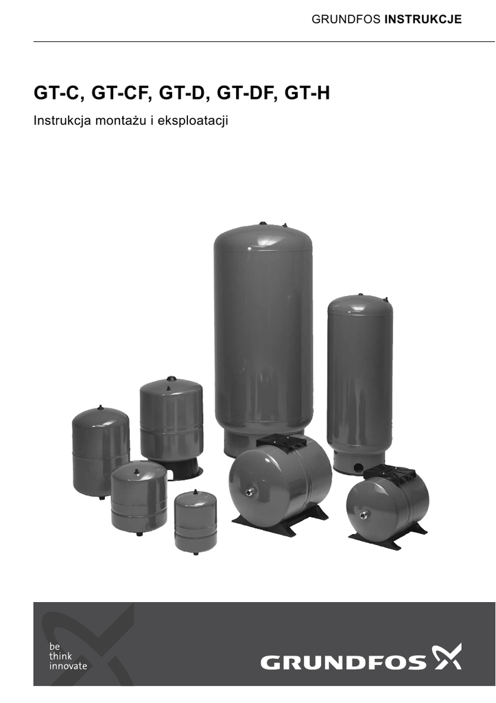 GRUNDFOS INSTRUKCJE GT-C, GT-CF, GT-D, GT-DF, GT-H Instrukcja montażu i eksploatacji Oryginał instrukcji montażu i eksploatacji. 2. Opis ogólny SPIS TREŚCI Zbiorniki Grundfos GT-H, GT-C, GT-D, GT-DF i GT-CF nadają się do stabilizacji ciśnienia zarówno w instalacjach domowych jak i przemysłowych. Strona 1. Symbole stosowane w tej instrukcji 2 2. 2.1 Opis ogólny Obszary zastosowań 2 2 3. Tabliczka znamionowa 3 4. Montaż 4.1 Podnoszenie zbiornika 4.2 Montaż 4.3 Ciśnienie wstępne 4.4 Kontrola instalacji 4.5 Zawory odcinające 4.6 Maksymalne ciśnienie pracy 4.7 Zawór przelewowy 3 3 3 4 5 5 5 5 5. Konserwacja 5 2.1 Obszary zastosowań 6. Dane techniczne 5 • 7. Przegląd zakłóceń 6 8. Utylizacja 6 Ostrzeżenie Przed montażem należy przeczytać niniejszą instrukcję montażu i eksploatacji. Montaż i eksploatacja muszą być zgodne z przepisami lokalnymi i przyjętymi zasadami dobrej praktyki. 1. Symbole stosowane w tej instrukcji Ostrzeżenie Nieprzestrzeganie tych wskazówek bezpieczeństwa może stworzyć zagrożenie dla życia i zdrowia. UWAGA RADA Nieprzestrzeganie tych wskazówek bezpieczeństwa może być przyczyną wadliwego działania lub uszkodzenia urządzenia. Tu podawane są rady i wskazówki ułatwiające pracę lub zwiększające pewność eksploatacji. TM05 1645 3411 Polski (PL) Polski (PL) Instrukcja montażu i eksploatacji Rys. 1 Przykład zbiornika GT-H GT-H jest zbiornikiem membranowym do stosowania w instalacjach zimnej wody. Wersja pozioma ma płytę podstawy służącą do montażu pompy. • GT-C jest zbiornikiem kompozytowym dla szerokiego zakresu zastosowań. • GT-CF jest zbiornikiem kompozytowym z technologią FlowThru do stosowania w instalacjach zimnej wody. • GT-D jest zbiornikiem odpornym na chlor z podwójną membraną. • GT-DF jest zbiornikiem z podwójną membraną z technologią FlowThru. Tabela poniżej pokazuje typy zbiorników odpowiednie dla danego zastosowania. Typ zbiornika Zastosowanie GTC GTH GTCF GTD GTDF Woda pitna ● ● ● ● ● Ścieki szare* ● ● - ● - Woda morska ● - - - - ● Zalecane. - Nie zalecane. * Ścieki szare są ściekami domowymi, np. pochądzącymi ze zmywarek, pralek i kabin prysznicowych. 2 4. Montaż Przed montażem sprawdzić: • Czy dane techniczne dostarczonego zbiornika są zgodne z zamówieniem? • Czy żadna z widocznych części nie jest uszkodzona? • Czy maksymalne ciśnienie instalacji jest niższe lub równe maksymalnemu ciśnieniu pracy zbiornika GT? Patrz tabliczka znamionowa zbiornika. 1 6 Part Number: Type: Model Number: Con¿g: Max. Working Pressure: PS Test Pressure: Factory Precharge: Connection: Nominal Volume: Max. Temperature: TS 7 Prod. Year/Week: 2 3 4 5 L60LH-14-1 17 16 15 14 13 4.1 Podnoszenie zbiornika Made in Taiwan Duże zbiorniki mają na górze przyspawane kołnierze/nakrętę, gdzie ucho do podciągania może być zamontowane. Kiedy zbiornik znajdzie się na podłodze i zostanie do niej zamontowany, ucho do podnoszenia może zostać zdemontowane. Serial Number 12 Production Site: TankPAC Industries 8 11 4.2 Montaż 10 Water Mark ATS5200.485 AGA 60044 COLD WATER APPLICATIONS 9 Rys. 2 Poz. Przykład tabliczki znamionowej Opis 1 Numer katalogowy 2 Numer modelu 3 Maks. ciśnienie robocze 4 Ustawienia fabryczne ciśnienia wstępnego 5 Pojemność całk. zbiornika 6 Kod produkcji (rok i tydzień) 7 Numer seryjny 8 Oznaczenia 9 Producent 10 Oznaczenie obudowy 11 Regulacja ciśnienia wstępnego 12 Zakład produkcji 13 Maks. temperatura robocza 14 Połączenia gwintowe 15 Ciśnienie próbne 16 Kod konfiguracji 17 Oznaczenie typu TM05 5792 4012 Global Water Solutions Ltd. Precharge Instructions: 1. Turn the power and water supply off, then turn on a tap to drain the tank before adjusting precharge. 2. For a pressure switch controlled pump with a differential set up to 30 psi (2.0 bar), the precharge should be set to 2 psi (0.2 bar) below the cut-in pressure. 3. For a pump controlled by a pressure switch with a pressure differential greater than 30 psi (2.0 bar), electronic controls or variable speed controls, the tank precharge should be set to 65% of cut-out or max system pressure. 4. For pressure tanks installed on main pressure, the tank precharge should be set equal to the main pressure. 5. For hot water expansion applications, the tank precharge should be set equal to the system ¿ll pressure or the main pressure. Zbiornik GT należy zawsze montować jak najbliżej pompy na kolektorze tłocznym. Zamontować zbiornik GT w pomieszczeniu zabezpieczonym przed mrozem. Musi istnieć możliwość dokonywania kontroli zbiornika GT ze wszystkich stron. Zawór napowietrzający, zawór odcinający wodę i zawór odpływu muszą być dostępne, a tabliczka znamionowa widoczna. Zamontować poprawnie zbiornik GT na rurociągu. Jeśli występują wibracje, zaleca się aby zbiornik GT był tak zamontowany aby drgania były absorbowane. Zaleca się następujące czynności: 1. Podnieść i ustawić zbiornik GT. 2. Wypoziomować jeśli jest to wymagane (w poziomie i w pionie). 3. Zabezpieczyć zbiornik GT. 4. Połączyć rury i armaturę. 5. Sprawdzić/ustawić ciśnienie wstępne. 6. Uruchomić pompę lub instalację. Nie są dozwolone żadne dodatkowe obciążenia z instalacji rurowej. 3 Polski (PL) 3. Tabliczka znamionowa 4.3 Ciśnienie wstępne Zbiorniki GT są dostarczane z fabryki z ciśnieniem wstępnym. Patrz tabliczka znamionowa zbiornika. Ciśnienie wstępne musi być wyregulowane zgodnie z aktualną instalacją oraz zamontowaną pompy. Powinno wynosić delikatnie poniżej ustawionego ciśnienia załączenia pompy. Zalecane ciśnienie wstępne: • 0,9 x wartość zadana dla pomp zał./wył. • 0,7 x wartość zadana dla pomp ze zmienną prędkością obr. Rys. 3 Montaż zbiornika z podstawą stalową 0,7 x wartość zadana Wartość zadana Wartość zadana Prędkość stała Zmienna prędkość obrotowa Rys. 6 Ciśnienie wstępne 4.3.1 Regulacja ciśnienia wstępnego