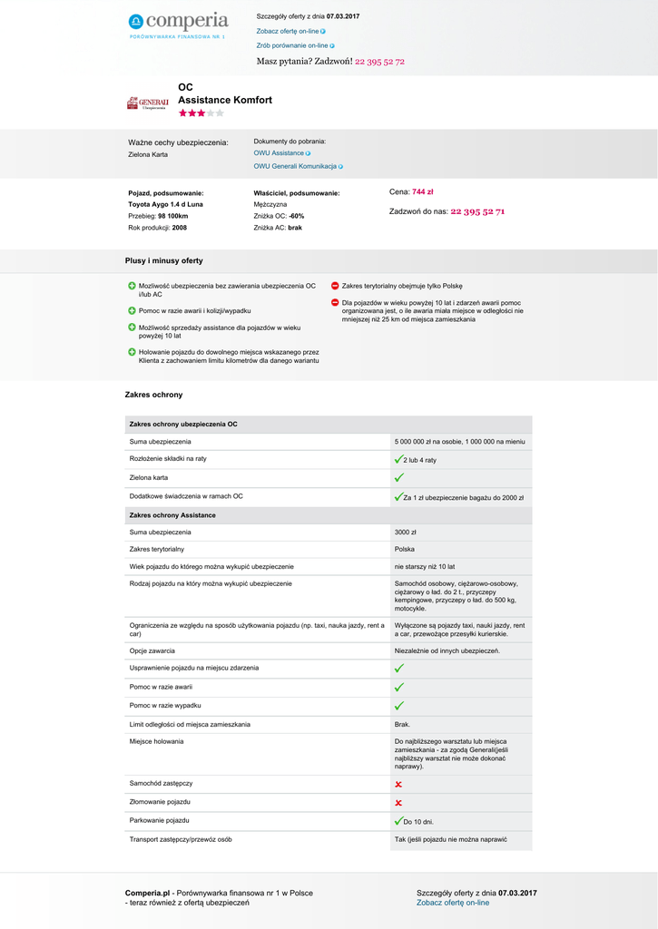Szczegóły oferty z dnia 07.03.2017 Zobacz ofertę on-line Zrób porównanie on-line Masz pytania? Zadzwoń! 22 395 52 72 OC Assistance Komfort Ważne cechy ubezpieczenia: Dokumenty do pobrania: Zielona Karta OWU Assistance OWU Generali Komunikacja Pojazd, podsumowanie: Właściciel, podsumowanie: Toyota Aygo 1.4 d Luna Mężczyzna Przebieg: 98 100km Zniżka OC: -60% Rok produkcji: 2008 Zniżka AC: brak Cena: 744 zł Zadzwoń do nas: 22 395 52 71 Plusy i minusy oferty Mozliwość ubezpieczenia bez zawierania ubezpieczenia OC i/lub AC Pomoc w razie awarii i kolizji/wypadku Zakres terytorialny obejmuje tylko Polskę Dla pojazdów w wieku powyżej 10 lat i zdarzeń awarii pomoc organizowana jest, o ile awaria miała miejsce w odległości nie mniejszej niż 25 km od miejsca zamieszkania Możliwość sprzedaży assistance dla pojazdów w wieku powyżej 10 lat Holowanie pojazdu do dowolnego miejsca wskazanego przez Klienta z zachowaniem limitu kilometrów dla danego wariantu Zakres ochrony Zakres ochrony ubezpieczenia OC Suma ubezpieczenia Rozłożenie składki na raty 5 000 000 zł na osobie, 1 000 000 na mieniu 2 lub 4 raty Zielona karta Dodatkowe świadczenia w ramach OC Za 1 zł ubezpieczenie bagażu do 2000 zł Zakres ochrony Assistance Suma ubezpieczenia 3000 zł Zakres terytorialny Polska Wiek pojazdu do którego można wykupić ubezpieczenie nie starszy niż 10 lat Rodzaj pojazdu na który można wykupić ubezpieczenie Samochód osobowy, ciężarowo-osobowy, ciężarowy o ład. do 2 t., przyczepy kempingowe, przyczepy o ład. do 500 kg, motocykle. Ograniczenia ze względu na sposób użytkowania pojazdu (np. taxi, nauka jazdy, rent a car) Wyłączone są pojazdy taxi, nauki jazdy, rent a car, przewożące przesyłki kurierskie. Opcje zawarcia Niezależnie od innych ubezpieczeń. Usprawnienie pojazdu na miejscu zdarzenia Pomoc w razie awarii Pomoc w razie wypadku Limit odległości od miejsca zamieszkania Brak. Miejsce holowania Do najbliższego warsztatu lub miejsca zamieszkania - za zgodą Generali(jeśli najbliższy warsztat nie może dokonać naprawy). Samochód zastępczy Złomowanie pojazdu Parkowanie pojazdu Transport zastępczy/przewóz osób Comperia.pl - Porównywarka finansowa nr 1 w Polsce - teraz również z ofertą ubezpieczeń Do 10 dni. Tak (jeśli pojazdu nie można naprawić Szczegóły oferty z dnia 07.03.2017 Zobacz ofertę on-line Szczegóły oferty z dnia 07.03.2017 Zobacz ofertę on-line Zrób porównanie on-line Masz pytania? Zadzwoń! 22 395 52 72 pojazdu w ciągu 3 dni). Nocleg/zakwaterowanie Do 3 dób (jeśli zdarzenie ma miejsce w odległości większej niż 75 km od miejsca zamieszkania). Dodatkowe informacje Comperia.pl - Porównywarka finansowa nr 1 w Polsce - teraz również z ofertą ubezpieczeń Powered by TCPDF (www.tcpdf.org) Szczegóły oferty z dnia 07.03.2017 Zobacz ofertę on-line