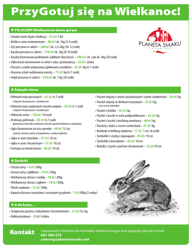 zzPOLECAMY Wielkanocne dania gorące •Swojski żurek śląski z kiełbasą – 21 zł / 1 litr •Królik w sosie śmietanowym – 90 zł / ok. 1kg (5-6 osób) •Gęś pieczona w całości – 260 zł / ok. 3,5-4kg (10-12 osób) •Kaczka pieczona w całości – 170 zł / ok. 2kg (8-10 osób) •Kaczka faszerowana podrobami i jabłkiem (bez kości) – 190 zł / szt. cała ok. 4kg (20 osób) •Udka kacze marynowane w winie i soku z pomarańczy – 25 zł / sztuka •Pieczeń z szynki wieprzowej szpikowana czosnkiem – 55 zł / kg (6-7 osób) •Duszony schab nadziewany morelą – 77 zł / kg (6-7 osób) •Indyk pieczony w całości – 210 zł / ok. 7 kg (30 osób) zzZakąski zimne •Półmisek mięs pieczonych – 65 zł / 6-7 osób z dipami chrzanowym i czosnkowym •Pasztet mięsny z sosem żurawinowym i sosem cumberland – 28 zł / kg •Pasztet mięsny ze śliwkami suszonymi – 25 zł / kg oraz sosem tatarskim •Półmisek mięs wędzonych (wyrób swojski) – 65 zł / 6-7 osób z dipami chrzanowym i czosnkowym •Półmisek serów – 130 zł / 10 osób •Drobiowy półmisek – 83 zł / 6-7 osób galantyna z kurczaka, balotyna z kaczki, pasztet drobiowy z pistacjami •Jajka faszerowane na trzy sposoby – 40 zł / 12 szt. z pastą z łososia, pasta szczypiorkowa, szynka wędzona •Jajka w sosie tatarskim – 27 zł / 10 szt. •Jajka w sosie chrzanowym – 27 zł / 10 szt. •Fantazja na temat łososia – 44 zł / 10 szt. •Pasztet z królika – 43 zł / kg •Pasztet z kaczki w sosie podgrzybkowym – 65 zł / kg •Pasztet z kaczki z konfiturą morelową – 40 zł / kg •Pasztety z dzika z sosem cumberland – 57 zł / kg •Kulebiak w kiełbasą wędzoną – 17 zł / 1 szt. (6 osób) •Tymbaliki z szynką i szparagami – 45 zł / 10 szt. •Tymbaliki z kurczakiem – 45 zł / 10 szt. •Roladki z szynki z puchem chrzanowym – 23 zł /10 szt. zzDodatki •Chrzan tarty – 9 zł / 200g •Chrzan tarty z jabłkiem – 10 zł / 200g •Wielkanocny chrzan z ćwikłą – 10 zł / 200g •Wielkanocny chrzan z jajkiem – 10 zł / 200g •Śliwki wędzone – 12 zł / 200g •Kapusta kiszona zasmażana z suszonymi grzybami – 7 zł /200g (2 osoby) zzA do kawy… •Świąteczna pascha z rodzynkami i brzoskwiniami – 31 zł / 0,5 kg •Babka piaskowa – 28 zł / sztuka Kontakt Zapraszamy Państwa do kontaktu telefonicznego oraz poprzez pocztę e-mail 881 000 233 [email protected]