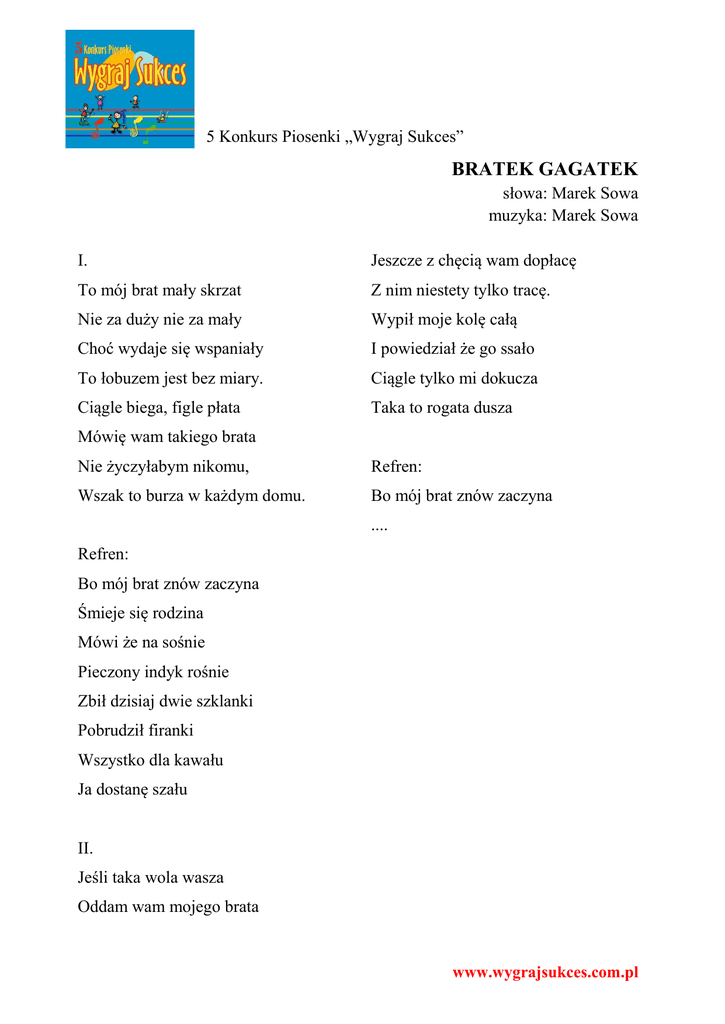 5 Konkurs Piosenki „Wygraj Sukces” BRATEK GAGATEK słowa: Marek Sowa muzyka: Marek Sowa I. Jeszcze z chęcią wam dopłacę To mój brat mały skrzat Z nim niestety tylko tracę. Nie za duży nie za mały Wypił moje kolę całą Choć wydaje się wspaniały I powiedział że go ssało To łobuzem jest bez miary. Ciągle tylko mi dokucza Ciągle biega, figle płata Taka to rogata dusza Mówię wam takiego brata Nie życzyłabym nikomu, Refren: Wszak to burza w każdym domu. Bo mój brat znów zaczyna .... Refren: Bo mój brat znów zaczyna Śmieje się rodzina Mówi że na sośnie Pieczony indyk rośnie Zbił dzisiaj dwie szklanki Pobrudził firanki Wszystko dla kawału Ja dostanę szału II. Jeśli taka wola wasza Oddam wam mojego brata www.wygrajsukces.com.pl