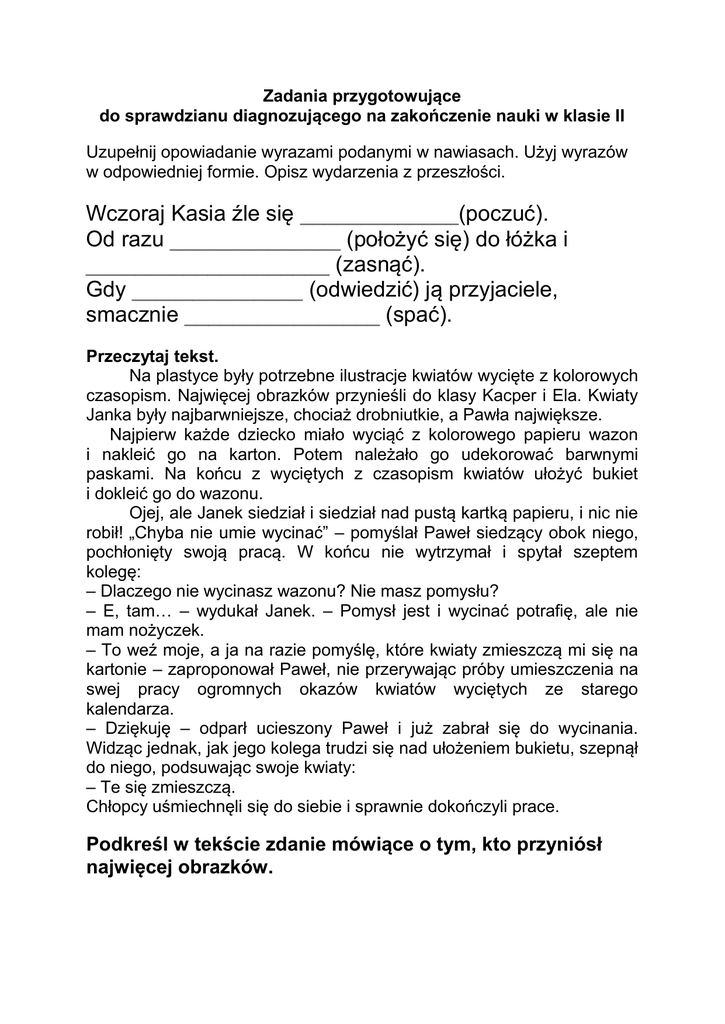 Zadania przygotowujące do sprawdzianu diagnozującego na zakończenie nauki w klasie II Uzupełnij opowiadanie wyrazami podanymi w nawiasach. Użyj wyrazów w odpowiedniej formie. Opisz wydarzenia z przeszłości. Wczoraj Kasia źle się _____________(poczuć). Od razu ______________ (położyć się) do łóżka i ____________________ (zasnąć). Gdy ______________ (odwiedzić) ją przyjaciele, smacznie ________________ (spać). Przeczytaj tekst. Na plastyce były potrzebne ilustracje kwiatów wycięte z kolorowych czasopism. Najwięcej obrazków przynieśli do klasy Kacper i Ela. Kwiaty Janka były najbarwniejsze, chociaż drobniutkie, a Pawła największe. Najpierw każde dziecko miało wyciąć z kolorowego papieru wazon i nakleić go na karton. Potem należało go udekorować barwnymi paskami. Na końcu z wyciętych z czasopism kwiatów ułożyć bukiet i dokleić go do wazonu. Ojej, ale Janek siedział i siedział nad pustą kartką papieru, i nic nie robił! „Chyba nie umie wycinać” – pomyślał Paweł siedzący obok niego, pochłonięty swoją pracą. W końcu nie wytrzymał i spytał szeptem kolegę: – Dlaczego nie wycinasz wazonu? Nie masz pomysłu? – E, tam… – wydukał Janek. – Pomysł jest i wycinać potrafię, ale nie mam nożyczek. – To weź moje, a ja na razie pomyślę, które kwiaty zmieszczą mi się na kartonie – zaproponował Paweł, nie przerywając próby umieszczenia na swej pracy ogromnych okazów kwiatów wyciętych ze starego kalendarza. – Dziękuję – odparł ucieszony Paweł i już zabrał się do wycinania. Widząc jednak, jak jego kolega trudzi się nad ułożeniem bukietu, szepnął do niego, podsuwając swoje kwiaty: – Te się zmieszczą. Chłopcy uśmiechnęli się do siebie i sprawnie dokończyli prace. Podkreśl w tekście zdanie mówiące o tym, kto przyniósł najwięcej obrazków. Pokoloruj prawidłowe dokończenie każdego zdania. Maj to miesiąc letni. wiosenny. jesienny. Kwiaty Pawła były największe. najmniejsze. najdrobniejsze. Zapisz pełnym zdaniem odpowiedź na pytanie. Co dzieci miały przynieść na plastykę? ………………………………………………………………………………………………… Co dzieci miały wykonać na plastyce? • Duże i małe kwiaty z papieru. • Kolorowy wazon z czasopisma. • Bukiet kwiatów w wazonie. Dlaczego Paweł nie mógł wykonać swojej pracy? • Nie miał nożyczek. • Nie umiał wycinać. • Nie przyniósł obrazków. Kto pomógł Pawłowi? • Ola. • Janek. • Bartek. Ustal kolejność etapów wykonania pracy plastycznej zgodnie z tekstem. Ponumeruj te etapy, wpisując liczby od 1 do 5. _____ Naklejenie wazonu na karton. _____ Doklejenie bukietu do wazonu. _____ Dekorowanie wazonu. _____ Wycinanie wazonu. _____ Układanie bukietu z kwiatów. Ułóż trzy zdania do obrazka i zapisz je w liniaturze. Każde zdanie powinno składać się z co najmniej trzech wyrazów. Uzupełnij wyrazy brakującymi literami. ch/h …leb ż/rz u/ó bu…a g…ra rz/ż d…ewo ci/ć bo…an Podziel wyrazy na sylaby: Przykład: koza ko – za łopatka - …………………… czekolada - ………………………. W podanym zdaniu podkreśl samogłoski. Zapowiada się słoneczny dzień. Ile głosek, ile sylab, a ile wyrazów jest w podanym zdaniu? Uzupełnij odpowiedź. Wczoraj wieczorem padał ulewny deszcz. To zdanie ma . . . . .. . głosek, . . . . .. . . sylab i . . . . . wyrazów. Ułóż zdanie z podanych wyrazów i starannie przepisz je w liniach. czyta w deszczu najczęściej książki czasie Wojtek Odpowiedz na pytania dotyczące bezpieczeństwa w czasie wakacji. Podkreśl TAK lub NIE. Czy 997 to numer telefonu do pogotowia ratunkowego? TAK NIE Czy wolno przejść po pasach na drugą stronę ulicy, kiedy w pobliżu nie stoi policjant? TAK NIE Czy w czasie burzy należy chować się pod drzewem? TAK NIE Napisz 2 czynności, które należy wykonywać zwłaszcza wiosną, żeby rośliny w ogrodzie dobrze się rozwijały. Dokończ laurkę. Wpisz życzenia dla cioci z okazji jej imienin.