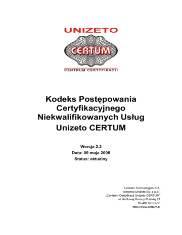 Kodeks Postępowania Certyfikacyjnego Niekwalifikowanych Usług Unizeto CERTUM Wersja 2.2 Data: 09 maja 2005 Status: aktualny Unizeto Technologies S.A. (dawniej Unizeto Sp. z o.o.) „Centrum Certyfikacji Unizeto CERTUM” ul. Królowej Korony Polskiej 21 70-486 Szczecin http://www.certum.pl Kodeks Postępowania Certyfikacyjnego Niekwalifikowanych Usług Unizeto CERTUM, wersja 2.2 Klauzula: Prawa Autorskie © Copyright 2002-2005 Unizeto Technologies S.A. Wszelkie prawa zastrzeżone. Unizeto CERTUM oraz Certum są zastrzeżonymi znakami towarowymi Unizeto Technologies S.A. Logo Unizeto CERTUM i Unizeto są znakami towarowymi i serwisowymi Unizeto Technologies S.A. Pozostałe znaki towarowe i serwisowe wymienione w tym dokumencie są własnością odpowiednich właścicieli. Bez pisemnej zgody Unizeto Technologies S.A. nie wolno wykorzystywać tych znaków w celach innych niż informacyjne, to znaczy bez czerpania z tego tytułu korzyści finansowych lub pobierania wynagrodzenia w dowolnej formie. Niniejszym firma Unizeto Technologies S.A. zastrzega sobie wszelkie prawa do publikacji, wytworzonych produktów i jakiejkolwiek ich części zgodnie z prawem cywilnym i handlowym, w szczególności z tytułu praw autorskich i praw pokrewnych, znaków towarowych. Nie ograniczając praw wymienionych w tej klauzuli, żadna część niniejszej publikacji nie może być reprodukowana lub rozpowszechniana w systemach wyszukiwania danych lub przekazywana w jakiejkolwiek postaci ani przy użyciu żadnych środków (elektronicznych, mechanicznych, fotokopii, nagrywania lub innych) lub w inny sposób wykorzystywana w celach komercyjnych, bez uprzedniej pisemnej zgody Unizeto Technologies S.A. Pomimo powyższych warunków, udziela się pozwolenia na reprodukowanie i dystrybucję niniejszego dokumentu na zasadach nieodpłatnych i darmowych, pod warunkiem, że podane poniżej uwagi odnośnie praw autorskich zostaną wyraźnie umieszczone na początku każdej kopii i dokument będzie powielony w pełni wraz z uwagą, iż jest on własnością Unizeto Technologies S.A. Wszelkie pytania związane z prawami autorskimi należy adresować do Unizeto Technologies S.A., ul. Królowej Korony Polskiej 21, 70-486 Szczecin, Polska, tel. +48 91 4801 201, fax +48 91 4801 220, email: [email protected]. Kodeks Postępowania Certyfikacyjnego Niekwalifikowanych Usług Unizeto CERTUM, wersja 2.2 I Spis treści 1. Wstęp .................................................................................................1 1.1. Wprowadzenie ......................................................................................... 2 1.2. Nazwa dokumentu i jego identyfikacja.................................................. 4 1.3. Strony Kodeksu Postępowania Certyfikacyjnego................................ 4 1.3.1. Urzędy certyfikacji............................................................................ 5 1.3.1.1. Główny urząd certyfikacji Certum CA...........................................5 1.3.1.2. Pośrednie urzędy certyfikacji........................................................5 1.3.2. Urząd znacznika czasu .................................................................... 6 1.3.3. Urząd weryfikacji statusu certyfikatu................................................ 7 1.3.4. Punkty rejestracji ............................................................................. 7 1.3.5. Repozytorium................................................................................... 8 1.3.6. Użytkownicy końcowi ....................................................................... 9 1.3.6.1. Subskrybenci................................................................................9 1.3.6.2. Strony ufające ..............................................................................9 1.4. Zakres stosowania certyfikatów ............................................................ 9 1.4.1. Typy certyfikatów i zalecane obszary ich zastosowań ................... 11 1.4.2. Rekomendowane aplikacje ............................................................ 14 1.4.3. Nierekomendowane aplikacje ........................................................ 15 1.5. Kontakt................................................................................................... 15 2. Postanowienia ogólne ....................................................................16 2.1. Zobowiązania ........................................................................................ 16 2.1.1. Zobowiązania Unizeto CERTUM i punktów rejestracji................... 16 2.1.2. Zobowiązania punktów rejestracji .................................................. 18 2.1.3. Zobowiązania subskrybenta końcowego ....................................... 19 2.1.4. Zobowiązania stron ufających........................................................ 21 2.1.5. Zobowiązania repozytorium ........................................................... 23 2.2. Odpowiedzialność................................................................................. 23 2.2.1. Odpowiedzialność pośrednich urzędów certyfikacji ....................... 24 2.2.2. Odpowiedzialność punktów rejestracji ........................................... 25 2.2.3. Odpowiedzialność subskrybentów................................................. 25 2.2.4. Odpowiedzialność stron ufających................................................. 25 2.2.5. Odpowiedzialność repozytorium .................................................... 25 2.3. Odpowiedzialność finansowa .............................................................. 26 2.4. Akty prawne i rozstrzyganie sporów ................................................... 26 2.4.1. Obowiązujące akty prawne ............................................................ 26 2.4.2. Postanowienia dodatkowe ............................................................. 26 2.4.2.1. 2.4.2.2. 2.4.2.3. 2.4.2.4. Rozłączność post