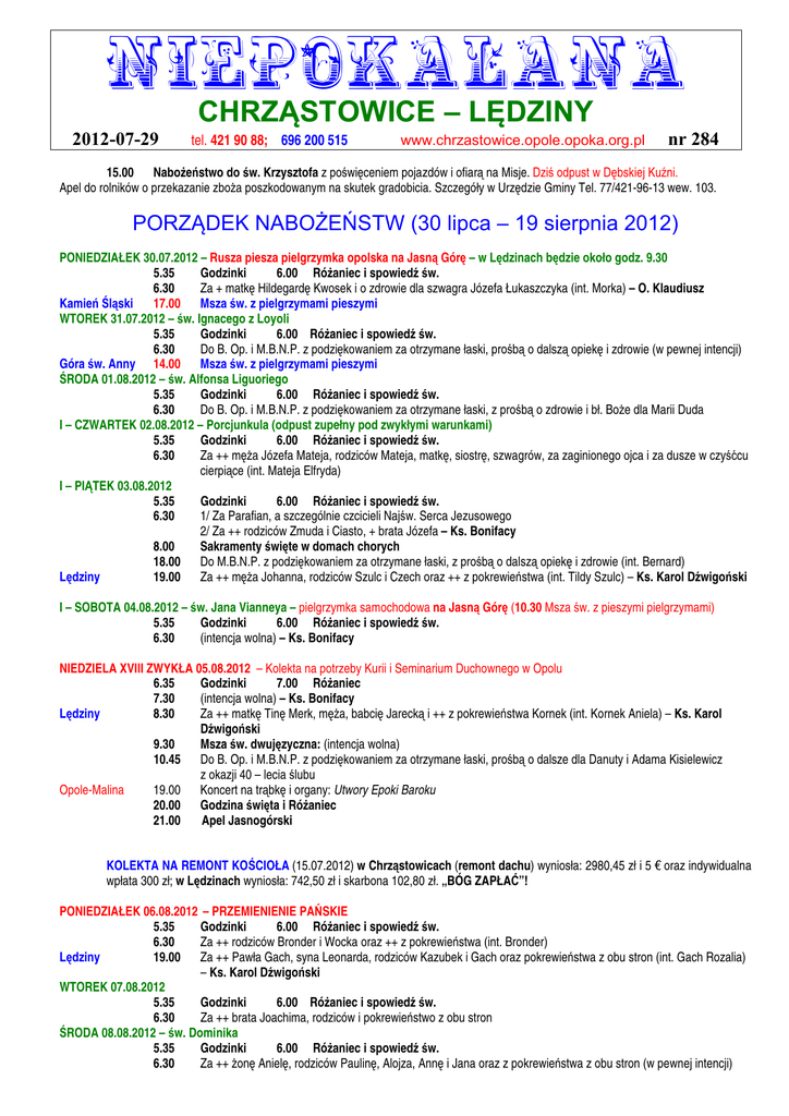 NIEPOKALANA CHRZĄSTOWICE – LĘDZINY 2012-07-29 tel. 421 90 88; 696 200 515 www.chrzastowice.opole.opoka.org.pl nr 284 15.00 NaboŜeństwo do św. Krzysztofa z poświęceniem pojazdów i ofiarą na Misje. Dziś odpust w Dębskiej Kuźni. Apel do rolników o przekazanie zboŜa poszkodowanym na skutek gradobicia. Szczegóły w Urzędzie Gminy Tel. 77/421-96-13 wew. 103. PORZĄDEK NABOŻEŃSTW (30 lipca – 19 sierpnia 2012) PONIEDZIAŁEK 30.07.2012 – Rusza piesza pielgrzymka opolska na Jasną Górę – w Lędzinach będzie około godz. 9.30 5.35 Godzinki 6.00 RóŜaniec i spowiedź św. 6.30 Za + matkę Hildegardę Kwosek i o zdrowie dla szwagra Józefa Łukaszczyka (int. Morka) – O. Klaudiusz Kamień Śląski 17.00 Msza św. z pielgrzymami pieszymi WTOREK 31.07.2012 – św. Ignacego z Loyoli 5.35 Godzinki 6.00 RóŜaniec i spowiedź św. 6.30 Do B. Op. i M.B.N.P. z podziękowaniem za otrzymane łaski, prośbą o dalszą opiekę i zdrowie (w pewnej intencji) Góra św. Anny 14.00 Msza św. z pielgrzymami pieszymi ŚRODA 01.08.2012 – św. Alfonsa Liguoriego 5.35 Godzinki 6.00 RóŜaniec i spowiedź św. 6.30 Do B. Op. i M.B.N.P. z podziękowaniem za otrzymane łaski, z prośbą o zdrowie i bł. BoŜe dla Marii Duda I – CZWARTEK 02.08.2012 – Porcjunkula (odpust zupełny pod zwykłymi warunkami) 5.35 Godzinki 6.00 RóŜaniec i spowiedź św. 6.30 Za ++ męŜa Józefa Mateja, rodziców Mateja, matkę, siostrę, szwagrów, za zaginionego ojca i za dusze w czyśćcu cierpiące (int. Mateja Elfryda) I – PIĄTEK 03.08.2012 5.35 Godzinki 6.00 RóŜaniec i spowiedź św. 6.30 1/ Za Parafian, a szczególnie czcicieli Najśw. Serca Jezusowego 2/ Za ++ rodziców Zmuda i Ciasto, + brata Józefa – Ks. Bonifacy 8.00 Sakramenty święte w domach chorych 18.00 Do M.B.N.P. z podziękowaniem za otrzymane łaski, z prośbą o dalszą opiekę i zdrowie (int. Bernard) Lędziny 19.00 Za ++ męŜa Johanna, rodziców Szulc i Czech oraz ++ z pokrewieństwa (int. Tildy Szulc) – Ks. Karol Dźwigoński I – SOBOTA 04.08.2012 – św. Jana Vianneya – pielgrzymka samochodowa na Jasną Górę (10.30 Msza św. z pieszymi pielgrzymami) 5.35 Godzinki 6.00 RóŜaniec i spowiedź św. 6.30 (intencja wolna) – Ks. Bonifacy NIEDZIELA XVIII ZWYKŁA 05.08.2012 – Kolekta na potrzeby Kurii i Seminarium Duchownego w Opolu 6.35 Godzinki 7.00 RóŜaniec 7.30 (intencja wolna) – Ks. Bonifacy Lędziny 8.30 Za ++ matkę Tinę Merk, męŜa, babcię Jarecką i ++ z pokrewieństwa Kornek (int. Kornek Aniela) – Ks. Karol Dźwigoński 9.30 Msza św. dwujęzyczna: (intencja wolna) 10.45 Do B. Op. i M.B.N.P. z podziękowaniem za otrzymane łaski, prośbą o dalsze dla Danuty i Adama Kisielewicz z okazji 40 – lecia ślubu Opole-Malina 19.00 Koncert na trąbkę i organy: Utwory Epoki Baroku 20.00 Godzina święta i RóŜaniec 21.00 Apel Jasnogórski KOLEKTA NA REMONT KOŚCIOŁA (15.07.2012) w Chrząstowicach (remont dachu) wyniosła: 2980,45 zł i 5 € oraz indywidualna wpłata 300 zł; w Lędzinach wyniosła: 742,50 zł i skarbona 102,80 zł. „BÓG ZAPŁAĆ”! PONIEDZIAŁEK 06.08.2012 – PRZEMIENIENIE PAŃSKIE 5.35 Godzinki 6.00 RóŜaniec i spowiedź św. 6.30 Za ++ rodziców Bronder i Wocka oraz ++ z pokrewieństwa (int. Bronder) Lędziny 19.00 Za ++ Pawła Gach, syna Leonarda, rodziców Kazubek i Gach oraz pokrewieństwa z obu stron (int. Gach Rozalia) – Ks. Karol Dźwigoński WTOREK 07.08.2012 5.35 Godzinki 6.00 RóŜaniec i spowiedź św. 6.30 Za ++ brata Joachima, rodziców i pokrewieństwo z obu stron ŚRODA 08.08.2012 – św. Dominika 5.35 Godzinki 6.00 RóŜaniec i spowiedź św. 6.30 Za ++ Ŝonę Anielę, rodziców Paulinę, Alojza, Annę i Jana oraz z pokrewieństwa z obu stron (w pewnej intencji) CZWARTEK 09.08.2012 – św. Teresy Benedykty od KrzyŜa 5.35 Godzinki 6.00 RóŜaniec i spowiedź św. 6.30 Za ++ rodziców Lipok i Strach, siostrę, brata, bratową i 2 szwagrów oraz o zdrowie w rodzinie 18.00 Do B. Op. i M.B.N.P. z podziękowaniem za otrzymane łaski, z prośbą o dalszą opiekę i zdrowie (int. Cichoń Klara) Lędziny 19.00 Do M.B.N.P. z podziękowaniem za otrzymane łaski i prośbą o dalsze zdrowie (int. Krawczyk) – Ks. Karol Dźwigoński PIĄTEK 10.08.2012 – św. Wawrzyńca 5.35 Godzinki 6.00 RóŜaniec i spowiedź św. 6.30 Za ++ męŜa Józefa, rodziców Fikus i Wyrwoł, siostry, szwagrów i ++ z pokrewieństwa (int. Wyrwoł) SOBOTA 11.08.2012 – św. Klary 5.35 Godzinki 6.00 RóŜaniec i spowiedź św. 6.30 Za ++ męŜa Rocha Ciasto, brata Józefa i dusze w czyśćcu cierpiące Lędziny 19.00 Msza św. niedzielna: Do B. Op. i M.B. WspomoŜenia Wiernych z podziękowaniem za otrzymane łaski, prośbą o dalszą opiekę w Ŝyciu i zdrowie (w pewnej intencji) – Ks. Karol Dźwigoński NIEDZIELA XIX ZWYKŁA 12.08.2012 – Kolekta na potrzeby parafii 6.35 Godzinki 7.00 RóŜaniec 7.30 Za ++ rodziców Micheń, + męŜa Eryka (int. Micheń Helga) Lędziny 8.30 – Ks. Karol Dźwigoński 9.30 Msza św. dwujęzyczna: Do B. Op. i M.B.N.P. z podz. za otrzymane łaski, z prośbą o dalsze w rocznicę ślubu (Bartek Rafał) 10.45 Za Parafian 15.00 Nieszpory niedzielne PONIEDZIAŁEK 13.08.2012 5.35 Godzinki 6.00 RóŜaniec i spowiedź św. 6.30 Do B. Op. i M.B. Fatimskiej z podziękowaniem za otrzymane łaski i z prośbą o dalsze oraz za + Ŝonę Erykę i rodziców z obu stron (int. Cebula Stanisław) WTOREK 14.08.2012 – św. Maksymiliana Kolbego 5.35 Godzinki 6.00 RóŜaniec i spowiedź św. 6.30 Za ++ Annę i Wiktora Bronder oraz ++ z pokrewieństwa Anioł ŚRODA 15.08.2012 – UROCZYSTOŚĆ WNIEBOWZIĘCIA NAJŚW. MARYI PANNY – Kolekta na Wydział Teologiczny UO – Odpust w Szczedrzyku 6.35 Godzinki 7.00 RóŜaniec i spowiedź św. 7.30 Do B. Op. z podziękowaniem za otrzymane łaski oraz z prośbą o zdrowie (int. Cebula Karol) – O. Klaudius z Lędziny 8.30 Do B. Op. z podz. za łaski, z prośbą o dalszą opiekę i zdrowie w int. rodziny Włodarczyk – Ks. Karol Dźwigońs