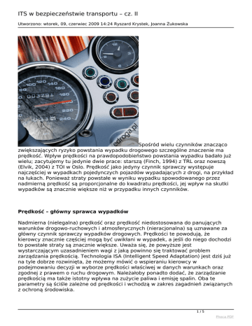 ITS w bezpieczeństwie transportu – cz. II Utworzono: wtorek, 09, czerwiec 2009 14:24 Ryszard Krystek, Joanna Żukowska Spośród wielu czynników znacząco zwiększających ryzyko powstania wypadku drogowego szczególne znaczenie ma prędkość. Wpływ prędkości na prawdopodobieństwo powstania wypadku badało już wielu; zacytujemy tu jedynie dwie prace: starszą (Finch, 1994) z TRL oraz nowszą (Elvik, 2004) z TOI w Oslo. Prędkość jako jedyny czynnik sprawczy występuje najczęściej w wypadkach pojedynczych pojazdów wypadających z drogi, na przykład na łukach. Ponieważ straty powstałe w wyniku wypadku spowodowanego przez nadmierną prędkość są proporcjonalne do kwadratu prędkości, jej wpływ na skutki wypadków są znacznie większe niż w przypadku innych czynników. Prędkość – główny sprawca wypadków Nadmierna (nielegalna) prędkość oraz prędkość niedostosowana do panujących warunków drogowo-ruchowych i atmosferycznych (nieracjonalna) są uznawane za główny czynnik sprawczy wypadków drogowych. Prędkości te powodują, że kierowcy znacznie częściej mogą być uwikłani w wypadek, a jeśli do niego dochodzi to powstałe straty są znacznie większe. Uważa się, że powyższe jest wystarczającym uzasadnieniem wagi z jaką powinno się traktować problem zarządzania prędkością. Technologia ISA (Intelligent Speed Adaptation) jest dziś już na tyle dobrze rozwinięta, że możemy mówić o wspieraniu kierowcy w podejmowaniu decyzji w wyborze prędkości właściwej w danych warunkach oraz zgodnej z prawem o ruchu drogowym. Należałoby ponadto dodać, że zarządzanie prędkością ma także istotny wpływa na zużycie paliwa i emisję spalin. Oba te parametry są ściśle zależne od prędkości i wchodzą w zakres zagadnień związanych z ochroną środowiska. 1/5 Phoca PDF ITS w bezpieczeństwie transportu – cz. II Utworzono: wtorek, 09, czerwiec 2009 14:24 Ryszard Krystek, Joanna Żukowska ISA jest zaawansowaną technologią dostarczającą kierowcy w pojeździe informacji na temat ograniczeń prędkości. Przy obecnym zaawansowaniu technologii GPS jest to konfrontowane z mapą numeryczną zainstalowaną w samochodzie. Kierowca zatem może być informowany o lokalnym ograniczeniu prędkości (najczęściej), a nawet upominany dźwiękiem, że przekroczył dozwoloną prędkość. Badania przeprowadzone w Wielkiej Brytanii wykazały, że proste uprzedzenie kierowcy o zbliżaniu się do lokalnego ograniczenia prędkości może zmniejszyć liczbę śmiertelnych ofiar ruchu drogowego o 18%. Podczas gdy w przypadku urządzenia nowoczesnego aż o 37%. Prace naukowe z innych krajów UE wskazują, że powszechne zastosowanie ISA w pojazdach może przynieść zmniejszenie liczby śmiertelnych ofiar z powodu nadmiernej prędkości nawet o połowę. Jeszcze przed kilkoma laty, tuż po zakończeniu projektu PROSPER (www.prosper-eu.nl), dość sceptycznie wyrażano się o przyszłości ISA. Chodziło głównie o brak zainteresowania przemysłu motoryzacyjnego instalowaniem ISA w nowych samochodach, również rządy krajów członkowskich nie wykazywały specjalnego zainteresowania instalowaniem ISA. Oznacza to, że ubiegłoroczna decyzja Komisji Europejskiej, wspomniana na początku artykułu, stanowi istotny przełom. Wiadomo bowiem, że ISA nie może dobrze funkcjonować bez ufnej bazy danych. Ponadto konieczna jest harmonizacja wymagań technicznych oraz jednolitość kryteriów oceny efektywności stosowanych rozwiązań. Carsten (2005) opracował dwa scenariusze rozwoju sytuacji, które przetestował na bazie sześciu krajów europejskich (Belgia, Francja, Hiszpania, Szwecja, Holandia i Wielka Brytania) i wykazał, że: jeśli każdy kraj prawem skłoni do używania ISA w każdym samochodzie, to do roku 2050 będzie można zmniejszyć liczbę śmiertelnych ofiar o 26-50%, zależnie od kraju (scenariusz rządowy), jeśli zaś wdrożenie ISA będzie dobrowolne, jako efekt podaży rynkowej, to w tym samym czasie osiągniemy zaledwie 19 do 28% redukcji liczby ofiar (scenariusz rynkowy). Przyjęto także, iż w pierwszym etapie scenariusza rządowego zastosuje się taktykę „kija i marchewki”; oznacza to, że przymusowo ISA zastosują w swych samochodach kierowcy notorycznie karani za przekroczenie prędkości, zaś jako zachętę dla zainstalowania ISA przyjmie się zniżkę podatkową. Także środki ulicznego transportu publicznego będą w pierwszej kolejności wyposażane w ISA. Jednym z głównych zarzutów stawianych ISA jest koszt budowy i eksploatacji systemu. Tymczasem analizy CBA wykonane we wspomnianych sześciu krajach wykazały, że efektywność (stosunek korzyści do nakładów) przewidywana w okresie 45 lat może wynieść od 2:1 do 4,8:1, zależnie od kraju i przyjętego scenariusza: jeśli każdy kraj zachęci kierowców do stosowania ISA, a po osiągnięciu 90% zmusi prawem pozostałe 10%, to powinien to osiągnąć w 2035 roku i uzyskać wskaźnik efektywności do 4,8:1, jeśli zaś przyjmie scenariusz rynkowy, to przy poziomie nasycenia 40-60% 2/5 Phoca PDF ITS w bezpieczeństwie transportu – cz. II Utworzono: wtorek, 09, czerwiec 2009 14:24 Ryszard Krystek, Joanna Żukowska uzyska wskaźnik od 2,1 do 3,5:1. W konkluzji syntezy dotychczas prowadzonych badań związanych z prędkością można stwierdzić, że: ograniczenia prędkości są jednym z najczęściej łamanych przepisów drogowych; w Niemczech podaje się dość szeroki przedział, tj. 30-90%, kierowcy nagminnie przekraczający prędkość stanowią pewną grupę użytkowników dróg, którzy łamią inne przepisy, często nie tylko ruchu drogowego; korzyścią zatem, płynącą z zastosowania ISA, będzie kojarzenie kontroli prędkości z innymi rodzajami zachowań. Wyniki badań nad efektywnością ISA (ETSC, 2005), prowadzone poza Europą są bardzo zbliżone do tych, prowadzonych w ostatnich latach w dziesięciu krajach UE i wykazały że ISA: może przyni