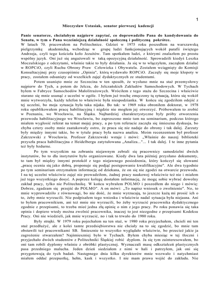 1 Mieczysław Ustasiak, senator pierwszej kadencji Panie senatorze, chciałabym najpierw zapytać, co doprowadziło Pana do kandydowania do Senatu, w tym o Pana wcześniejszą działalność społeczną i polityczną pokrótce. W latach 70. pracowałem na Politechnice. Gdzieś w 1975 roku poszedłem na warszawską pielgrzymkę akademicką, wchodząc w grupę ludzi funkcjonujących wokół parafii świętego Andrzeja, czyli tego kościoła koło Jezuitów. Tam spotkałem ludzi, z którymi znalazłem po prostu wspólny język. Oni już się angażowali w taką opozycyjną działalność. Sprowadzili kiedyś Leszka Moczulskiego z odczytami, właśnie takie to były działania. Ja się w to włączyłem, zacząłem działać w ROPCiO, czyli Ruchu Obrony Praw Człowieka i Obywatela. Zostałem wciągnięty do Komisji Konsultacyjnej przy czasopiśmie „Opinia", którą wydawało ROPCiO. Zaczęły się moje kłopoty w pracy, zostałem odsunięty od wszelkich zajęć dydaktycznych ze studentami. Potem usunięto mnie ze Szczecina w ten sposób, że wysłano mnie na staż przemysłowy najpierw do Tych, a potem do Jelcza, do Jelczańskich Zakładów Samochodowych. W Tychach byłem w Fabryce Samochodów Małolitrażowych. Wróciłem z tego stażu do Szczecina i właściwie starano się mnie usunąć z uczelni w ogóle. I byłem już trochę zmęczony tą sytuacją, która się wokół mnie wytworzyła, każdy telefon to właściwie była niespodzianka. W końcu się zgodziłem odejść z tej uczelni, bo moja sytuacja była taka nijaka. Bo tak: w 1969 roku obroniłem doktorat, w 1978 roku opublikowałem pracę habilitacyjną i nigdzie nie mogłem jej otworzyć. Próbowałem to zrobić w Poznaniu, we Wrocławiu, na Śląsku. Najbardziej charakterystyczne były próby otworzenia przewodu habilitacyjnego we Wrocławiu, bo zaproszono mnie tam na seminarium, podczas którego miałem wygłosić referat na temat mojej pracy, a po tym referacie zaczęła się śmieszna dyskusja, bo chyba cztery osoby mnie zaatakowały ostro, że praca się nie nadaje do obrony i tak dalej. Zarzuty były między innymi takie, bo w tytule pracy była nazwa analiza. Moim recenzentem był profesor Zakrzewski z Wrocławia. Profesor Zakrzewski wstaje i mówi: „Właśnie do naszej biblioteki przyszła praca habilitacyjna z Heidelbergu zatytułowana „Analiza..."... I tak dalej. I te inne pytania też były bzdurne. Po tym wszystkim na zebraniu niejawnym zebrali się pracownicy samodzielni dwóch instytutów, bo to dla instytutów było organizowane. Kiedy dwa lata później przysłano dokumenty, to tam był między innymi protokół z tego niejawnego posiedzenia, który kończył się słowami „pracę ocenia się jako dobrą, proponuje się podjąć postępowanie kwalifikacyjne". Ale dwa tygodnie po tym seminarium otrzymałem informację od dziekana, że on się nie zgodzi na otwarcie przewodu. I na tej uczelni właściwie zajęć nie prowadziłem, żadnej pracy naukowej właściwie też nie i miałem już tego wszystkiego dosyć. A poprzez kolegę dostałem informację, że mogę sobie wybrać dowolny zakład pracy, tylko nie Politechnikę. W końcu wybrałem POLMO i poszedłem do niego i mówię: Dobrze, zgadzam się przejść do POLMO". A on mówi: „To napisz wniosek o zwolnienie". No, to mnie wyprowadziło z równowagi, bo nie dość, że mnie wyrzucają, to jeszcze każą mi prosić ich o to, żeby mnie wyrzucili. Nie podpisałem tego wniosku i właściwie nadal sytuacja była niejasna. Ani to byłem pracownikiem, ani też mnie nie wyrzucili, bo żeby wyrzucić pracownika dydaktycznego zgodnie z przepisami, to trzeba mieć jedna złą opinię o nim z jego pracy. Po roku ponawia się taka opinia i dopiero wtedy można zwolnić pracownika, inaczej to jest niezgodne z przepisami Kodeksu Pracy. Oni nie wiedzieli, jak mnie wyrzucić, no i tak to trwało do 1980 roku. Były strajki. W 1979 roku pojechałem na ten staż, w 1980 roku przyjechałem, chcieli mi ten staż przedłużyć, ale z kolei tamte przedsiębiorstwa nie chciały na to się zgodzić, bo mnie tam obstawili też pracownikami SB. Śmiesznie to wszystko wyglądało właściwie, bo przecież jakie ja zagrożenie stwarzałem? Najśmieszniej było w Tychach. Byłem chyba miesiąc w tej tłoczni i przyjechało dwóch studentów z Politechniki Śląskiej robić dyplom. Ja się tym zainteresowałem, bo oni tam robili dyplomy właśnie z obróbki plastycznej. Wyznaczali masę odkształceń plastycznych pasa przedniego malucha. Jeden dzień siedziałem z nimi w hali i patrzyłem, jak oni się przygotowują do tych badań. Następnego dnia kilku dyrektorów mnie wezwało i natychmiast miałem oddać przepustkę, hełm, kask i wszystko. I nie mam prawa wejść do zakładu. Nie 2 wiedziałem, co się stało. Oni powiedzieli: „Politechnika źle załatwiła pana staż i to dlatego". Przyjechałem do Szczecina i mówię: „Źle załatwiliście". Dopiero po tygodniu się dowiedziałem, że mnie wyrzucili za kontakty z młodzieżą akademicką. Potem z kolei mi przysłali taką panią, która siedziała po drugiej stronie biurka, pani Jola. Nawiasem mówiąc, zanim ona przyszła do tej sekcji (ja byłem w biurze technologicznym, przydzielony do biura technologii obróbki cieplnej), to już przyszli ludzie i ostrzegli mnie, że ona jest. Wiedzieli o mnie, z Wolnej Europy, czytali również dokumenty sygnowane moim podpisem. I pamiętam, jak przyszedł jeden pan do mnie i pyta: „Czy pan się nazywa Ustasiak?". Mówię: „Tak". „A to ja już wszystko wiem". JELCZ powiedział: „Dziękujemy, nie wpuścimy pana". Rektor chciał mi przedłużyć ten staż. Nawiasem mówiąc, ja pracowałem w przemyśle, a ten staż jest przeznaczony dla absolwentów, którzy nie byli w przemyśle, a ja cztery lata przedtem pracowałem w przemyśle, ale to takie naciągane było wszystko. I przyszedł 1980 rok, sierpień, strajki, a potem „Solidarność". Ja byłem przewodniczącym komitetu 