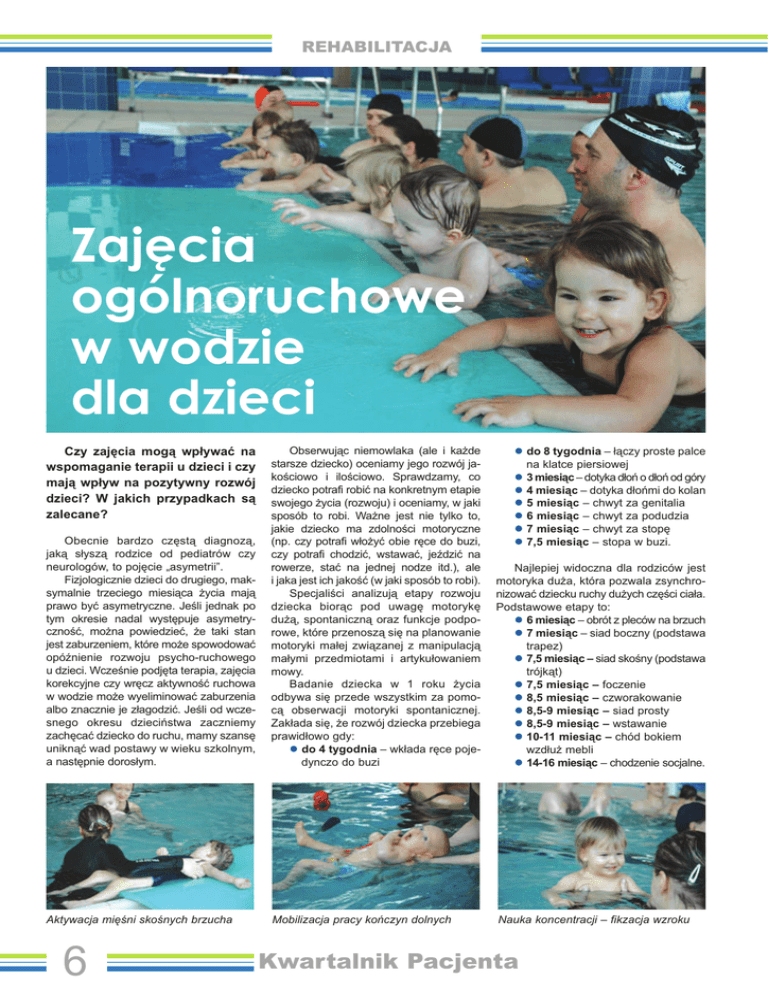 REHABILITACJA Zajęcia ogólnoruchowe w wodzie dla dzieci Obecnie bardzo częstą diagnozą, jaką słyszą rodzice od pediatrów czy neurologów, to pojęcie „asymetrii”. Fizjologicznie dzieci do drugiego, maksymalnie trzeciego miesiąca życia mają prawo być asymetryczne. Jeśli jednak po tym okresie nadal występuje asymetryczność, można powiedzieć, że taki stan jest zaburzeniem, które może spowodować opóźnienie rozwoju psycho-ruchowego u dzieci. Wcześnie podjęta terapia, zajęcia korekcyjne czy wręcz aktywność ruchowa w wodzie może wyeliminować zaburzenia albo znacznie je złagodzić. Jeśli od wczesnego okresu dzieciństwa zaczniemy zachęcać dziecko do ruchu, mamy szansę uniknąć wad postawy w wieku szkolnym, a następnie dorosłym. Obserwując niemowlaka (ale i każde starsze dziecko) oceniamy jego rozwój jakościowo i ilościowo. Sprawdzamy, co dziecko potrafi robić na konkretnym etapie swojego życia (rozwoju) i oceniamy, w jaki sposób to robi. Ważne jest nie tylko to, jakie dziecko ma zdolności motoryczne (np. czy potrafi włożyć obie ręce do buzi, czy potrafi chodzić, wstawać, jeździć na rowerze, stać na jednej nodze itd.), ale i jaka jest ich jakość (w jaki sposób to robi). Specjaliści analizują etapy rozwoju dziecka biorąc pod uwagę motorykę dużą, spontaniczną oraz funkcje podporowe, które przenoszą się na planowanie motoryki małej związanej z manipulacją małymi przedmiotami i artykułowaniem mowy. Badanie dziecka w 1 roku życia odbywa się przede wszystkim za pomocą obserwacji motoryki spontanicznej. Zakłada się, że rozwój dziecka przebiega prawidłowo gdy: l do 4 tygodnia – wkłada ręce pojedynczo do buzi Najlepiej widoczna dla rodziców jest motoryka duża, która pozwala zsynchronizować dziecku ruchy dużych części ciała. Podstawowe etapy to: l 6 miesiąc – obrót z pleców na brzuch l 7 miesiąc – siad boczny (podstawa trapez) l 7,5 miesiąc – siad skośny (podstawa trójkąt) l 7,5 miesiąc – foczenie l 8,5 miesiąc – czworakowanie l 8,5-9 miesiąc – siad prosty l 8,5-9 miesiąc – wstawanie l 10-11 miesiąc – chód bokiem wzdłuż mebli l 14-16 miesiąc – chodzenie socjalne. Aktywacja mięśni skośnych brzucha Mobilizacja pracy kończyn dolnych Nauka koncentracji – fikzacja wzroku Czy zajęcia mogą wpływać na wspomaganie terapii u dzieci i czy mają wpływ na pozytywny rozwój dzieci? W jakich przypadkach są zalecane? 6 l do 8 tygodnia – łączy proste palce na klatce piersiowej l 3 miesiąc – dotyka dłoń o dłoń od góry l 4 miesiąc – dotyka dłońmi do kolan l 5 miesiąc – chwyt za genitalia l 6 miesiąc – chwyt za podudzia l 7 miesiąc – chwyt za stopę l 7,5 miesiąc – stopa w buzi. Kwartalnik Pacjenta REHABILITACJA Nauka podporu na jednym łokciu Relaksacja Symulacja zmiennymi bodźcami Niezwykle istotne dla oceny rozwoju motoryki dziecka jest też badanie reakcji ułożeniowych oraz funkcji podporowych. Badania te pozwalają określić nawet niewielkie zaburzenia w motoryce, które w przyszłości mogą mieć wpływ na rozwój dziecka. różne wielkości policzków (jeden może być bardziej spłaszczony), różna wielkość oczodołów skrócenie jednej ze stron ciała skośne ułożenie miednicy zaburzenia koncentrycznej pracy mięśni brzucha zwracanie głowy częściej w jedną stronę ciała wyciąganie chętniej tylko jednej ręki po zabawkę. podpieranie się tylko na jednym ręku leżąc na brzuchu wkładanie tylko jednej stopy do buzi w leżeniu na plecach. Asymetria nie ćwiczona u niemowląt może u dzieci starszych objawiać się wadami postawy, jak np. skolioza. Ponadto dzieci, które były w okresie niemowlęcym asymetryczne i przez to nie raczkowały, mogą mieć w wieku późniejszym dysleksje, czy problemy z integracją sensoryczną. Objawy asymetrii mogą być widoczne również u dzieci starszych. Starszaki oceniamy w ten sam sposób jak i maluchy. Dlatego jeśli zauważysz u swojego dziecka np.: nierówne trójkąty talii odstające łopatki, położone na różnych wysokościach że chętniej wchodzi po schodach tylko np. prawą nogą że częściej stoi na jednej nodze że ma bardzo wypięty brzuch że siedząc garbi się że nie może wytrzymać wystarczająco długo bez zmiany pozycji (wierci się w ławce) że pisze nieczytelnie. większe są szanse na pomyślne zakończenie terapii. Ważnym czynnikiem może być również połączenie różnych metod rehabilitacji oraz ćwiczeń w wodzie. Ćwiczenia ogólnoruchowe w wodzie, to ćwiczenia wszechstronnie oddziaływujące na wszystkie układy ustroju. Powodują samorzutną korekcję wad postawy, a także pomagają opanować prawidłowy nawyk posturalny. Wypracowane i utrwalone prawidłowe postawy ciała w wodzie (w odciążeniu) są następnie przenoszone do warunków codziennego funkcjonowania. Dlatego też wszystkie dzieci, u których występują zaburzenia związane z nieprawidłowym napięciem mięśniowym, wadami postawy oraz nadpobudliwością psychoruchową powinny uczęszczać na zajęcia. Są oczywiście przeciwwskazania, które ograniczają rehabilitację i korekcję w wodzie. Funkcje podporowe: Noworodek – płaszczyzna przylegania (kłęb nadgarstków, przyśrodkowa część ud, mostek), przetacza głowę dziobiąc 6-12 tygodni – podpór przesuwa się z nadgarstków w kierunku łokcia, środek ciężkości z mostka przesuwa się w kierunku pępka 3 miesiąc – podpór symetryczny na przedramionach z izolowanym obrotem głowy 4,5 miesiąc – asymetryczny podpór ma przedramionach 5 miesiąc – podpór na nadgarstkach 6 miesiąc – prostokąt podporu na udach i dłoniach Obserwując odchylenia od normy jakości ruchów możemy łączyć pewne zaburzenia z tym, że u dziecka występuje asymetria. Objawy asymetrii dotyczą wszystkich części ciała. Mogą nimi być np: Powinieneś jak najszybciej skonsultować się ze specjalistą, gdyż im wcześniej rozpocznie s