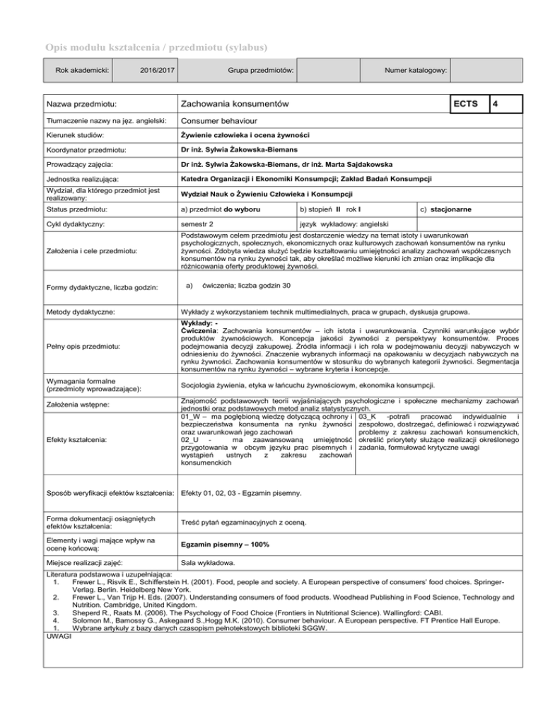 Opis modułu kształcenia / przedmiotu (sylabus) Rok akademicki: Grupa przedmiotów: 2016/2017 Numer katalogowy: Nazwa przedmiotu: Zachowania konsumentów Tłumaczenie nazwy na jęz. angielski: Consumer behaviour Kierunek studiów: Żywienie człowieka i ocena żywności Koordynator przedmiotu: Dr inż. Sylwia Żakowska-Biemans Prowadzący zajęcia: Dr inż. Sylwia Żakowska-Biemans, dr inż. Marta Sajdakowska Jednostka realizująca: Katedra Organizacji i Ekonomiki Konsumpcji; Zakład Badań Konsumpcji Wydział, dla którego przedmiot jest realizowany: Wydział Nauk o Żywieniu Człowieka i Konsumpcji Status przedmiotu: a) przedmiot do wyboru b) stopień II rok I Cykl dydaktyczny: semestr 2 język wykładowy: angielski Założenia i cele przedmiotu: Podstawowym celem przedmiotu jest dostarczenie wiedzy na temat istoty i uwarunkowań psychologicznych, społecznych, ekonomicznych oraz kulturowych zachowań konsumentów na rynku żywności. Zdobyta wiedza służyć będzie kształtowaniu umiejętności analizy zachowań współczesnych konsumentów na rynku żywności tak, aby określać możliwe kierunki ich zmian oraz implikacje dla różnicowania oferty produktowej żywności. Formy dydaktyczne, liczba godzin: a) ECTS 4 c) stacjonarne ćwiczenia; liczba godzin 30 Metody dydaktyczne: Wykłady z wykorzystaniem technik multimedialnych, praca w grupach, dyskusja grupowa. Pełny opis przedmiotu: Wykłady: Ćwiczenia: Zachowania konsumentów – ich istota i uwarunkowania. Czynniki warunkujące wybór produktów żywnościowych. Koncepcja jakości żywności z perspektywy konsumentów. Proces podejmowania decyzji zakupowej. Źródła informacji i ich rola w podejmowaniu decyzji nabywczych w odniesieniu do żywności. Znaczenie wybranych informacji na opakowaniu w decyzjach nabywczych na rynku żywności. Zachowania konsumentów w stosunku do wybranych kategorii żywności. Segmentacja konsumentów na rynku żywności – wybrane kryteria i koncepcje. Wymagania formalne (przedmioty wprowadzające): Socjologia żywienia, etyka w łańcuchu żywnościowym, ekonomika konsumpcji. Założenia wstępne: Efekty kształcenia: Znajomość podstawowych teorii wyjaśniających psychologiczne i społeczne mechanizmy zachowań jednostki oraz podstawowych metod analiz statystycznych. 01_W – ma pogłębioną wiedzę dotyczącą ochrony i 03_K -potrafi pracować indywidualnie i bezpieczeństwa konsumenta na rynku żywności zespołowo, dostrzegać, definiować i rozwiązywać oraz uwarunkowań jego zachowań problemy z zakresu zachowań konsumenckich, 02_U ma zaawansowaną umiejętność określić priorytety służące realizacji określonego przygotowania w obcym języku prac pisemnych i zadania, formułować krytyczne uwagi wystąpień ustnych z zakresu zachowań konsumenckich Sposób weryfikacji efektów kształcenia: Efekty 01, 02, 03 - Egzamin pisemny. Forma dokumentacji osiągniętych efektów kształcenia: Treść pytań egzaminacyjnych z oceną. Elementy i wagi mające wpływ na ocenę końcową: Egzamin pisemny – 100% Miejsce realizacji zajęć: Sala wykładowa. Literatura podstawowa i uzupełniająca: 1. Frewer L., Risvik E., Schifferstein H. (2001). Food, people and society. A European perspective of consumers’ food choices. SpringerVerlag. Berlin. Heidelberg New York. 2. Frewer L., Van Trijp H. Eds. (2007). Understanding consumers of food products. Woodhead Publishing in Food Science, Technology and Nutrition. Cambridge, United Kingdom. 3. Sheperd R., Raats M. (2006). The Psychology of Food Choice (Frontiers in Nutritional Science). Wallingford: CABI. 4. Solomon M., Bamossy G., Askegaard S.,Hogg M.K. (2010). Consumer behaviour. A European perspective. FT Prentice Hall Europe. 1. Wybrane artykuły z bazy danych czasopism pełnotekstowych biblioteki SGGW. UWAGI Wskaźniki ilościowe charakteryzujące moduł/przedmiot: Szacunkowa sumaryczna liczba godzin pracy studenta (kontaktowych i pracy własnej) niezbędna dla osiągnięcia zakładanych efektów kształcenia - na tej podstawie należy wypełnić pole ECTS: 120 h Łączna liczba punktów ECTS, którą student uzyskuje na zajęciach wymagających bezpośredniego udziału nauczycieli akademickich: 1 ECTS Łączna liczba punktów ECTS, którą student uzyskuje w ramach zajęć o charakterze praktycznym, takich jak zajęcia laboratoryjne, projektowe, itp.: 1 ECTS Tabela zgodności kierunkowych efektów kształcenia z efektami przedmiotu: Nr /symbol efektu 01_W 02_U 03_K Wymienione w wierszu efekty kształcenia: ma pogłębioną wiedzę dotyczącą ochrony i bezpieczeństwa konsumenta na rynku żywności oraz uwarunkowań jego zachowań ma zaawansowaną umiejętność przygotowania w obcym języku prac pisemnych i wystąpień ustnych z zakresu zachowań konsumenckich potrafi pracować indywidualnie i zespołowo, dostrzegać, definiować i rozwiązywać problemy z zakresu zachowań konsumenckich, określić priorytety służące realizacji określonego zadania, formułować krytyczne uwagi Odniesienie do efektów dla programu kształcenia na kierunku K_W07 K_U09 K_K02 Rok akademicki: 2016/2017 Grupa przedmiotów: Numer katalogowy: ECTS 4 Nazwa przedmiotu: Ecological aspects of food and nutrition Tłumaczenie nazwy na jęz. angielski: Ecological aspects of food and nutrition Kierunek studiów: Żywienie człowieka i ocena żywności Koordynator przedmiotu: Prof. dr hab. Ewa Rembiałkowska Prowadzący zajęcia: Prof. dr hab. Ewa Rembiałkowska, dr inż. Dominika Średnicka-Tober Jednostka realizująca: Katedra Żywności Funkcjonalnej, Ekologicznej i Towaroznawstwa Wydział, dla którego przedmiot jest realizowany: Wydział Nauk o Żywieniu Człowieka i Konsumpcji Status przedmiotu: a) przedmiot do wyboru b) stopień II rok I Cykl dydaktyczny: semestr 2 język wykładowy: angielski Założenia i cele przedmiotu: Celem przedmiotu jest zapoznanie studentów z wpływem jakości środowiska rolniczego oraz ekologicznej metody produkcji na szeroko pojmo