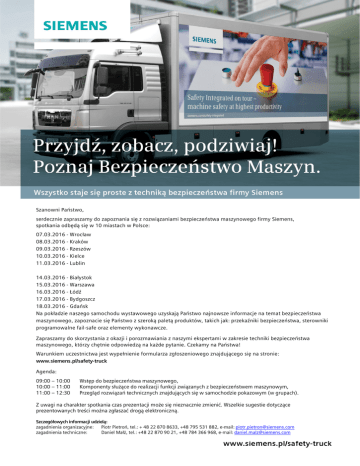 Szanowni Państwo, serdecznie zapraszamy do zapoznania się z rozwiązaniami bezpieczeństwa maszynowego firmy Siemens, spotkania odbędą się w 10 miastach w Polsce: 07.03.2016 - Wrocław 08.03.2016 - Kraków 09.03.2016 - Rzeszów 10.03.2016 - Kielce 11.03.2016 - Lublin 14.03.2016 - Białystok 15.03.2016 - Warszawa 16.03.2016 - Łódź 17.03.2016 - Bydgoszcz 18.03.2016 - Gdańsk Na pokładzie naszego samochodu wystawowego uzyskają Państwo najnowsze informacje na temat bezpieczeństwa maszynowego, zapoznacie się Państwo z szeroką paletą produktów, takich jak: przekaźniki bezpieczeństwa, sterowniki programowalne fail-safe oraz elementy wykonawcze. Zapraszamy do skorzystania z okazji i porozmawiania z naszymi ekspertami w zakresie techniki bezpieczeństwa maszynowego, którzy chętnie odpowiedzą na każde pytanie. Czekamy na Państwa! Warunkiem uczestnictwa jest wypełnienie formularza zgłoszeniowego znajdującego się na stronie: www.siemens.pl/safety-truck Agenda: 09:00 – 10:00 10:00 – 11:00 11:00 – 12:30 Wstęp do bezpieczeństwa maszynowego, Komponenty służące do realizacji funkcji związanych z bezpieczeństwem maszynowym, Przegląd rozwiązań technicznych znajdujących się w samochodzie pokazowym (w grupach). Z uwagi na charakter spotkania czas prezentacji może się nieznacznie zmienić. Wszelkie sugestie dotyczące prezentowanych treści można zgłaszać drogą elektroniczną. Szczegółowych informacji udzielą: zagadnienia organizacyjne: Piotr Pietroń, tel.: + 48 22 870 8633, +48 795 531 882, e-mail: [email protected] zagadnienia techniczne: Daniel Małż, tel.: +48 22 870 90 21, +48 784 366 968, e-mail: [email protected]