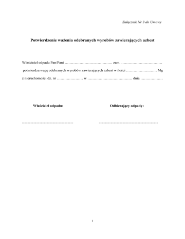 Załącznik Nr 3 do Umowy Potwierdzenie ważenia odebranych wyrobów zawierających azbest Właściciel odpadu Pan/Pani ……………………..…………. zam. …………………………… potwierdza wagę odebranych wyrobów zawierających azbest w ilości ……………….…… Mg z nieruchomości dz. nr ………………… w ……………………………… dnia ……………… Właściciel odpadu: Odbierający odpady: ……………………………………………………….. ………………………………………………………………… 1