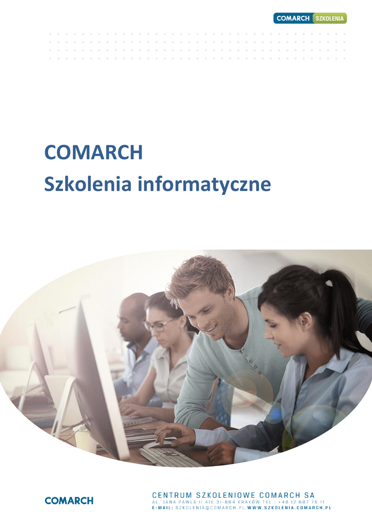 COMARCH Szkolenia informatyczne OFirmie Proces Szkoleniowy Program szkolenia Ścieżki szkoleniowe Metodologia Gwarancja i Asysta Lokalizacje Terminy Zgłoszenia i płatności Inne szkolenia Kontakt Wycena Oferent COMARCH S.A., al. Jana Pawła II 39a, 31-864 Kraków, NIP: 677-00-65-406, REGON: 350527377, kapitał zakładowy: 8.125.590,00 zł, kapitał został wpłacony w całości. Adres kontaktowy COMARCH S.A. Centrum Szkoleniowe, ul. Prof. M. Życzkowskiego 23, 31-864 Kraków, T: 126877811, F: 126461100, adres e-mail: [email protected]. Data oferty 2015-08-07 Ważność oferty 2016-07-31 O Firmie COMARCH SA jest wiodącym producentem i dostawcą systemów informatycznych dla przemysłu, handlu, sektora telekomunikacyjnego, instytucji finansowych i banków.Spółka powstała w 1991 roku, obecnie firma zatrudnia ponad4000 ekspertów IT na całym świecie. Centrum Szkoleniowe wchodzące w skład grupy kapitałowej działa na rynku szkoleniowym od roku 1996. Nasze główne atuty to : Doświadczenie w branży szkoleniowej prowadzimy szkolenia dla około 10 000osób rocznie; posiadamy ponad 300 programów szkoleniowych; posiadamy referencje Klientów; certyfikat z serii ISO 9001:2000 gwarantuje jakość świadczonych usług. jesteśmy wpisani do rejestru kuratorium i rejestru w WUP Kraków. posiadamy znak jakości „Małopolski standard usług edukacyjnoszkoleniowych” prowadzimy szkolenia autoryzowane Microsoft oraz Cisco. Kadra trenerska Nasza kadra liczy ok. 80 trenerów. Wykładowcy są ekspertami w swoich dziedzinach. Ich bogata wiedza poparta jest wieloletnią praktyką szkoleniową oraz wykształceniem pedagogicznym z zakresu efektywności i technik nowoczesnego nauczania. Wszystkie oceny trenerów są dokładnie weryfikowane. Nie budzą naszych zastrzeżeń, wyłącznie, oceny powyżej 5.0 w skali 6-stopniowej.Wykładowcy posiadają certyfikaty, uwierzytelniające kompetencje zawodowe. ich Dostosowanie szkoleń do potrzeb klientów prowadzimy szkolenia otwarte (indywidualne zgłoszenia) jak i zamknięte (grupowe) doradzamy jakie rozwiązania najlepiej wybrać, tak aby spełniły wymagania Klienta. określamy dokładne celei rezultaty szkoleń; prowadzimy szkolenia w języku polskim oraz angielskim; tworząc ścieżki szkoleniowe wskazujemy dla każdego odpowiedni poziom wiedzy Realizm cenowy Dobieramy dla Klienta odpowiednią ofertę, w której ceny są ustalane racjonalnie, a zawartość usługi jest dokładnie określona. Świadczenie usług dodatkowych Oprócz szkoleń posiadamy w ofercie szereg usług dodatkowych takich jak: badanie potrzeb Klienta weryfikacja wiedzy uczestników asysta poszkoleniowa Gwarancja szkoleniowa Wszystkie szkolenia zamknięte są gwarancją szkoleniową objęte Elastyczność w działaniu Jesteśmy otwarci na nowe tematy i wyzwania. Jest wysoce prawdopodobne, że jeżeli nawet nie ma określonego programu w naszej ofercie to i tak będziemy mogli szkolenie zrealizować. Proces szkoleniowy Weryfikacja potrzeb szkoleniowych Dokładne sprawdzenie potrzeb Klienta jest z punktu widzenia szkolenia najważniejszym elementem, który powinien być zrealizowany przed właściwym kursem. Weryfikacja potrzeb szkoleniowych jest kilkuetapowa i obejmuje zarówno osoby odpowiedzialne za szkolenia po stronie Klienta jak i samych uczestników szkoleń. Najważniejsze elementy tego procesu: 1) Weryfikacja potrzeb firmy. Dzięki rozmowie z osobami odpowiedzialnymi za szkolenia po stronie Klienta mamy możliwość zakreślenia ogólnych celów szkolenia, bieżącego statusu firmy oraz możemy określić pożądany wynik szkolenia. Weryfikacja ta jest wspomagana przez ankietę elektroniczną. 2) Weryfikacja potrzeb przełożonych. Kolejna ankieta elektroniczna bada potrzeby przełożonych uczestników szkoleń, co umożliwia zdefiniowanie dokładniejszych ram programowych. 3) Weryfikacja potrzeb uczestników szkoleń. Potrzeby uczestników mogą być badane za pomocą (do wyboru w zależności od szkolenia): ankiety elektronicznej określającej obecny status uczestników i ich główne potrzeby szkoleniowe, testu elektronicznego weryfikującego obecny stan wiedzy uczestników. W części testów dostępne są elektroniczne certyfikaty poświadczające stan wiedzy. testu bezpośredniego (np. zadania do wykonania), Na podstawie wyników powyższych ankiet i testów, otrzymujemy informację o aktualnym statusie wiedzy potencjalnych uczestników oraz celach jakie po szkoleniu powinni osiągnąć. Mając te dane przystępujemy do podziału uczestników na grupy. W przypadku szkoleń grupowych, Klient ma możliwość samodzielnej modyfikacji programu. Program szkolenia Dokładne programy szkoleń znajda Państwo na stronie: www.comarch.pl/szkolenia/ Metodologia Wszystkie zajęcia mają charakter warsztatowy. Zajęcia prowadzimy w grupach do 10 osób, ponieważ tyko takie grupy,mogą zapewnić odpowiedni poziom szkolenia i zachować jego efektywność. Program każdego ze szkoleń został przygotowany w taki sposób, aby każde z zagadnień można było przećwiczyć na praktycznych przykładach. W szkoleniach IT każdy uczestnik ma osobne stanowisko pracy z komputerem i odpowiednim aktualnym oprogramowaniem. W czasie zajęć wykorzystywane są następujące metody prowadzenia szkoleń: ćwiczenia praktyczne \ warsztaty praktyczne – zajmują zwykle około 70% czasu szkolenia. Ćwiczenia są realizowane pod kontrolą trenera, wykład – wyjaśnienie pojęć i definicji, wprowadzenie do tematu, analiza przypadku – wyjaśnianie trudnego przypadku \ problemu, omówienie jego charakterystyki, prezentacja multimedialna – podkreśla i uwydatnia ważniejsze elementy szkolenia, pytania i odpowiedzi – wytłumaczenie kwestii poruszanych przez uczestników, sprawdzanie wiadomości – ćwiczenia kontrolne w trakcie szkolenia, zwykle samodzielne W trakcie szkolenia uczestnicy otrzymują: materiały papierowe (skrypty, książki lub prezentacje), materiały elektroniczne (ćwiczenia 