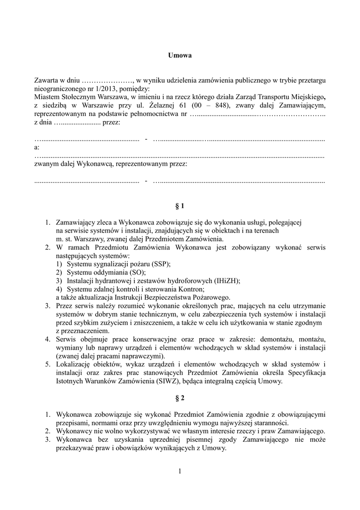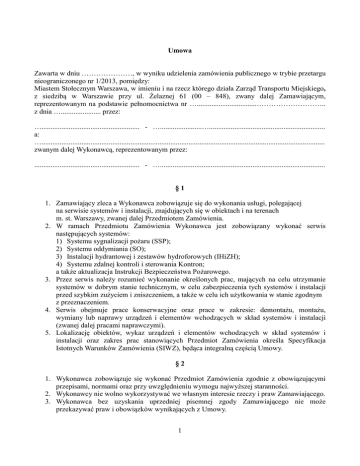Umowa Zawarta w dniu …………………, w wyniku udzielenia zamówienia publicznego w trybie przetargu nieograniczonego nr 1/2013, pomiędzy: Miastem Stołecznym Warszawa, w imieniu i na rzecz którego działa Zarząd Transportu Miejskiego, z siedzibą w Warszawie przy ul. Żelaznej 61 (00 – 848), zwany dalej Zamawiającym, reprezentowanym na podstawie pełnomocnictwa nr ….................................……………………….. z dnia …...................... przez: …...................................................... - ….......................…................................................................ a: …............................................................................................................................................................ zwanym dalej Wykonawcą, reprezentowanym przez: .......................................................... - …........................................................................................... §1 1. Zamawiający zleca a Wykonawca zobowiązuje się do wykonania usługi, polegającej na serwisie systemów i instalacji, znajdujących się w obiektach i na terenach m. st. Warszawy, zwanej dalej Przedmiotem Zamówienia. 2. W ramach Przedmiotu Zamówienia Wykonawca jest zobowiązany wykonać serwis następujących systemów: 1) Systemu sygnalizacji pożaru (SSP); 2) Systemu oddymiania (SO); 3) Instalacji hydrantowej i zestawów hydroforowych (IHiZH); 4) Systemu zdalnej kontroli i sterowania Kontron; a także aktualizacja Instrukcji Bezpieczeństwa Pożarowego. 3. Przez serwis należy rozumieć wykonanie określonych prac, mających na celu utrzymanie systemów w dobrym stanie technicznym, w celu zabezpieczenia tych systemów i instalacji przed szybkim zużyciem i zniszczeniem, a także w celu ich użytkowania w stanie zgodnym z przeznaczeniem. 4. Serwis obejmuje prace konserwacyjne oraz prace w zakresie: demontażu, montażu, wymiany lub naprawy urządzeń i elementów wchodzących w skład systemów i instalacji (zwanej dalej pracami naprawczymi). 5. Lokalizację obiektów, wykaz urządzeń i elementów wchodzących w skład systemów i instalacji oraz zakres prac stanowiących Przedmiot Zamówienia określa Specyfikacja Istotnych Warunków Zamówienia (SIWZ), będąca integralną częścią Umowy. §2 1. Wykonawca zobowiązuje się wykonać Przedmiot Zamówienia zgodnie z obowiązującymi przepisami, normami oraz przy uwzględnieniu wymogu najwyższej staranności. 2. Wykonawcy nie wolno wykorzystywać we własnym interesie rzeczy i praw Zamawiającego. 3. Wykonawca bez uzyskania uprzedniej pisemnej zgody Zamawiającego nie może przekazywać praw i obowiązków wynikających z Umowy. 1 4. Wykonawca oświadcza, że jest przygotowany pod względem technicznym i organizacyjnym, posiada niezbędną wiedzę i potencjał do wykonania prac stanowiących Przedmiot Zamówienia. 5. Wykonawca oświadcza, iż w trakcie realizacji Przedmiotu Zamówienia będzie ponosił odpowiedzialność za wszelkie swoje działania i zaniechania oraz działania i zaniechania osób trzecich, którymi będzie posługiwał się przy realizacji Przedmiotu Zamówienia. 6. Wszelkie koszty związane z wykonywaniem niniejszej Umowy ponosi Wykonawca; w szczególności Wykonawca na własny koszt i ryzyko dokonuje zakupu wszelkich: usług, materiałów, urządzeń i wyposażenia, ponosi koszty transportu jak również opłaca wykwalifikowanych pracowników zatrudnionych przy realizacji Przedmiotu Zamówienia. 7. Jeżeli w związku z realizacją prac stanowiących Przedmiot Zamówienia powstanie obowiązek uiszczenia jakiejkolwiek opłaty administracyjnej lub skarbowej, Wykonawca zobowiązuje się uiścić ją we właściwym urzędzie w terminie określonym w obowiązujących przepisach prawa. 8. Użyte przy wykonywaniu Przedmiotu Zamówienia urządzenia i narzędzia muszą posiadać wszystkie wymagane atesty, certyfikaty oraz dopuszczenia do ich stosowania na terenie Polski i Unii Europejskiej. 9. W celu realizacji Przedmiotu Zamówienia Wykonawca zobowiązuje się do: 1) przydzielenia przeszkolonych i wyposażonych pracowników, posiadających wszystkie stosowne uprawnienia; 2) zapewnienia przez 24 godziny na dobę łączności telefonicznej z Zamawiającym zgodnie z wykazem teleadresowym stanowiącym załącznik do SIWZ; 3) zapewnienia prawidłowego działania systemów i instalacji objętych Przedmiotem Zamówienia; 4) Zapewnienia stałego nadzoru nad prawidłowym działaniem systemów i instalacji objętych Przedmiotem Zamówienia; 5) niezwłocznego poinformowania Zamawiającego o wszelkich nieprawidłowościach lub usterkach w funkcjonowaniu systemów i instalacji; 6) terminowego wykonywania obowiązków wynikających z Umowy; 7) podjęcia działań w przypadku stwierdzenia okoliczności stanowiących zagrożenie dla mienia oraz użytkowników i pracowników obiektów określonych w Przedmiocie Zamówienia. 10. Wykonawcy bez zgody Zamawiającego nie może wykonywać na obiektach Zamawiającego żadnych innych prac, niż prace określone w SIWZ. 11. W dowolnym czasie trwania niniejszej Umowy Zamawiający ma prawo scedować na Wykonawcę obowiązek utylizacji materiałów zepsutych i uszkodzonych, zdemontowanych przez Wykonawcę w trakcie realizacji Przedmiotu Zamówienia. §3 Umowa obowiązuje od dnia jej podpisania do dnia 31.10.2014 roku. §4 1. Wartość Umowy nie przekroczy kwoty ….................................................................. zł brutto (słownie złotych: ….................................................................................................................). 2. Łączna wartość prac naprawczych nie może przekroczyć 25 % łącznej wartości prac konserwacyjnych. 3. Za wykonanie Przedmiotu Zamówienia zgodnie z postanowieniami niniejszej Umowy w zakresie prac konserwacyjnych, Zamawiający zapłaci na rzecz Wykonawcy miesięczne 2 wynagrodzenie ryczałtowe w wysokości brutto - …..
