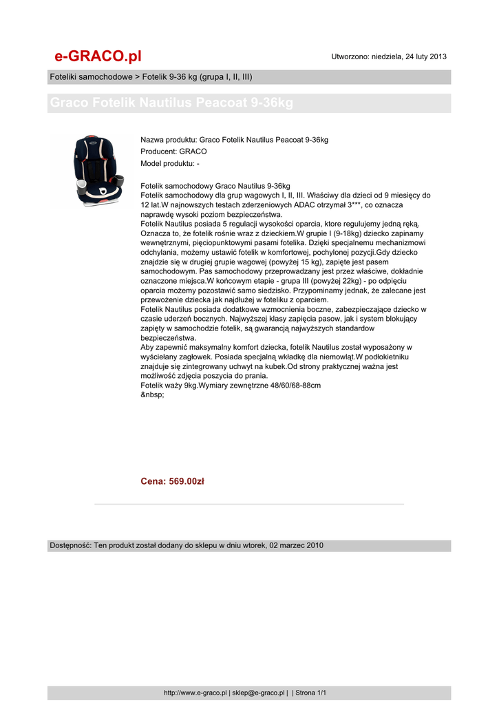 e-GRACO.pl Utworzono: niedziela, 24 luty 2013 Foteliki samochodowe > Fotelik 9-36 kg (grupa I, II, III) Graco Fotelik Nautilus Peacoat 9-36kg Nazwa produktu: Graco Fotelik Nautilus Peacoat 9-36kg Producent: GRACO Model produktu: Fotelik samochodowy Graco Nautilus 9-36kg Fotelik samochodowy dla grup wagowych I, II, III. Właściwy dla dzieci od 9 miesięcy do 12 lat.W najnowszych testach zderzeniowych ADAC otrzymał 3***, co oznacza naprawdę wysoki poziom bezpieczeństwa. Fotelik Nautilus posiada 5 regulacji wysokości oparcia, ktore regulujemy jedną ręką. Oznacza to, że fotelik rośnie wraz z dzieckiem.W grupie I (9-18kg) dziecko zapinamy wewnętrznymi, pięciopunktowymi pasami fotelika. Dzięki specjalnemu mechanizmowi odchylania, możemy ustawić fotelik w komfortowej, pochylonej pozycji.Gdy dziecko znajdzie się w drugiej grupie wagowej (powyżej 15 kg), zapięte jest pasem samochodowym. Pas samochodowy przeprowadzany jest przez właściwe, dokładnie oznaczone miejsca.W końcowym etapie - grupa III (powyżej 22kg) - po odpięciu oparcia możemy pozostawić samo siedzisko. Przypominamy jednak, że zalecane jest przewożenie dziecka jak najdłużej w foteliku z oparciem. Fotelik Nautilus posiada dodatkowe wzmocnienia boczne, zabezpieczające dziecko w czasie uderzeń bocznych. Najwyższej klasy zapięcia pasow, jak i system blokujący zapięty w samochodzie fotelik, są gwarancją najwyższych standardow bezpieczeństwa. Aby zapewnić maksymalny komfort dziecka, fotelik Nautilus został wyposażony w wyściełany zagłowek. Posiada specjalną wkładkę dla niemowląt.W podłokietniku znajduje się zintegrowany uchwyt na kubek.Od strony praktycznej ważna jest możliwość zdjęcia poszycia do prania. Fotelik waży 9kg.Wymiary zewnętrzne 48/60/68-88cm Cena: 569.00zł Dostępność: Ten produkt został dodany do sklepu w dniu wtorek, 02 marzec 2010 http://www.e-graco.pl | [email protected] | | Strona 1/1
