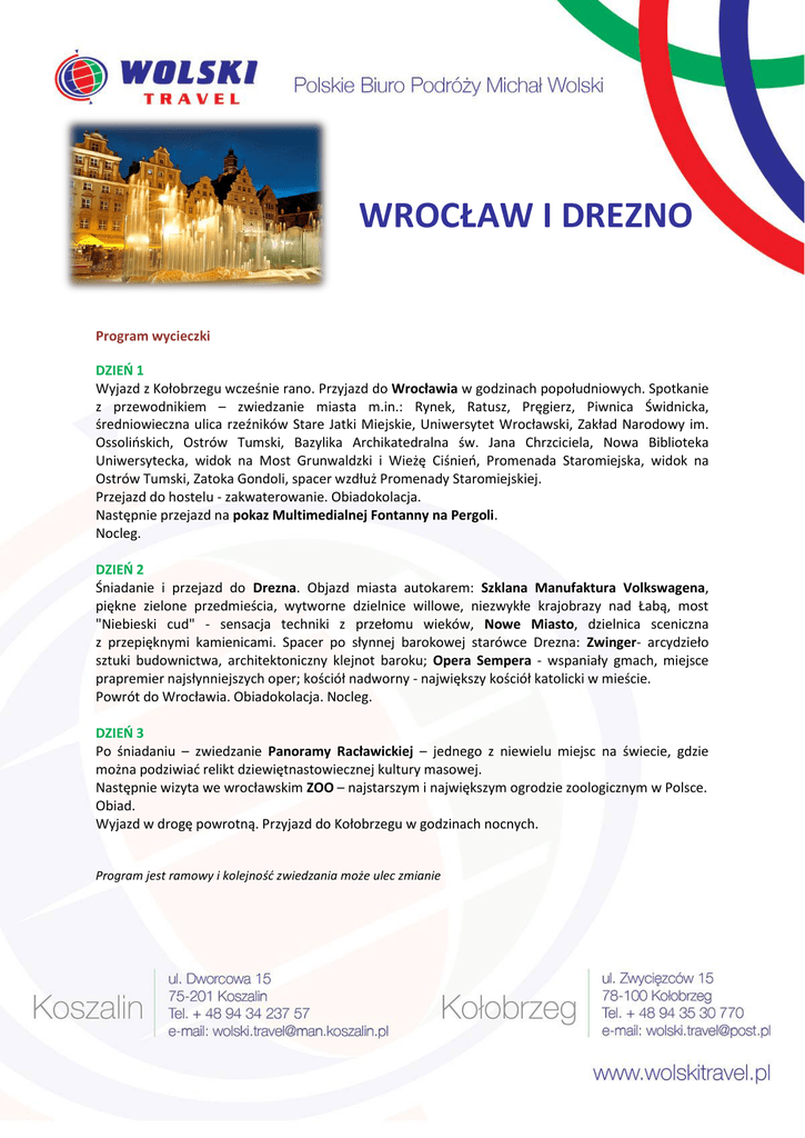 WROCŁAW I DREZNO Program wycieczki DZIEŃ 1 Wyjazd z Kołobrzegu wcześnie rano. Przyjazd do Wrocławia w godzinach popołudniowych. Spotkanie z przewodnikiem – zwiedzanie miasta m.in.: Rynek, Ratusz, Pręgierz, Piwnica Świdnicka, średniowieczna ulica rzeźników Stare Jatki Miejskie, Uniwersytet Wrocławski, Zakład Narodowy im. Ossolińskich, Ostrów Tumski, Bazylika Archikatedralna św. Jana Chrzciciela, Nowa Biblioteka Uniwersytecka, widok na Most Grunwaldzki i Wieżę Ciśnień, Promenada Staromiejska, widok na Ostrów Tumski, Zatoka Gondoli, spacer wzdłuż Promenady Staromiejskiej. Przejazd do hostelu - zakwaterowanie. Obiadokolacja. Następnie przejazd na pokaz Multimedialnej Fontanny na Pergoli. Nocleg. DZIEŃ 2 Śniadanie i przejazd do Drezna. Objazd miasta autokarem: Szklana Manufaktura Volkswagena, piękne zielone przedmieścia, wytworne dzielnice willowe, niezwykłe krajobrazy nad Łabą, most "Niebieski cud" - sensacja techniki z przełomu wieków, Nowe Miasto, dzielnica sceniczna z przepięknymi kamienicami. Spacer po słynnej barokowej starówce Drezna: Zwinger- arcydzieło sztuki budownictwa, architektoniczny klejnot baroku; Opera Sempera - wspaniały gmach, miejsce prapremier najsłynniejszych oper; kościół nadworny - największy kościół katolicki w mieście. Powrót do Wrocławia. Obiadokolacja. Nocleg. DZIEŃ 3 Po śniadaniu – zwiedzanie Panoramy Racławickiej – jednego z niewielu miejsc na świecie, gdzie można podziwiać relikt dziewiętnastowiecznej kultury masowej. Następnie wizyta we wrocławskim ZOO – najstarszym i największym ogrodzie zoologicznym w Polsce. Obiad. Wyjazd w drogę powrotną. Przyjazd do Kołobrzegu w godzinach nocnych. Program jest ramowy i kolejność zwiedzania może ulec zmianie LICZBA UCZESTNIKÓW CENA NA OSOBĘ 49 415 ZŁ 45 435 ZŁ 40 465 ZŁ Świadczenia zawarte w cenie: Transport autokarem, Opieka pilota, 2 noclegi w hostelu we Wrocławiu, 2 śniadania, 2 obiadokolacje, 1 obiad Ubezpieczenie NNW. Dodatkowo płatne: bilety wstępu + lokalni przewodnicy – koszt pakietu: ok. 60 zł / os. (cena może ulec zmianie).