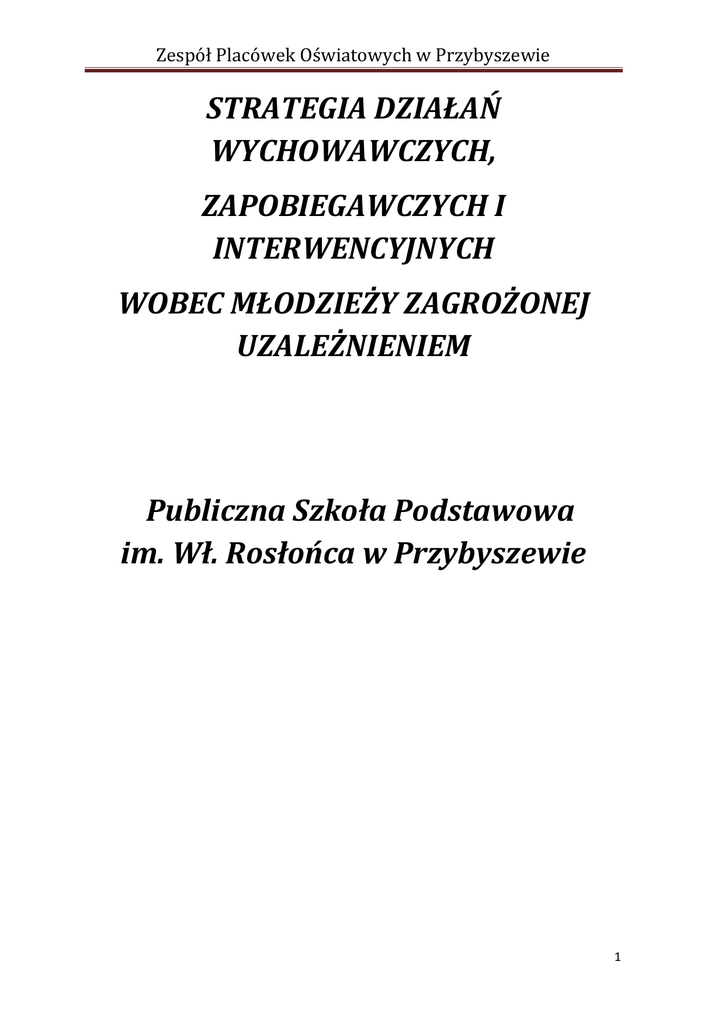 Zespół Placówek Oświatowych w Przybyszewie STRATEGIA DZIAŁAŃ WYCHOWAWCZYCH, ZAPOBIEGAWCZYCH I INTERWENCYJNYCH WOBEC MŁODZIEŻY ZAGROŻONEJ UZALEŻNIENIEM Publiczna Szkoła Podstawowa im. Wł. Rosłońca w Przybyszewie 1 Zespół Placówek Oświatowych w Przybyszewie Spis treści 1. Podstawa prawna ....................................................................................................................... 3 2. Założenia ogólne......................................................................................................................... 4 3. Strategie działań ............................................................................................................................. 6 I. Wychowawcze: ............................................................................................................................ 6 II. Zapobiegawcze: .......................................................................................................................... 6 III. Interwencyjne:........................................................................................................................... 6 4. Strategia działań wychowawczych i zapobiegawczych .................................................................. 7 I. Dyrektor szkoły: ........................................................................................................................... 7 II. Nauczyciele i wychowawcy klas: ................................................................................................ 7 III. Pielęgniarka szkolna: ................................................................................................................. 8 IV. Pracownicy administracji i obsługi szkoły: ................................................................................ 8 5. Strategia działań interwencyjnych ................................................................................................. 8 6. Metody współpracy szkoły z policją ............................................................................................. 11 7. Podstawy prawne stosowanych procedur: .................................................................................. 12 8. Akty prawne dotyczące bezpieczeństwa w szkole ....................................................................... 19 2 Zespół Placówek Oświatowych w Przybyszewie 1. Podstawa prawna 1. Ustawa z dnia 26 października 1982 r. o postępowaniu w sprawach nieletnich (Dz. U. z 1982 r. Nr 35, poz. 228 ze zmianami – tekst jednolity Dz. U. z 2002 r. Nr 11, poz. 109) oraz przepisy wykonawcze w związku z tą ustawą. 2. Ustawa z dnia 26 października 1982 r. o wychowaniu w trzeźwości i przeciwdziałaniu alkoholizmowi (Dz. U. z 1982 r. Nr 35, poz. 230 ze zmianami). 3. Ustawa z dnia 24 kwietnia 1997 r. o przeciwdziałaniu narkomanii (Dz. U. z 2003 r. Nr 24, poz. 198). 4. Ustawa z dnia 6 kwietnia 1990 r. o Policji (Dz. U. Nr 30, poz. 179 ze zmianami). 5. Zarządzenie Nr 15/97 Komendanta Głównego Policji z dnia 16 czerwca 1997 r. w sprawie form i metod działań Policji w zakresie zapobiegania i zwalczania demoralizacji i przestępczości nieletnich. 6. Ustawa z dnia 7 września 1991 r. o systemie oświaty (Dz. U. z 1996 r. Nr 67, poz. 329 ze zmianami). 7. Rozporządzenie Ministra Edukacji Narodowej i Sportu z dnia 31 stycznia 2003 r. w sprawie szczegółowych form działalności wśród dzieci i młodzieży zagrożonych uzależnieniem (Dz. U. z 2003 r. Nr 26, poz. 226). 3 Zespół Placówek Oświatowych w Przybyszewie 2. Założenia ogólne 1. Szkoła rozwija działania wychowawcze i zapobiegawcze wśród dzieci i młodzieży, u których zespół zjawisk psychicznych i oddziaływań środowiskowych stwarza wysokie prawdopodobieństwo powstania zależności od środków odurzających lub substancji psychotropowych albo którzy sporadycznie używają środków odurzających lub substancji psychotropowych lub środków zastępczych. 2. Działalność wychowawcza i zapobiegawcza w szkole polega w szczególności na: a. systematycznym rozpoznawaniu i diagnozowaniu zagrożeń związanych z uzależnieniem; b. informowaniu o narkomanii i jej skutkach; c. współpracy z rodzicami dzieci i młodzieży zagrożonych uzależnieniem; d. poradnictwie w zakresie zapobiegania uzależnieniom od środków i substancji psychotropowych; e. przygotowaniu nauczycieli i osób zajmujących się wychowaniem dzieci i młodzieży do przeciwdziałania narkomanii. 3. Zadania z zakresu działalności wychowawczej i zapobiegawczej wśród dzieci i młodzieży zagrożonych uzależnieniem są realizowane w szkole na: a. zajęciach profilaktycznych w ramach: form pomocy psychologiczno-pedagogicznej, w szczególności: zajęć dydaktycznowyrównawczych, zajęć specjalistycznych, zajęć psychoedukacyjnych, godzin dla wychowawcy klasy, zajęć pozalekcyjnych, zajęć świetlicowych; b. zajęciach edukacyjnych w ramach: przedmiotów, których podstawy programowe uwzględniają zagadnienia dotyczące zapobiegania narkomanii, edukacji prozdrowotnej, wychowania do życia w rodzinie. 4. Działalność informacyjna obejmuje upowszechnianie wśród dzieci i młodzieży, rodziców i nauczycieli informacji na temat: a. szkodliwości środków lub substancji psychotropowych, których używanie łączy się z zagrożeniem bezpieczeństwa i zdrowia oraz może prowadzić do uzależnień; b. dostępnych form pomocy dzieciom i młodzieży zagrożonych uzależnieniem; c. możliwości rozwiązywania problemów powodujących powstawanie uzależnień; d. skutków prawnych związanych z naruszeniem przepisów ustawy z dnia 24 kwietnia 1997 r. o przeciwdziałaniu narkomanii. 4 Zespół Placówek Oświatowych w Przybyszewie 5. Szkoła podejmuje działania interwencyjne polegające na powiadomieniu rodziców i Policji w sytuacjach kryzysowych, w szczególności, gdy dzieci lub młodzież używają, posiadają lub rozprowadzają środki lub s