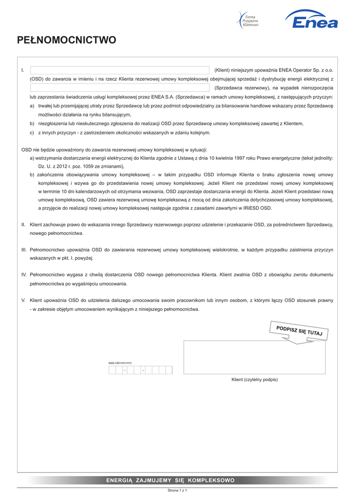 PEŁNOMOCNICTWO I. (Klient) niniejszym upoważnia ENEA Operator Sp. z o.o. (OSD) do zawarcia w imieniu i na rzecz Klienta rezerwowej umowy kompleksowej obejmującej sprzedaż i dystrybucję energii elektrycznej z (Sprzedawca rezerwowy), na wypadek nierozpoczęcia lub zaprzestania świadczenia usługi kompleksowej przez ENEA S.A. (Sprzedawca) w ramach umowy kompleksowej, z następujących przyczyn: a) trwałej lub przemijającej utraty przez Sprzedawcę lub przez podmiot odpowiedzialny za bilansowanie handlowe wskazany przez Sprzedawcę możliwości działania na rynku bilansującym, b) niezgłoszenia lub nieskutecznego zgłoszenia do realizacji OSD przez Sprzedawcę umowy kompleksowej zawartej z Klientem, c) z innych przyczyn - z zastrzeżeniem okoliczności wskazanych w zdaniu kolejnym. OSD nie będzie upoważniony do zawarcia rezerwowej umowy kompleksowej w sytuacji: a) wstrzymania dostarczania energii elektrycznej do Klienta zgodnie z Ustawą z dnia 10 kwietnia 1997 roku Prawo energetyczne (tekst jednolity: Dz. U. z 2012 r. poz. 1059 ze zmianami), b) zakończenia obowiązywania umowy kompleksowej – w takim przypadku OSD informuje Klienta o braku zgłoszenia nowej umowy kompleksowej i wzywa go do przedstawienia nowej umowy kompleksowej. Jeżeli Klient nie przedstawi nowej umowy kompleksowej w terminie 10 dni kalendarzowych od otrzymania wezwania, OSD zaprzestaje dostarczania energii do Klienta. Jeżeli Klient przedstawi nową umowę kompleksową, OSD zawiera rezerwową umowę kompleksową z mocą od dnia zakończenia dotychczasowej umowy kompleksowej, a przyjęcie do realizacji nowej umowy kompleksowej następuje zgodnie z zasadami zawartymi w IRiESD OSD. II. Klient zachowuje prawo do wskazania innego Sprzedawcy rezerwowego poprzez udzielenie i przekazanie OSD, za pośrednictwem Sprzedawcy, nowego pełnomocnictwa. III. Pełnomocnictwo upoważnia OSD do zawierania rezerwowej umowy kompleksowej wielokrotnie, w każdym przypadku zaistnienia przyczyn wskazanych w pkt. I. powyżej. IV. Pełnomocnictwo wygasa z chwilą dostarczenia OSD nowego pełnomocnictwa Klienta. Klient zwalnia OSD z obowiązku zwrotu dokumentu pełnomocnictwa po wygaśnięciu umocowania. V. Klient upoważnia OSD do udzielenia dalszego umocowania swoim pracownikom lub innym osobom, z którymi łączy OSD stosunek prawny - w zakresie objętym umocowaniem wynikającym z niniejszego pełnomocnictwa. data (dd-mm-rrrr) - Klient (czytelny podpis) ENERGIĄ ZAJMUJEMY SIĘ KOMPLEKSOWO Strona 1 z 1