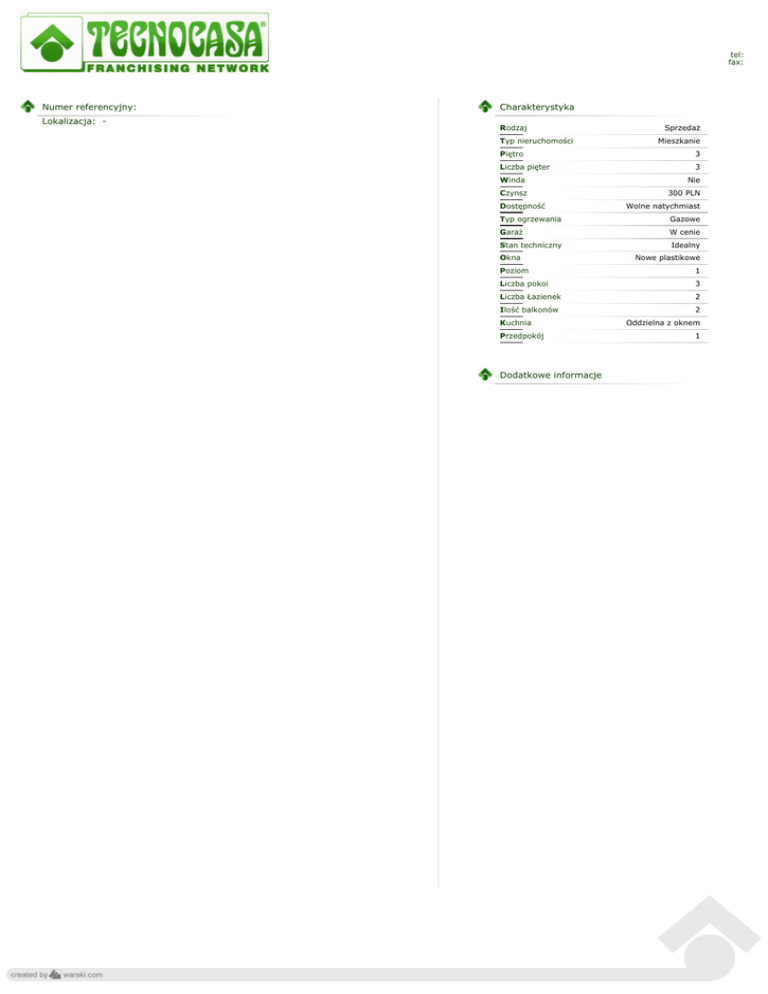 tel: fax: Numer referencyjny: Lokalizacja: - Charakterystyka Rodzaj Typ nieruchomości Piętro Liczba pięter Winda Czynsz Dostępność Sprzedaż Mieszkanie 3 3 Nie 300 PLN Wolne natychmiast Typ ogrzewania Gazowe Garaż W cenie Stan techniczny Okna Idealny Nowe plastikowe Poziom 1 Liczba pokoi 3 Liczba Łazienek 2 Ilość balkonów Kuchnia Przedpokój Dodatkowe informacje 2 Oddzielna z oknem 1