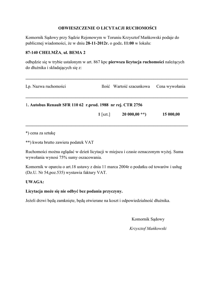 OBWIESZCZENIE O LICYTACJI RUCHOMOŚCI Komornik Sądowy przy Sądzie Rejonowym w Toruniu Krzysztof Mańkowski podaje do publicznej wiadomości, że w dniu 28-11-2012r. o godz. 11:00 w lokalu: 87-140 CHEŁMŻA, ul. BEMA 2 odbędzie się w trybie ustalonym w art. 867 kpc pierwsza licytacja ruchomości należących do dłużnika i składających się z: ___________________________________________________________________________ Lp. Nazwa ruchomości Ilość Wartość szacunkowa Cena wywołania ___________________________________________________________________________ 1. Autobus Renault SFR 110 62 r.prod. 1988 nr rej. CTR 2756 1 [szt.] 20 000,00 **) 15 000,00 ___________________________________________________________________________ *) cena za sztukę **) kwota brutto zawiera podatek VAT Ruchomości można oglądać w dzień licytacji w miejscu i czasie oznaczonym wyżej. Suma wywołania wynosi 75% sumy oszacowania. Komornik w oparciu o art.18 ustawy z dnia 11 marca 2004r o podatku od towarów i usług (Dz.U. Nr 54,poz.535) wystawia faktury VAT. UWAGA: Licytacja może się nie odbyć bez podania przyczyny. Jeżeli drzwi będą zamknięte, będą otwierane na koszt i odpowiedzialność dłużnika. Komornik Sądowy Krzysztof Mańkowski