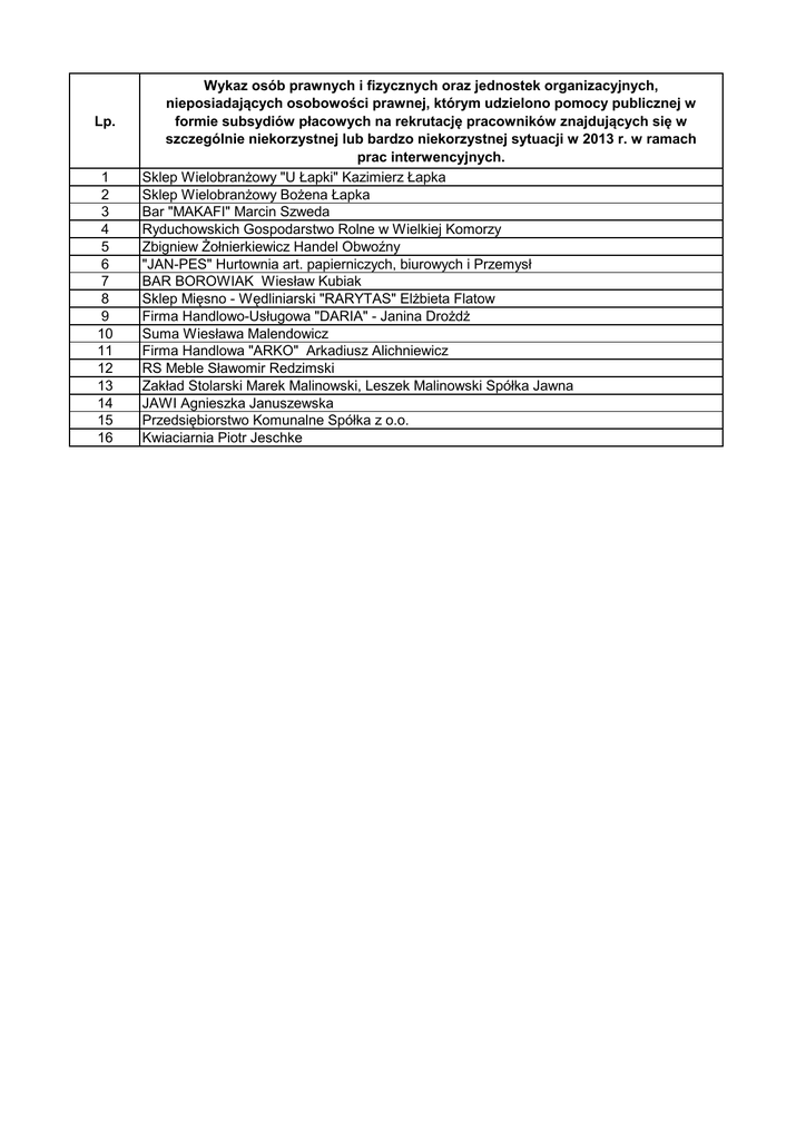 Lp. 1 2 3 4 5 6 7 8 9 10 11 12 13 14 15 16 Wykaz osób prawnych i fizycznych oraz jednostek organizacyjnych, nieposiadających osobowości prawnej, którym udzielono pomocy publicznej w formie subsydiów płacowych na rekrutację pracowników znajdujących się w szczególnie niekorzystnej lub bardzo niekorzystnej sytuacji w 2013 r. w ramach prac interwencyjnych. Sklep Wielobranżowy "U Łapki" Kazimierz Łapka Sklep Wielobranżowy Bożena Łapka Bar "MAKAFI" Marcin Szweda Ryduchowskich Gospodarstwo Rolne w Wielkiej Komorzy Zbigniew Żołnierkiewicz Handel Obwoźny "JAN-PES" Hurtownia art. papierniczych, biurowych i Przemysł BAR BOROWIAK Wiesław Kubiak Sklep Mięsno - Wędliniarski "RARYTAS" Elżbieta Flatow Firma Handlowo-Usługowa "DARIA" - Janina Drożdż Suma Wiesława Malendowicz Firma Handlowa "ARKO" Arkadiusz Alichniewicz RS Meble Sławomir Redzimski Zakład Stolarski Marek Malinowski, Leszek Malinowski Spółka Jawna JAWI Agnieszka Januszewska Przedsiębiorstwo Komunalne Spółka z o.o. Kwiaciarnia Piotr Jeschke