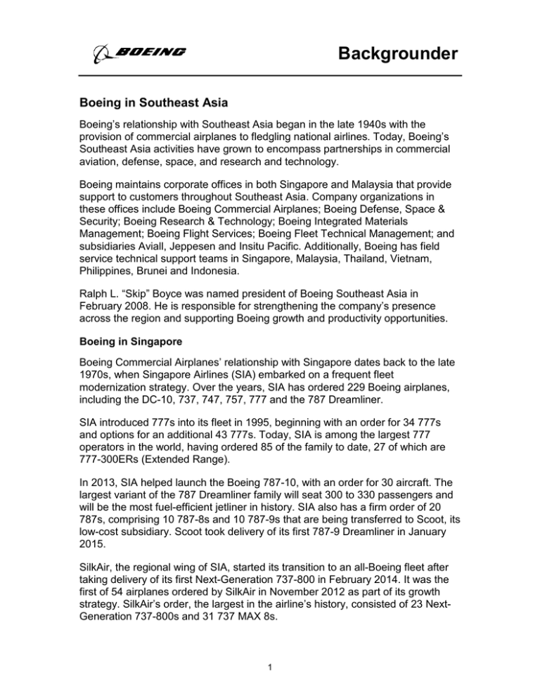 Backgrounder Boeing in Southeast Asia Boeing’s relationship with Southeast Asia began in the late 1940s with the provision of commercial airplanes to fledgling national airlines. Today, Boeing’s Southeast Asia activities have grown to encompass partnerships in commercial aviation, defense, space, and research and technology. Boeing maintains corporate offices in both Singapore and Malaysia that provide support to customers throughout Southeast Asia. Company organizations in these offices include Boeing Commercial Airplanes; Boeing Defense, Space & Security; Boeing Research & Technology; Boeing Integrated Materials Management; Boeing Flight Services; Boeing Fleet Technical Management; and subsidiaries Aviall, Jeppesen and Insitu Pacific. Additionally, Boeing has field service technical support teams in Singapore, Malaysia, Thailand, Vietnam, Philippines, Brunei and Indonesia. Ralph L. “Skip” Boyce was named president of Boeing Southeast Asia in February 2008. He is responsible for strengthening the company’s presence across the region and supporting Boeing growth and productivity opportunities. Boeing in Singapore Boeing Commercial Airplanes’ relationship with Singapore dates back to the late 1970s, when Singapore Airlines (SIA) embarked on a frequent fleet modernization strategy. Over the years, SIA has ordered 229 Boeing airplanes, including the DC-10, 737, 747, 757, 777 and the 787 Dreamliner. SIA introduced 777s into its fleet in 1995, beginning with an order for 34 777s and options for an additional 43 777s. Today, SIA is among the largest 777 operators in the world, having ordered 85 of the family to date, 27 of which are 777-300ERs (Extended Range). In 2013, SIA helped launch the Boeing 787-10, with an order for 30 aircraft. The largest variant of the 787 Dreamliner family will seat 300 to 330 passengers and will be the most fuel-efficient jetliner in history. SIA also has a firm order of 20 787s, comprising 10 787-8s and 10 787-9s that are being transferred to Scoot, its low-cost subsidiary. Scoot took delivery of its first 787-9 Dreamliner in January 2015. SilkAir, the regional wing of SIA, started its transition to an all-Boeing fleet after taking delivery of its first Next-Generation 737-800 in February 2014. It was the first of 54 airplanes ordered by SilkAir in November 2012 as part of its growth strategy. SilkAir’s order, the largest in the airline’s history, consisted of 23 NextGeneration 737-800s and 31 737 MAX 8s. 1 In August 2014, Boeing and BOC Aviation announced for 50 737 MAX 8s, 30 Next-Generation 737-800s and two 777-300ERs. The order, valued at $8.8 billion at list prices, is the largest in BOC Aviation’s 20-year history and part of the Singapore-based leasing company’s effort to grow its portfolio of fuel-efficient airplanes. In December 2014, BOC ordered an additional two 737-800s. The orders add to BOC Aviation’s fleet, which is among the youngest in the leasing industry, with an average of less than four years. Singapore Airlines Cargo operates seven 747-400 Freighters. In conjunction with SIA and Boeing Commercial Aviation Services, Singapore Airlines Engineering Company (SIAEC) completed its first 747-400 BCF (Boeing Converted Freighter) in 2006, using a Boeing conversion kit. Through 2013, SIAEC has redelivered six 747-400BCFs to SIA Cargo and Dragonair Cargo of Hong Kong. On July 9, 2014, Boeing and SIAEC signed an agreement to form Boeing Asia Pacific Aviation Services, a joint venture to provide industry-leading engineering, spare parts, and repair and maintenance services for Boeing 737s, 747s, 777s and 787s. Boeing will hold a 51 percent equity stake in the joint venture, with the remaining 49 percent owned by SIAEC. Boeing also signed GoldCare contracts for Scoot’s order of 20 787 Dreamliners and Singapore Airlines’ fleet of 27 777-300ERs. Once formed, services for Scoot and Singapore Airlines will be provided through the new joint venture. The Boeing Flight Services Singapore campus opened in January 2007. The facility has a total of seven simulators to support training on Next-Generation 737s, 777s and 787 Dreamliners. It is the Boeing Asia-Pacific headquarters and the largest training campus internationally. Boeing Commercial Airplanes’ supply chain extends into Singapore with 11 suppliers that produce parts for every one of our commercial airplane programs. Boeing has been a defense supplier to Singapore since the early 1990s. Singapore has acquired the CH-47 Chinook, which has played a significant role in disaster relief operations around the world. The Republic of Singapore Air Force flew missions to provide food, water and shelter to survivors of the 2004 tsunami in Indonesia and Thailand. Singapore was the first country in Southeast Asia to select the AH-64D Apache Longbow. The Singapore Air Force’s inventory also includes F-15SG multi-role fighters. Boeing will open its first cyber analytics center outside the United States in Singapore to bring advanced cybersecurity capabilities and services to customers in the Asia-Pacific region. The center will help train and equip cybersecurity professionals, perform advanced analytics and serve as Boeing’s regional cybersecurity center of excellence. Boeing will hire and train cybersecurity professionals in Singapore to staff the center. 2 A key feature of the facility will be the ability for customers to share timely and actionable information. The center will also provide a collaborative environment for security professionals to work with industry partners, customers and academia to solve complex, cybersecurity challenges. The centre will open in 2015 and be collocated with the Boeing Singapore office. Boeing in Malaysia In 1969, Malaysia Airline System (MAS) became the first Southeast Asian customer for the 737-100s, when it purchased five of these aircraft to replace the Comet 4. Since then, MAS has ordered 152 Boeing airplanes, including DC-10s, 737s, 747s and 777s. 