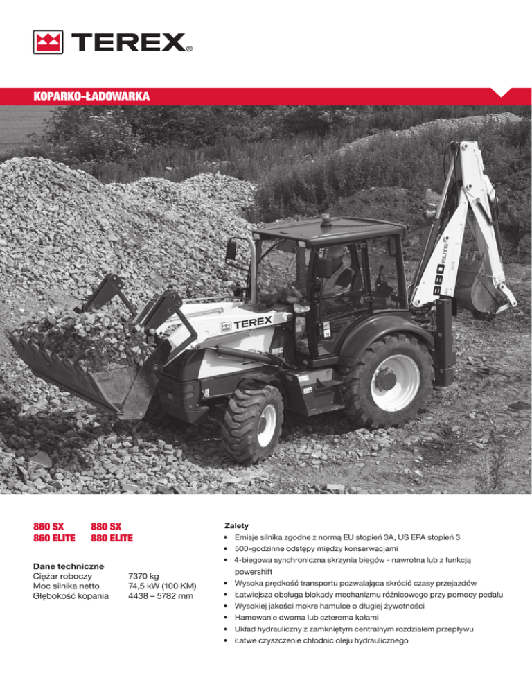 koparko-ładowarka 860 SX 860 Elite 880 SX 880 ELITE Zalety • Emisje silnika zgodne z normą EU stopień 3A, US EPA stopień 3 • 500-godzinne odstępy między konserwacjami Dane techniczne Ciężar roboczy Moc silnika netto Głębokość kopania • 4-biegowa synchroniczna skrzynia biegów - nawrotna lub z funkcją 7370 kg 74,5 kW (100 KM) 4438 – 5782 mm powershift • Wysoka prędkość transportu pozwalająca skrócić czasy przejazdów • Łatwiejsza obsługa blokady mechanizmu różnicowego przy pomocy pedału • Wysokiej jakości mokre hamulce o długiej żywotności • Hamowanie dwoma lub czterema kołami • Układ hydrauliczny z zamkniętym centralnym rozdziałem przepływu • Łatwe czyszczenie chłodnic oleju hydraulicznego Dane techniczne Silnik Masa całkowita Model silnika 1104D-44T Pojemność 4,4 l Znamionowa prędkość obrotowa 2200 obr./min Moc brutto przy 2200 obr./min, wartość znamionowa certyfikowana zgodnie z UN/ECE R120 Pochodna moc znamionowa netto przy 2200 obr./min zgodna z ISO/80/1269/EC Maks. moment obrotowy przy 1400 obr./min UN/ECE R120 ISO 80/1269/EC 74,5 (100*) kW (KM) 70,3* (94*) kW (KM) 392 Nm 373*Nm *Wartości znamionowe niecertyfikowane Synchroniczna przekładnia nawrotna Opony 7370 kg +/Osprzęt wielofunkcyjny 7 w 1 Zestaw wideł do osprz. wielof. 7 w 1 Trzon łyżki do głębokiego kopania Powershift +330 kg +150) kg +217 kg +160 kg Osie i hamulce Parametry osi Opony SAE J43 Przód 16/70 x 20 6300 kg Tył 16,9 x 30 6155 kg Układ hydrauliczny 860 SX 880 SX 16/70 x 20 18,4 x 26 16/70 x 20 16,9 x 30 1-szy 5,9 km/h 6,1 km/h 2-gi 9,5 km/h 9,9 km/h 3-ci 19,8 km/h 20,6 km/h 4-ty 37,5 km/h 38,9 km/h Przód Tył Masa całkowita Prędkości jazdy (naprzód/wstecz) Główna pompa przy 2200 obr./min 80 l/min Pompa pomocnicza przy 2200 obr./min 80 l/min Ustawienie gł. zaw. odciąż. przy 2200 obr./min 225 bar Ustawienie reduktora ciśn. wyl. przy 2200 obr./min 207 bar Przepływ sumaryczny 160 l/min Instalacja elektryczna Napięcie 12 V Akumulator zamontowany w stopniu dla ułatwienia dostępu Przekładnia Powershift Opony Przód Tył Akumulator bezobsługowy 860 Elite 880 Elite 16/70 x 20 18,4 x 26 16/70 x 20 16,9 x 30 Prędkości jazdy (naprzód) 1-szy 5,9 km/h 6,1 km/h 2-gi 9,7 km/h 9,9 km/h 3-ci 21,9 km/h 21,8 km/h 4-ty 40,0 km/h 41,2 km/h 1-szy 5,9 km/h 6,1 km/h 2-gi 9,7 km/h 9,9 km/h 3-ci 21,9 km/h 21,8 km/h Prędkości jazdy (wstecz) Wydajność ładowarki Standardowa łyżka Łyżka 7-w-1 Siła odrywania łyżki 54,675 N 53,890 N Siła odrywania ramion ładowarki 48,565 N 51,820 N Podnoszenie do pełnej wysokości 3,984 kg 3593 kg Osprzęt koparki Osprzęt Łyżki do kopania rowów Łyżki do udrażniania rowów Łyżka do wykopów prostokątnych Pojemność Ciężar 305 mm 450 mm 600 mm 600 mm 750 mm 900 mm 1525 mm 1830 mm Szerokość 83 l 124 l 184 l 233 l 248 l 312 l 220 l 300 l 94 kg 112 kg 134 kg 143 kg 155 kg 177 kg 145 kg 176 kg 900 mm 125 l 160 kg Alternator 100 A Złączki zabezpieczone przed wodą i pyłem 33 bezpieczników obwodów elektrycznych 25 przekaźników elektrycznych Odłącznik akumulatora Pojemność Zbiornik paliwa 130 l Płyn chłodzący silnika 16,0 l Olej silnikowy (łącznie z filtrem) 8,5 l Skrzynia biegów 15,0 l Przekładnia Powershift 18,0 l Oś tylna 17,5 l Oś przednia (nap. na 4 koła) 12,5 l Układ hydrauliczny 143 l Promienie zawracania Na oponach Na łyżce Bez hamulców 7,9 m 10,6 m Z hamulcami 7,0 m 9,7 m W zależności od rozmiaru opon Osprzęt ładowarki 860 SX 860 Elite Szerokość Pojemność Ciężar Szerokość Pojemność Ciężar Standardowa łyżka 2311 mm 1,0 m3 400 kg 2387 mm 1,2 m3 430 kg Łyżka 7-w-1 2311 mm 1,0 m3 730 kg 2387 mm 1,2 m3 767 kg 860 SX 880 SX860 Elite 880 ELITE Zasięgi robocze C G D Q T E S V P O N R U F Widły paletowe 1,0 m 1,2 m 1067 mm 1067 mm Szerokość przekroju 80 mm 80 mm Ciężar montażowy 150 kg 153 kg Długość wideł 3 3 A Maks. wysokość robocza 3130 mm 3192 mm Zasięg w poziomie 2680 mm 2664 mm Zasięg przy pełnej wysokości 2232 mm 2251 mm Dopuszczalne obciążenie robocze środek ładunku 500mm 1000 kg 1000 kg B Wymiary koparki Wymiary ładowarki Trzon łyżki do głębokiego kopania Trzon standardowy Łyżka standard 7 Łyżka 7-w-1 Zsun. Rozsun. N 2741 mm 2662 mm 2741 mm 2662 mm 4,438 mm 4422 mm 4438 mm 4422 mm 5782 mm 5771 mm Wysokość wysypywania przy 45°Wysokość wysypywania (przy maks. wychyleniu) O Wysokość nad ładunkiem 3343 mm 3343 mm Zasięg - w poziomie do przeciwl. kraw. zbocza 5726 mm 5726 mm 7017 mm P Wysokość sworznia obrotu 3583 mm 3583 mm Zasięg ładowania 1996 mm 2924 mm Q 352 mm 352 mm C 1996 mm Zasięg sworznia obrotu Wysokość robocza 5692 mm 5692 mm 6670 mm Zasięg na podłożu 1600 mm 1600 mm D R E Wysokość ładowania SAE Maks. wysokość ładowania 3586 mm 3904 mm 3586 mm 3904 mm 4564 mm 4882 mm S Maks. zasięg przy pełnej wysokości 1282 mm 1282 mm 2569 mm 3958 mm T G Obrót łyżki Całk. przesunięcie boczne Rozsunięcie stabilizatora Maks. kąt plantowania 194° 1286 mm 2115 mm 8° 194° 1286 mm 2115 mm 8° 194° 1286 mm 2115 mm 8° Zasięg przy pełnej wysokości - 45° Zasięg przy pełnej wysokości maksymalne wychylenie 829 mm Maksym. głębokośćkopania pion. ściany 2569 mm 829 mm F 645 mm 645 mm U Głębokość kopania Nachylenie na podłożu Maks. kąt wysypywania 123 mm 45° 57° 123 mm 45° 57° V Ogólna wysokość robocza 4263 mm 4313 mm A B Głębokość kopania maks. SAE 2 stopy przy płaskim dnie SAE Wydajność koparki Trzon standardowy Trzon łyżki do głębokiego kopania Zsun. Rozsun. Siła kopania podsiębiernego 16,100 Nm 16,100 Nm 16,100 Nm Siła odrywania trzonu łyżki 38,700 N 38,700 N 25,930 N Siła odrywania łyżki 51,585 N 51,585 N 51,585 N Podnoszenie hydrauliczne (łącznie z łyżką) 1564 kg 1297 kg 918 kg Wymiary 3762 2770 66º 2210 2098 20º 453 2130 1291 2311 7338 zgodnie z rysunkiem 6218 po złożeniu Dane techniczne Kabina Niski poziom hałasu wewnątrz - tylko 78 dBA Funkcj