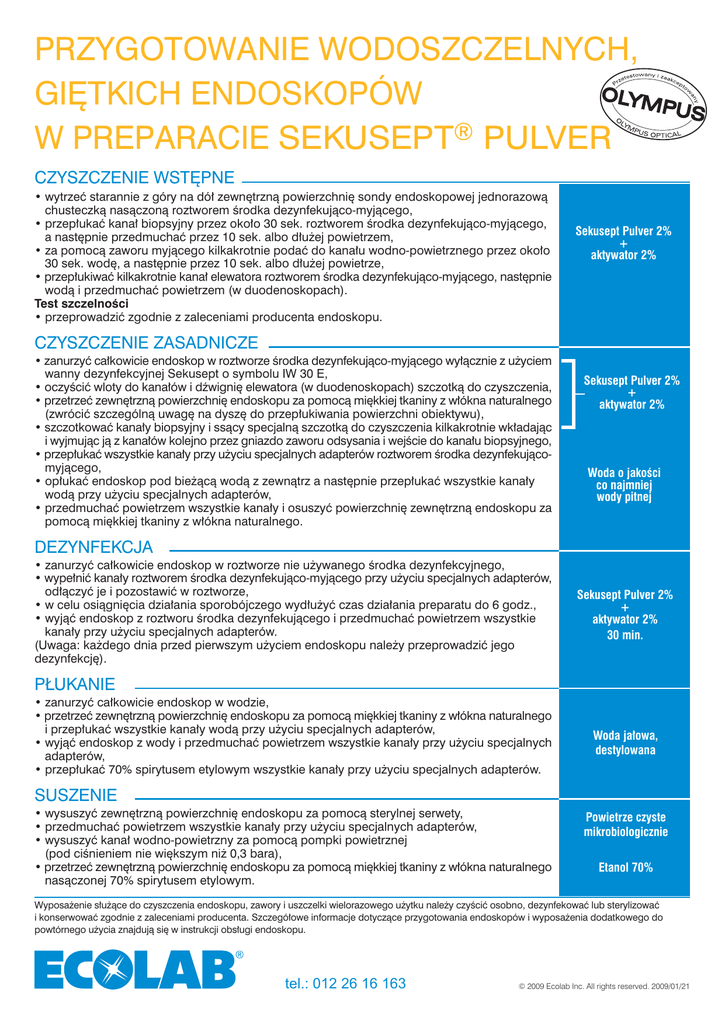 PRZYGOTOWANIE WODOSZCZELNYCH, GIÊTKICH ENDOSKOPÓW W PREPARACIE SEKUSEPT® PULVER CZYSZCZENIE WSTÊPNE wytrzeæ starannie z góry na dó³ zewnêtrzn¹ powierzchniê sondy endoskopowej jednorazow¹ chusteczk¹ nas¹czon¹ roztworem rodka dezynfekuj¹co-myj¹cego, przep³ukaæ kana³ biopsyjny przez oko³o 30 sek. roztworem rodka dezynfekuj¹co-myj¹cego, a nastêpnie przedmuchaæ przez 10 sek. albo d³u¿ej powietrzem, za pomoc¹ zaworu myj¹cego kilkakrotnie podaæ do kana³u wodno-powietrznego przez oko³o 30 sek. wodê, a nastêpnie przez 10 sek. albo d³u¿ej powietrze, przep³ukiwaæ kilkakrotnie kana³ elewatora roztworem rodka dezynfekuj¹co-myj¹cego, nastêpnie wod¹ i przedmuchaæ powietrzem (w duodenoskopach). Test szczelnoci przeprowadziæ zgodnie z zaleceniami producenta endoskopu. Sekusept Pulver 2% + aktywator 2% CZYSZCZENIE ZASADNICZE zanurzyæ ca³kowicie endoskop w roztworze rodka dezynfekuj¹co-myj¹cego wy³¹cznie z u¿yciem wanny dezynfekcyjnej Sekusept o symbolu IW 30 E, oczyciæ wloty do kana³ów i dwigniê elewatora (w duodenoskopach) szczotk¹ do czyszczenia, przetrzeæ zewnêtrzn¹ powierzchniê endoskopu za pomoc¹ miêkkiej tkaniny z w³ókna naturalnego (zwróciæ szczególn¹ uwagê na dyszê do przep³ukiwania powierzchni obiektywu), szczotkowaæ kana³y biopsyjny i ss¹cy specjaln¹ szczotk¹ do czyszczenia kilkakrotnie wk³adaj¹c i wyjmuj¹c j¹ z kana³ów kolejno przez gniazdo zaworu odsysania i wejcie do kana³u biopsyjnego, przep³ukaæ wszystkie kana³y przy u¿yciu specjalnych adapterów roztworem rodka dezynfekuj¹comyj¹cego, op³ukaæ endoskop pod bie¿¹c¹ wod¹ z zewn¹trz a nastêpnie przep³ukaæ wszystkie kana³y wod¹ przy u¿yciu specjalnych adapterów, przedmuchaæ powietrzem wszystkie kana³y i osuszyæ powierzchniê zewnêtrzn¹ endoskopu za pomoc¹ miêkkiej tkaniny z w³ókna naturalnego. Sekusept Pulver 2% + aktywator 2% Woda o jakoci co najmniej wody pitnej DEZYNFEKCJA zanurzyæ ca³kowicie endoskop w roztworze nie u¿ywanego rodka dezynfekcyjnego, wype³niæ kana³y roztworem rodka dezynfekuj¹co-myj¹cego przy u¿yciu specjalnych adapterów, od³¹czyæ je i pozostawiæ w roztworze, w celu osi¹gniêcia dzia³ania sporobójczego wyd³u¿yæ czas dzia³ania preparatu do 6 godz., wyj¹æ endoskop z roztworu rodka dezynfekuj¹cego i przedmuchaæ powietrzem wszystkie kana³y przy u¿yciu specjalnych adapterów. (Uwaga: ka¿dego dnia przed pierwszym u¿yciem endoskopu nale¿y przeprowadziæ jego dezynfekcjê). Sekusept Pulver 2% + aktywator 2% 30 min. P£UKANIE zanurzyæ ca³kowicie endoskop w wodzie, przetrzeæ zewnêtrzn¹ powierzchniê endoskopu za pomoc¹ miêkkiej tkaniny z w³ókna naturalnego i przep³ukaæ wszystkie kana³y wod¹ przy u¿yciu specjalnych adapterów, wyj¹æ endoskop z wody i przedmuchaæ powietrzem wszystkie kana³y przy u¿yciu specjalnych adapterów, przep³ukaæ 70% spirytusem etylowym wszystkie kana³y przy u¿yciu specjalnych adapterów. Woda ja³owa, destylowana SUSZENIE wysuszyæ zewnêtrzn¹ powierzchniê endoskopu za pomoc¹ sterylnej serwety, przedmuchaæ powietrzem wszystkie kana³y przy u¿yciu specjalnych adapterów, wysuszyæ kana³ wodno-powietrzny za pomoc¹ pompki powietrznej (pod cinieniem nie wiêkszym ni¿ 0,3 bara), przetrzeæ zewnêtrzn¹ powierzchniê endoskopu za pomoc¹ miêkkiej tkaniny z w³ókna naturalnego nas¹czonej 70% spirytusem etylowym. Powietrze czyste mikrobiologicznie Etanol 70% Wyposa¿enie s³u¿¹ce do czyszczenia endoskopu, zawory i uszczelki wielorazowego u¿ytku nale¿y czyciæ osobno, dezynfekowaæ lub sterylizowaæ i konserwowaæ zgodnie z zaleceniami producenta. Szczegó³owe informacje dotycz¹ce przygotowania endoskopów i wyposa¿enia dodatkowego do powtórnego u¿ycia znajduj¹ siê w instrukcji obs³ugi endoskopu. tel.: 012 26 16 163 © 2009 Ecolab Inc. All rights reserved. 2009/01/21