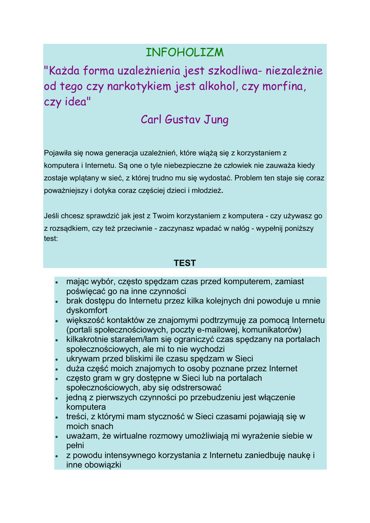 INFOHOLIZM "Każda forma uzależnienia jest szkodliwa- niezależnie od tego czy narkotykiem jest alkohol, czy morfina, czy idea" Carl Gustav Jung Pojawiła się nowa generacja uzależnień, które wiążą się z korzystaniem z komputera i Internetu. Są one o tyle niebezpieczne że człowiek nie zauważa kiedy zostaje wplątany w sieć, z której trudno mu się wydostać. Problem ten staje się coraz poważniejszy i dotyka coraz częściej dzieci i młodzież. Jeśli chcesz sprawdzić jak jest z Twoim korzystaniem z komputera - czy używasz go z rozsądkiem, czy też przeciwnie - zaczynasz wpadać w nałóg - wypełnij poniższy test: TEST mając wybór, często spędzam czas przed komputerem, zamiast poświęcać go na inne czynności brak dostępu do Internetu przez kilka kolejnych dni powoduje u mnie dyskomfort większość kontaktów ze znajomymi podtrzymuję za pomocą Internetu (portali społecznościowych, poczty e-mailowej, komunikatorów) kilkakrotnie starałem/łam się ograniczyć czas spędzany na portalach społecznościowych, ale mi to nie wychodzi ukrywam przed bliskimi ile czasu spędzam w Sieci duża część moich znajomych to osoby poznane przez Internet często gram w gry dostępne w Sieci lub na portalach społecznościowych, aby się odstrersować jedną z pierwszych czynności po przebudzeniu jest włączenie komputera treści, z którymi mam styczność w Sieci czasami pojawiają się w moich snach uważam, że wirtualne rozmowy umożliwiają mi wyrażenie siebie w pełni z powodu intensywnego korzystania z Internetu zaniedbuję naukę i inne obowiązki często chodzę spać bardzo późno z powodu korzystania z Sieci brak dostępu do portali społecznościowych sprawia, że wydaje mi się, iż nie wiem, co słychać u moich znajomych Zsumuj odpowiedzi, które dotyczą Ciebie. SUMA PUNKTÓW 0-3 Używasz komputera w określonym celu i z rozsądkiem, więc nie masz powodów do niepokoju. SUMA PUNKTÓW 4-7 Warto zwrócić uwagę, żeby komputer i Internet nie przesłoniły Ci realnego świata. Gdy masz ochotę spotkać się ze znajomymi, zorganizuj normalne spotkanie. Pamiętaj, że Internet to ogrom informacji i możliwości, dlatego łatwo w nim "utonąć". Pomyśl czy można nieco ograniczyć czas, który spędzasz w Sieci - na ile rzeczywiście musisz pracować przy komputerze, a na ile potrzebujesz kontaktu z nim, by poczuć się lepiej i mieć poczucie, że masz wszystko pod kontrolą. SUMA PUNKTÓW POWYŻEJ 8 Masz zadatki na osobę uzależnioną od Internetu, albo już nią jesteś. Potrzebujesz Sieci i choć na chwilę musisz się w niej znaleźć, aby mieć dobre samopoczucie. Warto zwrócić uwagę, jak wpływa to na relacje z bliskimi i obowiązki szkolne i domowe. Jeśli jest taka możliwość, warto ograniczyć korzystanie z Sieci i postarać się spędzać więcej czasu w świecie realnym. Na pewno jest ktoś bliski, któremu możesz zaufać i się zwierzyć, poprosić go o pomoc . Jeśli nie potrafisz poradzić sobie z tym problemem, nie bój się zwrócić po poradę do psychologa.