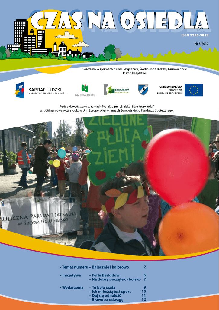 TEMAT NUMERU Bajecznie i kolorowo Uczestnicy III Parady Teatralnej w Śródmieściu Bielsko byli pod wrażeniem. Nie tylko dopisała pogoda, ale nastąpiła prawdziwa integracja międzypokoleniowa. Postronni obserwatorzy z zachwytem i błyskiem w oku obserwowali przemarsz radosnego tłumu, w którym znaleźli się zarówno ci młodsi, jak również i starsi mieszkańcy osiedla. Śmiało powiedzieć można, że było to wydarzenie roku na tym osiedlu. Przynajmniej tak powiedzą jego mieszkańcy. Pod szczególnym wrażeniem był Kazimierz Gańczarczyk, członek Rady Osiedla, który z uśmiechem na ustach przyznał: - To wspaniała inicjatywa. Cieszę się, że takie rzeczy mają miejsce u mnie na osiedlu. Osiedlu, w którym żyję i mieszkam od kilkudziesięciu lat - mówił pan Kazimierz. - Jednak najbardziej cieszy mnie ta wspólna akcja, ponad podziałami, bez względu na wiek. Dlatego zgłosiłem się do pomocy i dbam o bezpieczeństwo najmłodszych w czasie przemarszu - podkreślał. To bardzo dobry znak, że ludzie chętnie angażują się w podobne akcje. A także wynik programów, które są realizowane przez naszych pracowników socjalnych. Najbardziej cieszy jednak to, że zainteresowanie wykazują nie tylko dzieci i młodzież, ale również seniorzy - tłumaczyła Małgorzata Polak. Jednak Rada Osiedla, to nie jedyna organizacja, która była pod wrażeniem przedsięwzięcia od początku do końca wymyślonego przez pracowników socjalnych związanych z Programem Aktywności Lokalnej realizowanym przez Miejski Ośrodek Pomocy Społecznej. Do zachwytów dołączyły się także placówki oświatowe, które działają na terenie W jedności siła osiedla. - Przygotowaliśmy spektakl „Jesienny Koncert” Słowa seniora potwierdza pani Małgorzata Polak, mówiła z dumą pani Olga Kaulbert z Przedszkola z-ca dyrektora MOPS w Bielsku-Białej: nr 12. - W inicjatywie bierze udział coraz więcej osób. TEMAT NUMERU Postawili na teatr ciu? W każdym razie postanowiliśmy przygotować program specjalnie z myślą o potrzebach najmłodW wydarzeniu, które odbyło się 9 października szych - opowiadała tuż przez rozpoczęciem wydabieżącego roku, wzięli udział: wychowankowie rzenia Olga Bogumił, pracownik socjalny ds. PAL przedszkoli nr 11 i 12, SP nr 4 i 12, a także młodzież Śródmieście Bielsko. z Technikum Mechanicznego. Każde z nich przygotowało na tę okazję przedstawienie wokalno-te- Miesiące przygotowań atralne. Nie mogło także zabraknąć podopiecznych Teatru Grodzkiego w Bielsku-Białej, a także samych Warsztaty teatralne trwały kilka miesięcy, a popronajmłodszych przedstawicieli osiedla skupionych wadziła je znakomita aktorka i reżyserka Jadwiga wokół świetlicy socjoterapeutycznej Środowisko- Grudzińska. Zajęcia odbywały się w każdy czwarwego Centrum Pomocy przy placu Fabrycznym 1. tek w siedzibie świetlicy socjoterapeutycznej. To właśnie oni zadecydowali o formie warsztatów. Dzieci od podstaw zapoznały się z trudną sztuką - W 2011 roku przeprowadziliśmy wśród uczniów aktorską, na tyle, że już w październiku był gotowe szkół na Śródmieściu Bielsko ankietę. Zapytaliśmy na swój debiut. ich o to, jaka forma nauki czy warsztatów, najbar- Parada Teatralna przeszła spod Ratusza ulicami dziej by im odpowiadała. Wyniki nas zaskoczyły. Bielska-Białej do Teatru Polskiego, gdzie na małej Dzieci postawiły na teatr. Być może jest to wynik scenie, zaprezentowali się jej uczestnicy. Nie obyło poprzednich edycji parad teatralnych na Śródmieś- się bez łez wzruszenia i radości. Moja duma Punktem kulminacyjnym akcji była premiera „Śpiącej Królewny”. Bajki, w której wzięli udział mali aktorzy, a którzy ćwiczyli pod czujnym okiem wspaniałej Jadwigi Grudzińskiej. - Tam na scenie występuje mój wnuk. Jestem z niego bardzo dumny. Bardzo dużo ćwiczył, a teraz prezentuje się wspaniale - zdradził jeden z gości spektaklu, nie kryjąc łez. Podobnie zresztą jak mama chłopaka. - To są takie emocje, że nie sposób je wyrazić słowami. Dziękuję wszystkim tym, którzy przyczynili się do powstania idei integracji poprzez teatr - przytaknęła tacie. *** Parada jest organizowana w ramach Programu Aktywności Lokalnej dla osiedla Śródmieście Bielsko, będącego częścią projektu „Bielsko-Biała łączy ludzi”. Przygotowują ją wspólnie pracownicy MOPS zaangażowani w Program Aktywności Lokalnej oraz mieszczące się w Śródmieściu zaprzyjaźnione szkoły, przedszkola, placówki kulturalne i wychowawcze oraz jak zwykle niezawodny Teatr Grodzki. Dzięki wsparciu wymienionych instytucji III Uliczna Parada Teatralna była większa od poprzednich. W bezpiecznej organizacji pochodu w tym roku pomagali również seniorzy ze Śródmieścia. Projekt został zrealizowany w ramach Programu Aktywności Lokalnej dla osiedla Śródmieście Bielsko, który jest częścią projektu pn. „Bielsko-Biała łączy ludzi” współfinansowanego ze środków Unii Europejskiej. Foto: KGO, Ryszard Wesołowski INICJATYWA Perła Beskidów W samym sercu osiedla Śródmieście Bielsko tętni życiem Stowarzyszenie „Ewa-Maja-Krystyna. Kobiety dla kobiet”. Nie ulega wątpliwości, że organizacja pozarządowa jest ściśle związana z życiem osiedla. Widać to było na przykładzie III Regionalnego Kongresu Kobiet Podbeskidzia, na który licznie przybyły panie związane z lokalną przedsiębiorczością. Nie zabrakło również pracownika socjalnego, który realizuje Program Aktywności Lokalnej dla osiedla Śródmieście Bielsko, sygnowany przez Miejski Ośrodek Pomocy Społecznej w Bielsku-Białej. Praca u podstaw Babskie sprawy 22 września bieżącego roku poznaliśmy Perłę Podbeskidzia. Została nią góralka z Istebnej - pani Małgorzata Kiereś, etnografka i autorka książek o góralskich tradycjach, a zarazem szefowa Muzeum Beskidzkiego w Wiśle. - Kongres organizujemy po to, bo mamy swoje babskie sprawy, 