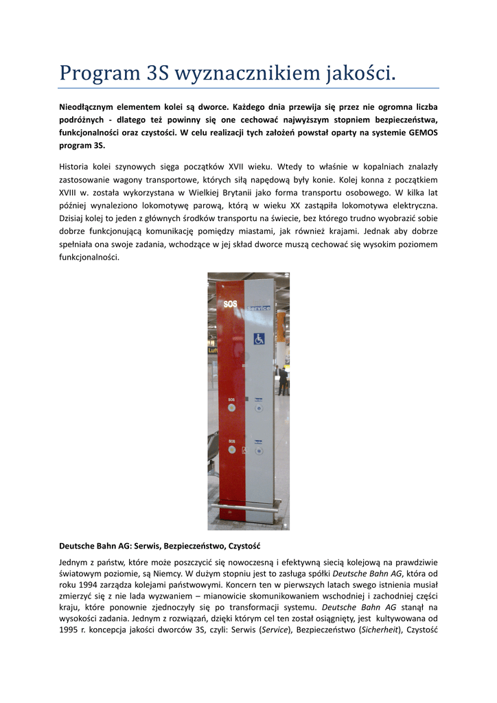 Nieodłącznym elementem kolei są dworce. Każdego dnia przewija się przez nie ogromna liczba podróżnych - dlatego też powinny się one cechować najwyższym stopniem bezpieczeństwa, funkcjonalności oraz czystości. W celu realizacji tych założeń powstał oparty na systemie GEMOS program 3S. Historia kolei szynowych sięga początków XVII wieku. Wtedy to właśnie w kopalniach znalazły zastosowanie wagony transportowe, których siłą napędową były konie. Kolej konna z początkiem XVIII w. została wykorzystana w Wielkiej Brytanii jako forma transportu osobowego. W kilka lat później wynaleziono lokomotywę parową, którą w wieku XX zastąpiła lokomotywa elektryczna. Dzisiaj kolej to jeden z głównych środków transportu na świecie, bez którego trudno wyobrazić sobie dobrze funkcjonującą komunikację pomiędzy miastami, jak również krajami. Jednak aby dobrze spełniała ona swoje zadania, wchodzące w jej skład dworce muszą cechować się wysokim poziomem funkcjonalności. Deutsche Bahn AG: Serwis, Bezpieczeństwo, Czystość Jednym z państw, które może poszczycić się nowoczesną i efektywną siecią kolejową na prawdziwie światowym poziomie, są Niemcy. W dużym stopniu jest to zasługa spółki Deutsche Bahn AG, która od roku 1994 zarządza kolejami państwowymi. Koncern ten w pierwszych latach swego istnienia musiał zmierzyć się z nie lada wyzwaniem – mianowicie skomunikowaniem wschodniej i zachodniej części kraju, które ponownie zjednoczyły się po transformacji systemu. Deutsche Bahn AG stanął na wysokości zadania. Jednym z rozwiązań, dzięki którym cel ten został osiągnięty, jest kultywowana od 1995 r. koncepcja jakości dworców 3S, czyli: Serwis (Service), Bezpieczeństwo (Sicherheit), Czystość (Sauberkeit). Program ten pozwala na utrzymanie wysokich standardów, które w Niemczech stawiane są jako nadrzędny cel. Ich zadaniem jest m.in. zapewnienie obywatelom jak największego komfortu życia publicznego. 13 lat świetności dworca w Lipsku Sztandarowym przykładem realizacji koncepcji 3S jest dworzec w Lipsku. Wraz z jego renowacją, która miała miejsce w 1999 r., zostały mu nadane najwyższe standardy w kategorii użyteczności oraz bezpieczeństwa. W idei programu 3S obiekt został wyposażony w innowacyjny system, dzięki któremu zarządzanie nim i jego otoczeniem stało się maksymalnie funkcjonalne oraz efektywne. Mimo, że od wdrożenia systemu upłynęło 13 lat, dworzec wciąż charakteryzuje się tą samą, wysoką jakością do dzisiaj. To dlatego, iż jednym z założeń programu 3S jest ciągłość jego udoskonalania. Doskonałość 3S oparta na Systemie GEMOS Program 3S może prawidłowo funkcjonować na dworcu w Lipsku dzięki integracji poszczególnych systemów. Mózgiem, który nimi steruje, jest centrala SMS, czyli Station Management System. Została ona stworzona na bazie systemu GEMoS, pochodzącego od producenta Ela-Soft z Berlina. System GEMoS pozwolił na integrację: • Urządzeń technicznych budynku. Pozwala na integrację urządzeń pochodzących od różnych producentów. • Systemu sygnalizacji alarmu pożarowego. W przypadku zarządzenia alarmu system GEMoS sygnalizuje o nim użytkowników obiektu poprzez nagłośnienie. • Systemu monitoringu. Wszystkie strefy obiektu oraz jego otoczenia znajdują się pod nadzorem kamer, które przekazują obraz do centrali - dzięki temu w sytuacji zagrożenia służby dworca mogą w szybkim czasie zainterweniować. Gromadzony materiał video posłużyć może także do ustalenia faktów danego zdarzenia bądź jako materiał dowodowy. • Systemu komunikacji. Dzięki zastosowaniu wewnętrznej sieci interkomu zapewnia on łączność kierownictwa, służb bezpieczeństwa oraz pracowników serwisu. Elementem systemu, który również wpływa na bezpieczeństwo podróżnych, są tzw. kolumny komunikacyjne, wyposażone w przycisk ratunkowy. Wciśnięcie przycisku powoduje natychmiastowe przybycie pomocy, jak również naprowadzenie kamer na miejsce zdarzenia. System GEMoS został wyposażony w elektroniczną bazę danych, w której gromadzi informację o wszelkich działaniach, umożliwiając ich protokołowanie oraz analizę. Dzięki systemowi GEMoS system bezpieczeństwa dworca w Lipsku stanowi integralną całość, co pozwala na jego sprawne zarządzanie, co w z kolei przekłada się na eliminację zagrożeń. oparty na nim program 3S pozwala także na efektywne zarządzanie personelem, który odpowiada za utrzymywanie czystości i serwis. System GEMOS - rozwiązanie na lata Dworzec w Lipsku cieszy się niezawodnym systemem bezpieczeństwa od 13 lat. To dlatego, iż system GEMoS, jaki stanowi bazę centrali SMS, już w momencie wdrożenia w 1999 r. dawał możliwość podłączenia każdego innego systemu, niezależnie od jego marki. To m. in. dlatego władze koncernu Deutsche Bahn AG wybrały go spośród obszernej oferty, jaką tamtego czasu otrzymały. - GEMOS już w swojej pierwszej wersji był tak przemyślany, aby możliwe było podłączenie do niego central wszelkiego typu i dowolnego producenta za pomocą odpowiednich interfejsów komunikacyjnych - powiedział po realizacji projektu na dworcu w Lipsku mgr inż. dypl. Michael Klitsch, jeden z ówczesnych szefów Ela-Soft. System GEMoS okazał się doskonałym rozwiązaniem - władze Deutsche Bahn AG zarządziły jego wdrożenie także na innych dworcach, m.in. w Monachium, Berlinie, gdzie zapewnia on bezpieczeństwo do dziś. Instalacji systemu dokonano również na wielu stacjach metra na terenie całych Niemiec. Ten spektakularny sukces świadczy o wysokiej klasie rozwiązania. GEMOS standardem obiektów w Polsce System GEMoS został doceniony nie tylko w Niemczech, lecz także i w Polsce, gdzie stał się standardem wyposażenia wszelkich centrów komunikacyjnych, takich jak lotniska czy dworce kolejowe. Polscy inwestorzy coraz częściej stawiają na nowoczesne technologie, które za