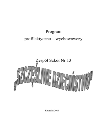 Program profilaktyczno – wychowawczy Zespół Szkół Nr 13 Koszalin 2014 1 Sukces w życiu zależy nie tylko od intelektu, lecz od umiejętności kierowania emocjami. Daniel Goleman 2 MIEJSCE REALIZACJI Realizacja programu będzie się odbywać w Zespole Szkół Nr 13 w Koszalinie w klasie zerowej. Placówka ta jest położona na peryferiach miasta, w dzielnicy rodzin bezrobotnych i w wielu przypadkach o niskim statusie społecznym. Kierując się potrzebami dzieci zorganizowano zajęcia dodatkowe z języka angielskiego, rytmiki oraz religii. 1 UKAZANIE PROBLEMU Żyjemy w czasach, kiedy coraz szybciej ulegają rozregulowaniu normy społeczne, coraz bardziej rwą się splatające ludzi więzi, a egoizm, przemoc i bezduszność rozkładają dobra wspólnej egzystencji. Rozpowszechnienie się postaw konsumpcyjnych, egoistycznych, agresywnych stały się przyczyną poważnych problemów społecznych. Ale również faktami stają się rozmaite formy agresji przejawiające się w kontaktach interpersonalnych (w rodzinie, przedszkolu, szkole,, na podwórku czy ulicy). Uwagę społeczną absorbują sygnały o nasilających się przejawach patologii. Zdumienie budzi zachowanie naszej młodzieży, która coraz częściej ma problemy z nawiązaniem kontaktu z rodzicami, wychowawcami. W tej sytuacji zrozumiałe jest zaniepokojenie społeczne i poszukiwanie trafnych rozwiązań. Jak tego dokonać? Czy w związku z tym należy zwiększyć poziom rygoryzmu, surowości, czy zastosować inne metody wychowawcze? Wszyscy na ogół przekonani są o znaczeniu wychowania. Widząc w nim rękojmię przyszłego kształtu życia indywidualnego i społecznego. Szeroko dyskutuje się, kto i w jakim zakresie jest odpowiedzialny za wychowanie, podkreśla się znaczenie rodziny, przedszkola, szkoły, organizacji 3 i kultury masowej w tym procesie. Powszechnie sądzi się, że jeśli się zapewni odpowiednie warunki oraz zastosuje właściwe metody wychowawcze, to można oczekiwać, iż przyszłe społeczeństwo, złożone z dzisiejszej młodzieży, będzie potrafiło wypełniać swoje zadania i kierować naszym życiem społecznym, w tej postawie wyraża się przekonanie o szczególnej mocy wychowania1. Ważnym zagadnieniem jest nowe spojrzenie na zadania przedszkola, szkoły i innych instytucji, na to, co mogą one zrobić by wychowywać i ukształtować całego człowieka, zajmując się jednocześnie jego umysłem i sercem. Potrzebujemy nowej generacji rodziców i nauczycieli, która zaakceptuje wezwanie do przyswojenia sobie wiedzy i umiejętności niezbędnych dla wychowania dzieci, świadomych swej odpowiedzialności. W rodzinie, bowiem jest miejsce gdzie wszystko się zaczyna. Niech wychowanie stanie się wymianą informacji między wychowującym, a wychowankiem, co jest wykładnią wychowania partnerskiego – nie tylko mówię do Ciebie, ale również Ty mówisz do mnie. Nie tylko Ty masz słuchać mnie, ale ja również słucham uważnie Ciebie. Bo wychowanie to droga od konfliktu do konfliktu – rozwiązywać możemy je tylko wtedy, gdy ze sobą rozmawiamy. W wychowaniu ważna jest adekwatność postaw i słów. Jeśli mówię ci, że tak masz postępować to popatrz jak ja postępuję. My dorośli różnimy się między sobą i dzieci też się różnią. Każdy człowiek jest niepowtarzalny, jest zlepkiem talentów, możliwości, intelektu, nośników genetycznych. Stąd nie można tworzyć jednej sztywnej metody wychowania. Jest to dziedzina, w której trzeba być twórczym. Społeczeństwa się zmieniają, zmieniają się realia życia i sztuką jest wychowywać nowe pokolenia dla przyszłości, a to wymaga dużej otwartości i odwagi w podejmowaniu ryzykownych działań . 1 T. Kukułowicz. Pomagamy w samowychowaniu. Warszawa 1978, s. 6. 4 ZAŁOŻENIA DYDAKTYCZNO – WYCHOWAWCZE 1 IDEA PROGRAMU Drogą wiodącą do sukcesu w wychowaniu jest akceptacja. Dzieci potrzebują, aby zająć się ich lękami, frustracjami, wybuchami gniewu, kłopotami 2. Znajomość procesu komunikowania interpersonalnego może w istotnym stopniu poprawić poziom wzajemnego zrozumienia się ludzi, a tym samym zmniejszyć ilość konfliktów, spięć i konfrontacji. Zasadne jest przekonanie, że większość konfliktów powodowana jest nieumiejętnością prowadzenia skutecznej komunikacji międzyludzkiej3. Zastosowanie tych metod przynosi pożądane efekty. Warto, więc je poznać i zachęcić innych do ich wykorzystania podczas pracy wychowawczej Praca pedagoga to ciągłe przekraczanie granic, norm hamujących rozwój zarówno nauczyciela jak i dziecka. Nauczyciel musi mieć świadomość odpowiedzialności, jaka na niego spada w zakresie rozwoju dziecka, tak, aby mu nie szkodzić, ale wspierać je, nieustannie pomagać mu wciąż na nowo odkrywać świat i wszelkie przejawy jego piękna4. Osiągnięcie przez jednostkę pełnej dojrzałości emocjonalnej jest procesem długotrwałym i nie każdy człowiek dojrzałość tę osiąga. Jeżeli rozwój emocjonalny we wczesnym dzieciństwie przebiega bez zakłóceń, można oczekiwać dalszego prawidłowego kształtowania się uczuć. Podstawa programowa wychowania przedszkolnego dla przedszkoli i oddziałów przedszkolnych w szkołach podstawowych (Rozporządzenie MEN z dnia 1 grudnia 1999 roku poz. 18 Dz. U. Nr 2 z 2000 roku) obejmuje wspomaganie rozwoju i wczesną edukację dzieci od trzeciego roku życia do 2 A. Bejan. E. Lesiuk. Metody Thomsona Gordona. „Gazeta Szkolna” 2002 nr 4. Z. Nęcki. Komunikacja międzyludzka. Kraków 1996, s. 3. 4 U. Szuścik. Perspektywa psychologiczna w edukacji plastycznej dziecka (w:) Przemiany w naukach o wychowaniu – idee, koncepcje, rzeczywistość edukacyjna.. Red. W. Korzeniewska. Kraków 2002 „Impuls”, s. 319. 3 5 rozpoczęcia nauki w klasie pierwszej szkoły podstawowej. Placówki przedszkolne zapewniają opiekę, wychowanie i uczenie się w atmosferze akceptacji i bezpieczeństwa jednak częściej nauczyciele koncentrują się
