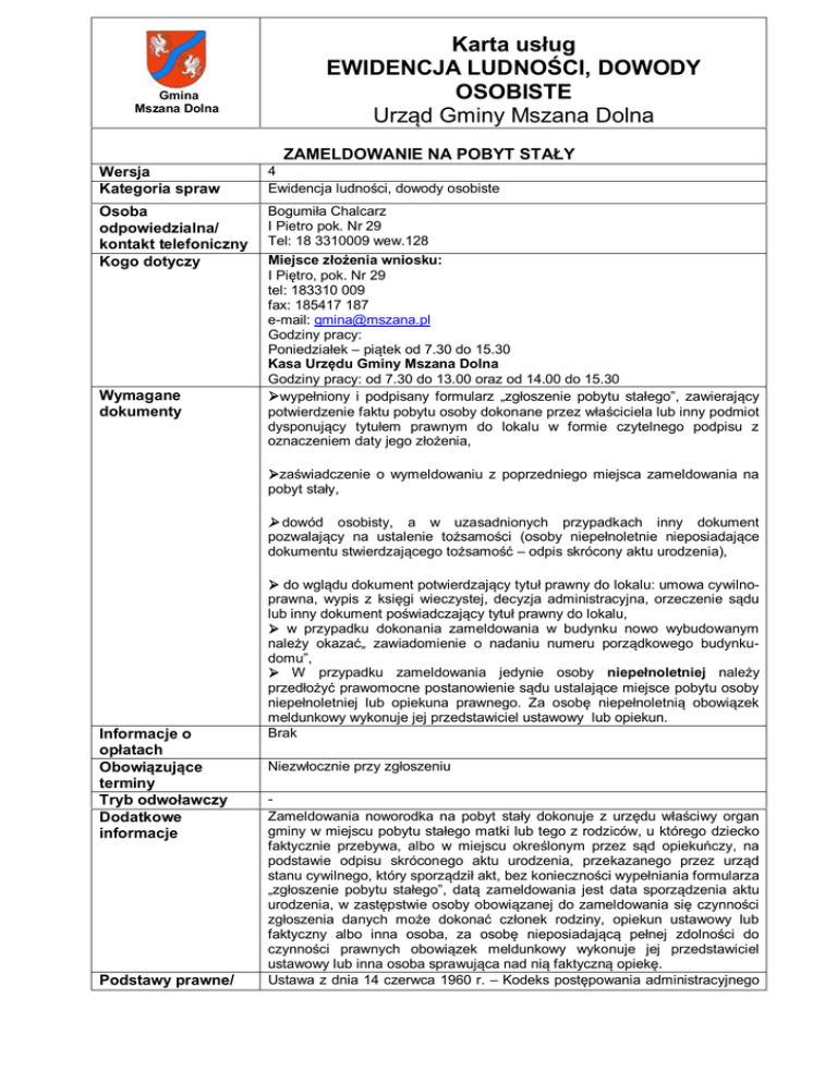 Gmina Mszana Dolna Karta usług EWIDENCJA LUDNOŚCI, DOWODY OSOBISTE Urząd Gminy Mszana Dolna ZAMELDOWANIE NA POBYT STAŁY Wersja Kategoria spraw 4 Ewidencja ludności, dowody osobiste Osoba odpowiedzialna/ kontakt telefoniczny Kogo dotyczy Bogumiła Chalcarz I Pietro pok. Nr 29 Tel: 18 3310009 wew.128 Wymagane dokumenty Miejsce złożenia wniosku: I Piętro, pok. Nr 29 tel: 183310 009 fax: 185417 187 e-mail: [email protected] Godziny pracy: Poniedziałek – piątek od 7.30 do 15.30 Kasa Urzędu Gminy Mszana Dolna Godziny pracy: od 7.30 do 13.00 oraz od 14.00 do 15.30 Øwypełniony i podpisany formularz „zgłoszenie pobytu stałego”, zawierający potwierdzenie faktu pobytu osoby dokonane przez właściciela lub inny podmiot dysponujący tytułem prawnym do lokalu w formie czytelnego podpisu z oznaczeniem daty jego złożenia, Øzaświadczenie o wymeldowaniu z poprzedniego miejsca zameldowania na pobyt stały, Ødowód osobisty, a w uzasadnionych przypadkach inny dokument pozwalający na ustalenie tożsamości (osoby niepełnoletnie nieposiadające dokumentu stwierdzającego tożsamość – odpis skrócony aktu urodzenia), Informacje o opłatach Obowiązujące terminy Tryb odwoławczy Dodatkowe informacje Podstawy prawne/ Ø do wglądu dokument potwierdzający tytuł prawny do lokalu: umowa cywilnoprawna, wypis z księgi wieczystej, decyzja administracyjna, orzeczenie sądu lub inny dokument poświadczający tytuł prawny do lokalu, Ø w przypadku dokonania zameldowania w budynku nowo wybudowanym należy okazać„ zawiadomienie o nadaniu numeru porządkowego budynkudomu”, Ø W przypadku zameldowania jedynie osoby niepełnoletniej należy przedłożyć prawomocne postanowienie sądu ustalające miejsce pobytu osoby niepełnoletniej lub opiekuna prawnego. Za osobę niepełnoletnią obowiązek meldunkowy wykonuje jej przedstawiciel ustawowy lub opiekun. Brak Niezwłocznie przy zgłoszeniu Zameldowania noworodka na pobyt stały dokonuje z urzędu właściwy organ gminy w miejscu pobytu stałego matki lub tego z rodziców, u którego dziecko faktycznie przebywa, albo w miejscu określonym przez sąd opiekuńczy, na podstawie odpisu skróconego aktu urodzenia, przekazanego przez urząd stanu cywilnego, który sporządził akt, bez konieczności wypełniania formularza „zgłoszenie pobytu stałego”, datą zameldowania jest data sporządzenia aktu urodzenia, w zastępstwie osoby obowiązanej do zameldowania się czynności zgłoszenia danych może dokonać członek rodziny, opiekun ustawowy lub faktyczny albo inna osoba, za osobę nieposiadającą pełnej zdolności do czynności prawnych obowiązek meldunkowy wykonuje jej przedstawiciel ustawowy lub inna osoba sprawująca nad nią faktyczną opiekę. Ustawa z dnia 14 czerwca 1960 r. – Kodeks postępowania administracyjnego procedury (tekst jednolity: Dz. U. z 2000 r. Nr 98, poz. 1071 z późn. zm.), Ustawa z dnia 10 kwietnia 1974 r. o ewidencji ludności i dowodach osobistych (tekst jednolity: Dz. U. z 2006 r. Nr 139, poz. 993 z późn. zm.).Rozporządzenie Ministra Spraw Wewnętrznych i Administracji z dnia 27 grudnia 2010 r. w sprawie zgłaszania i przyjmowania danych niezbędnych do zameldowania i wymeldowania oraz prowadzenia ewidencji ludności i ewidencji wydanych i unieważnionych dowodów osobistych (Dz. U. Nr 257, poz. 1743). Sporządził/a: Marta Wcisło, Podinspektor ds. obsługi klienta Zatwierdził/a: Bogumiła Chalcarz, Inspektor ds. ewidencji ludności